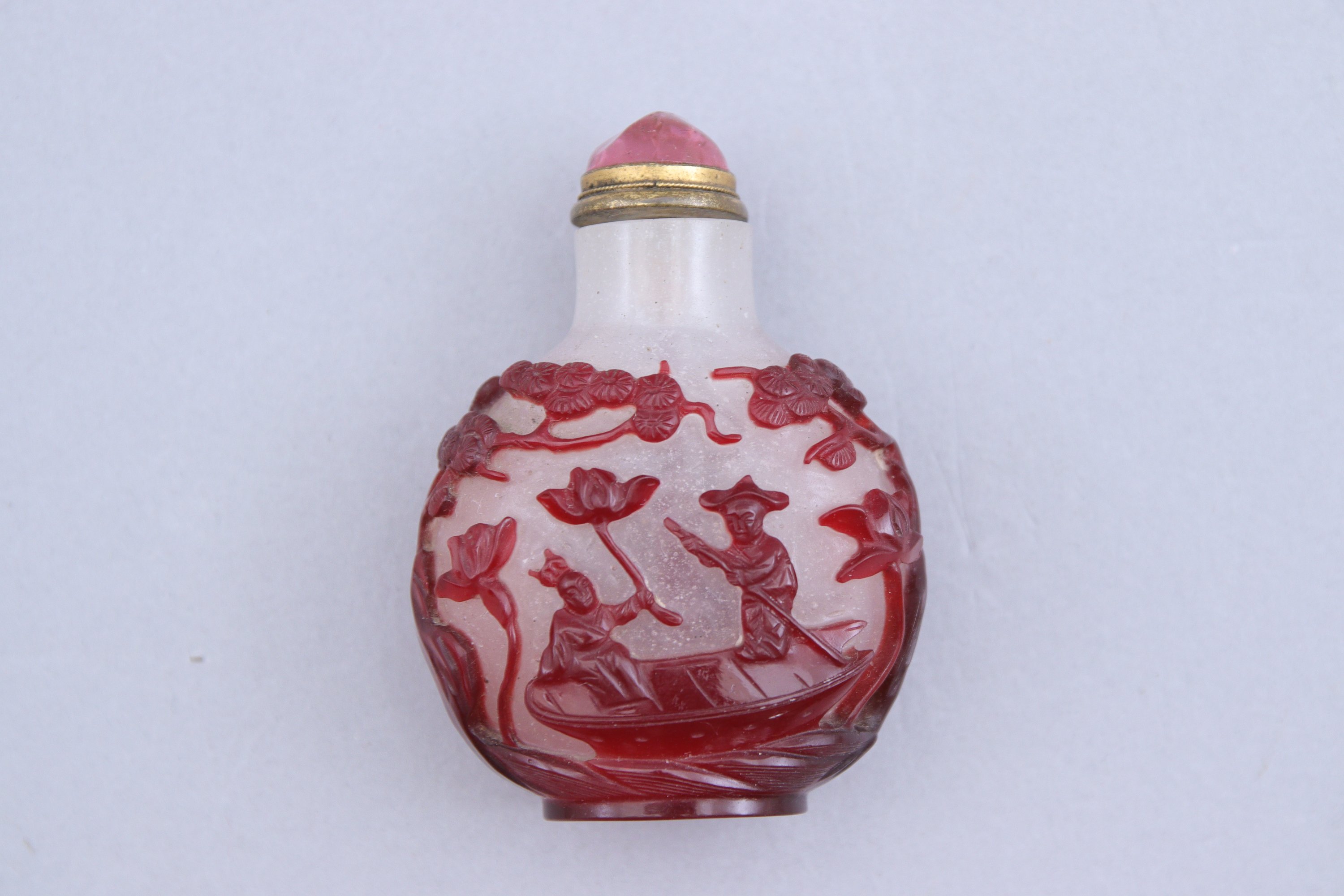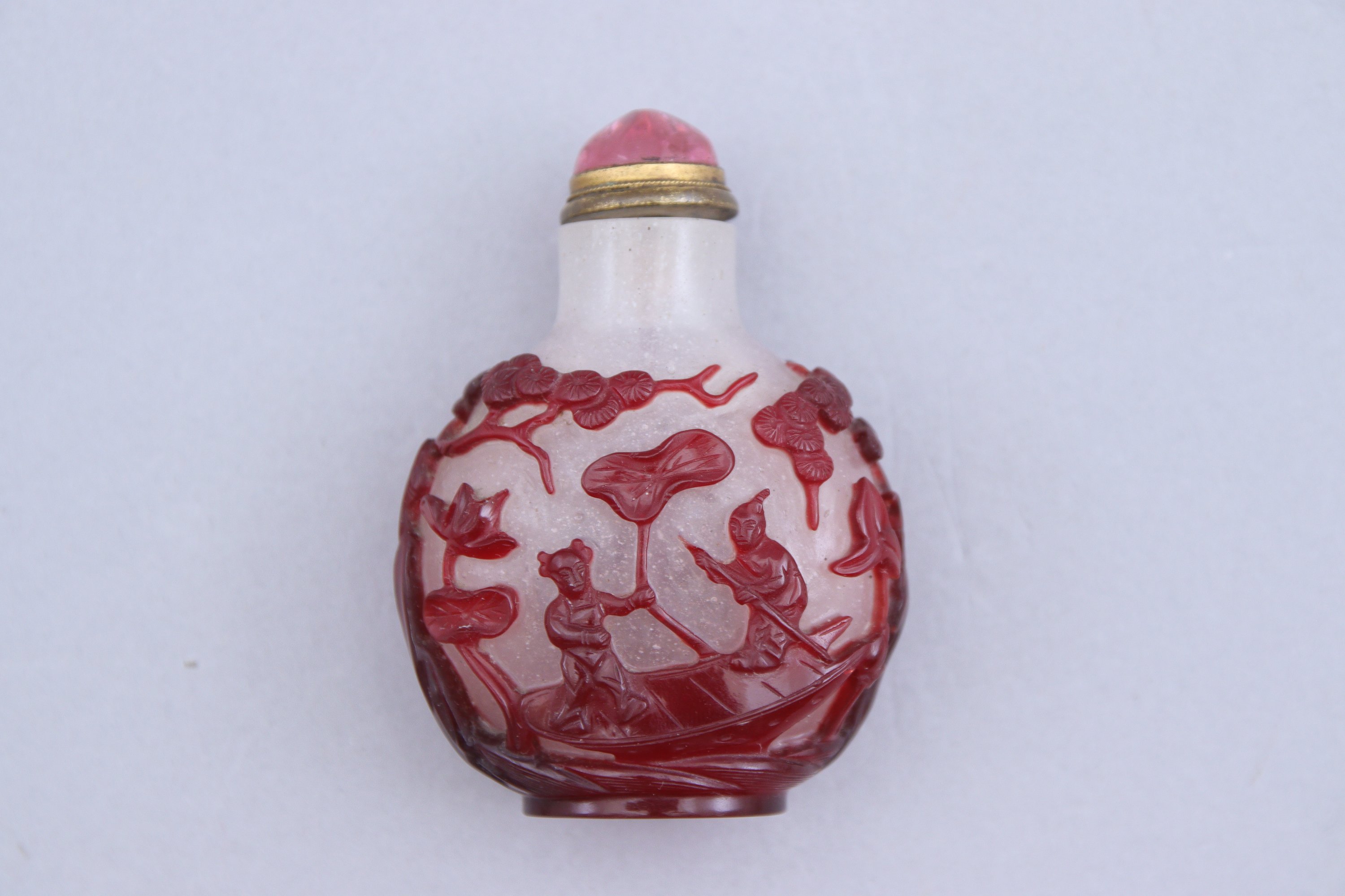 en verre translucide à bulles décoré en overlay rouge de deux enfants dans une barque tenant une branche de lotus.