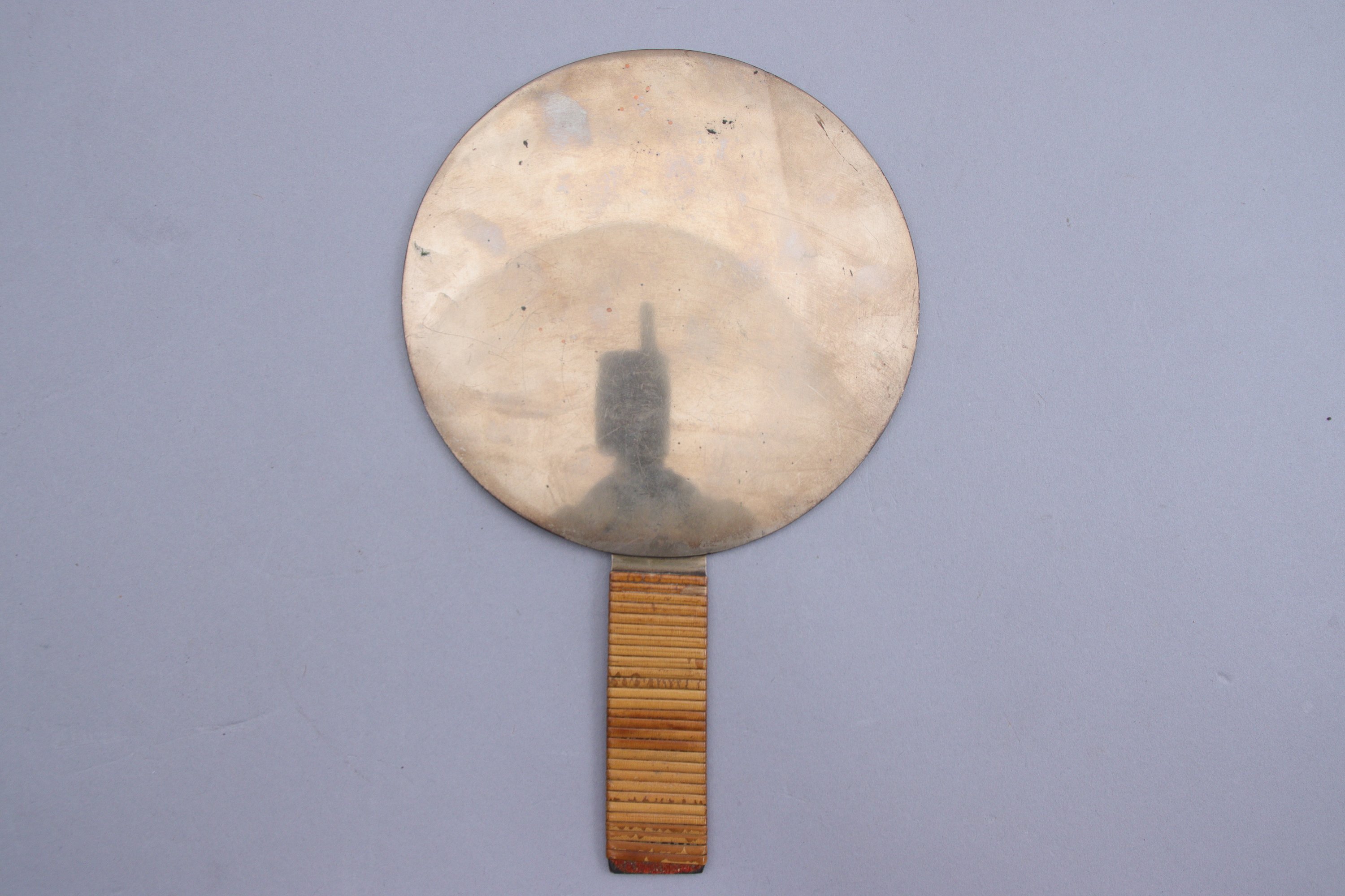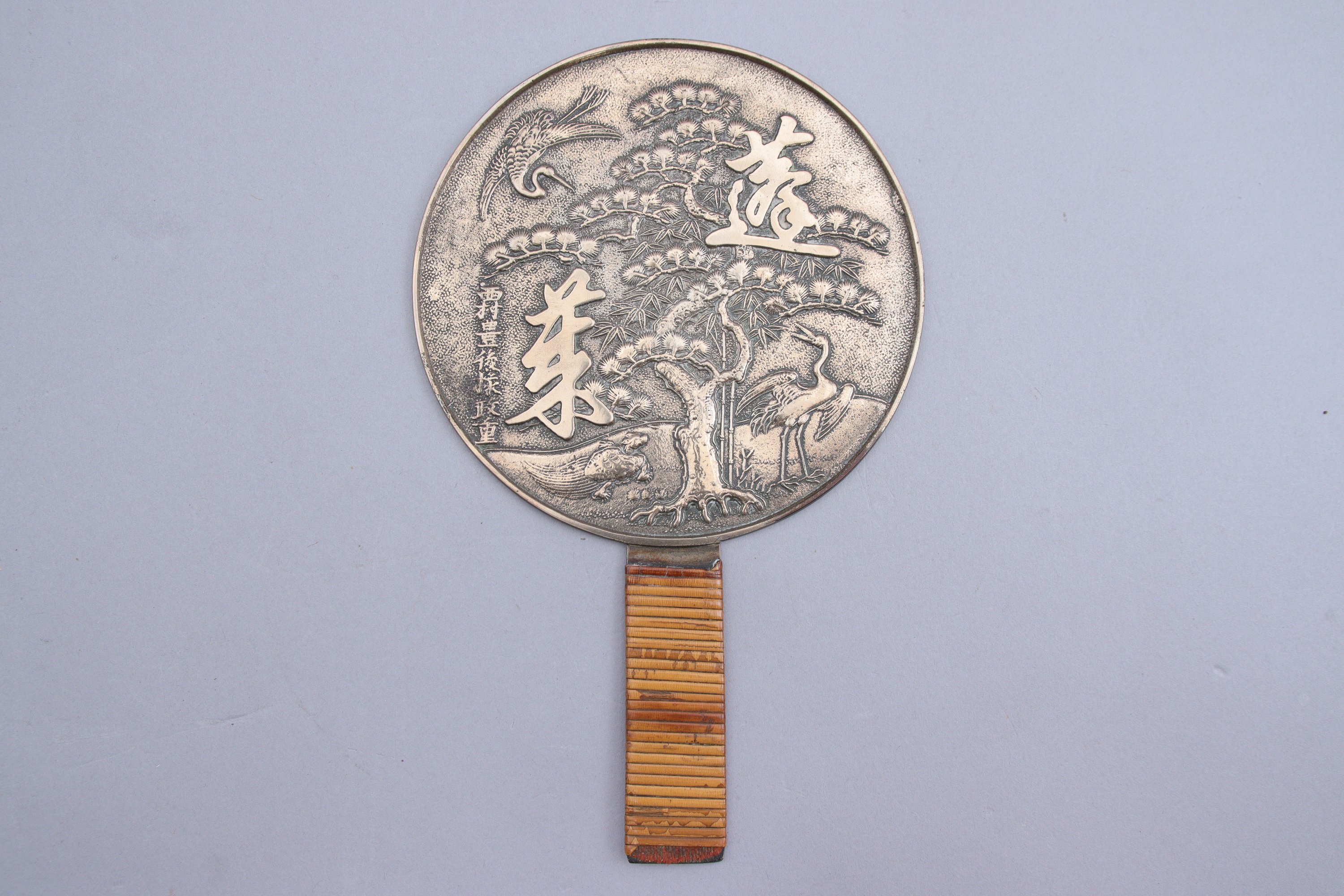 Joint : Japon, XXe. Un miroir à manche en bronze argenté à décor de grues parmi les pins signé Masashige. Long. 23,5 cm. (petit manque de rotin au bout de la poignée).