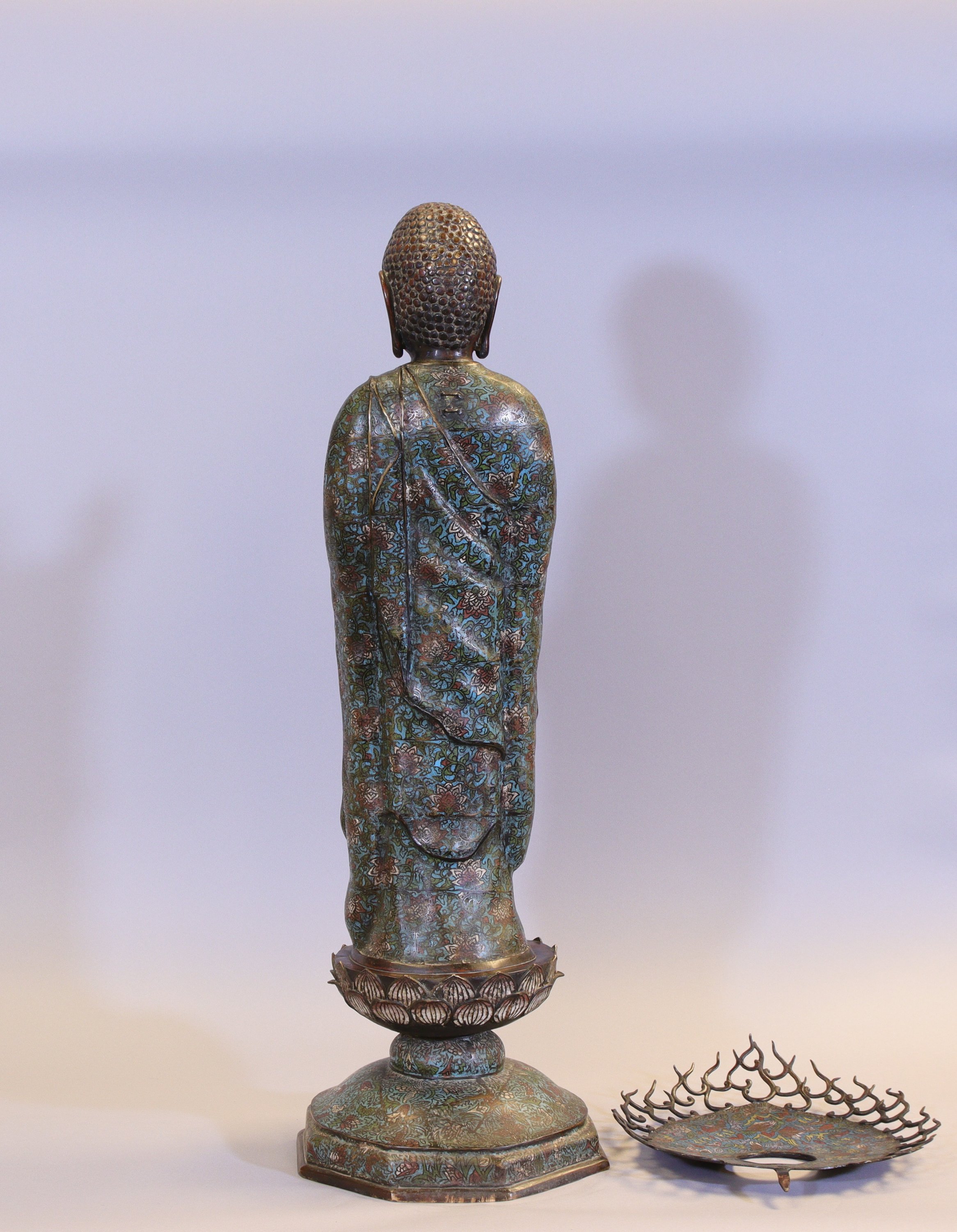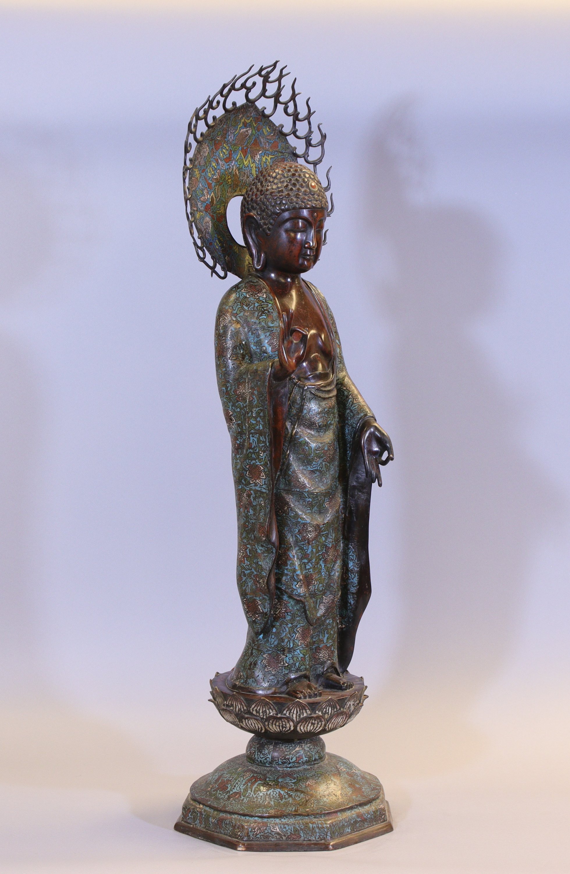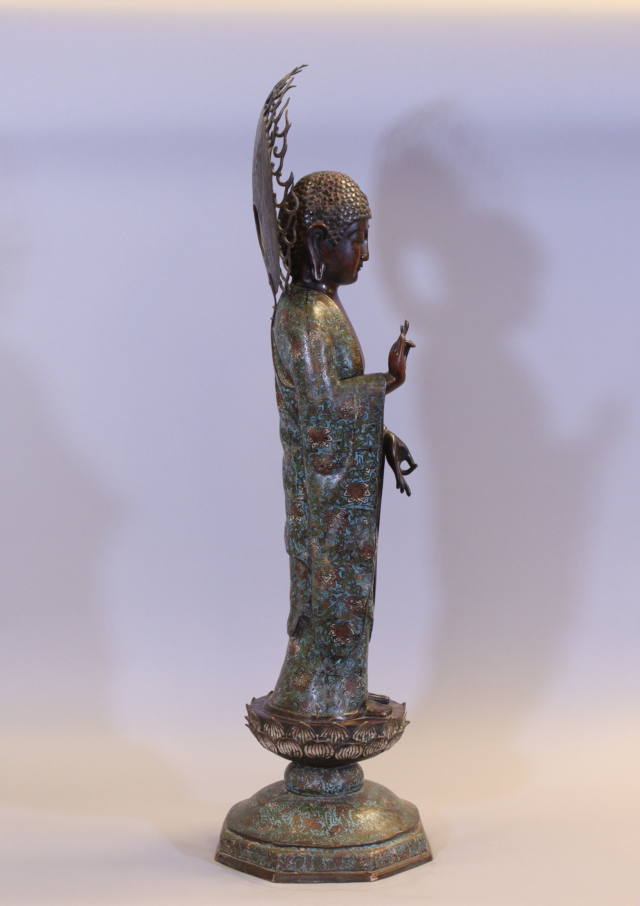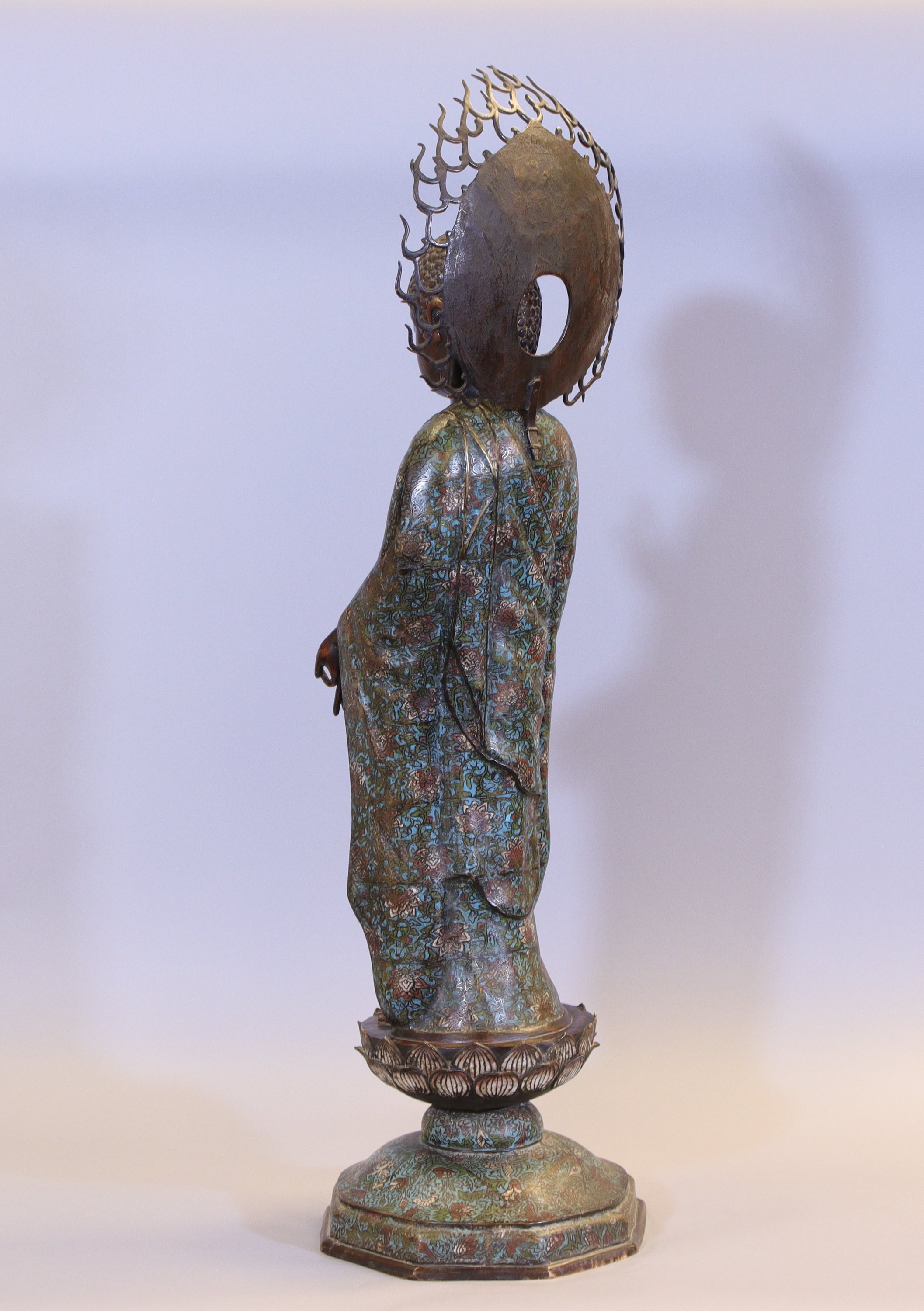en bronze à patine brune et émaux cloisonnés, debout sur un socle en forme de lotus devant une mandorle.