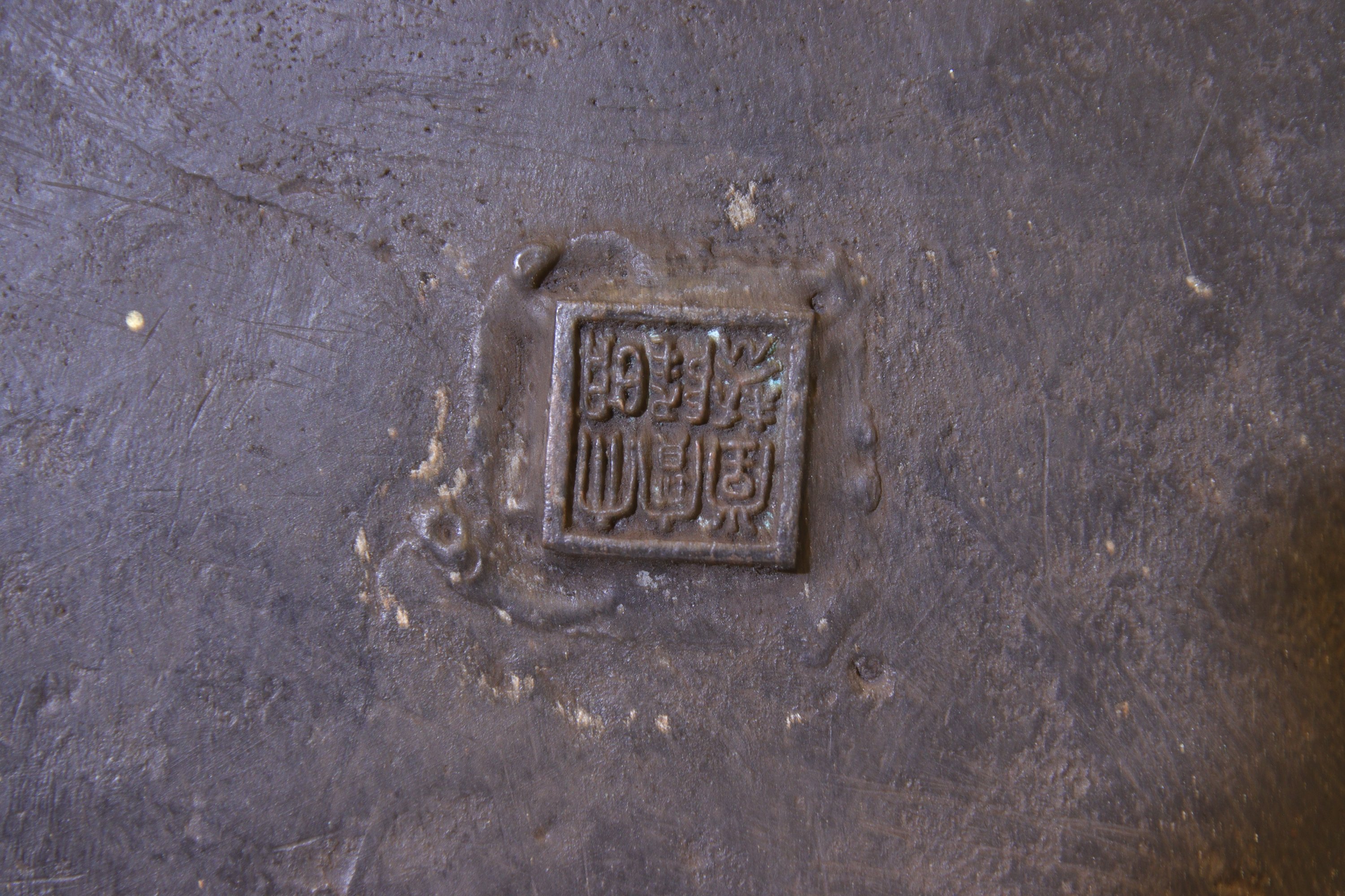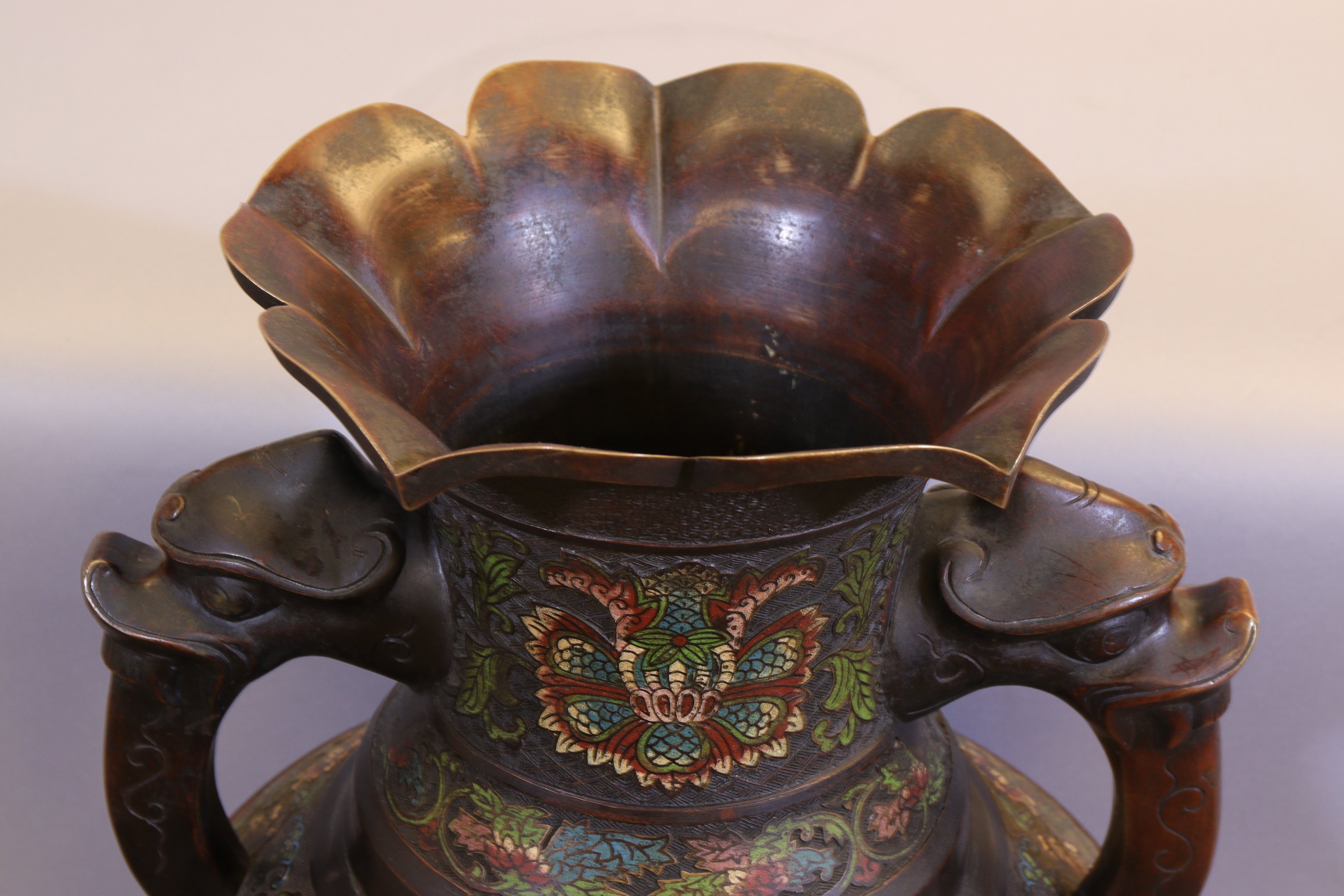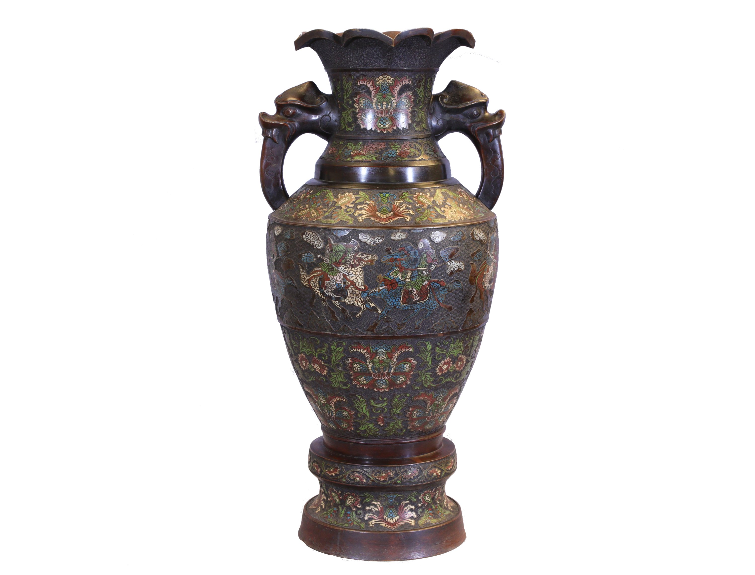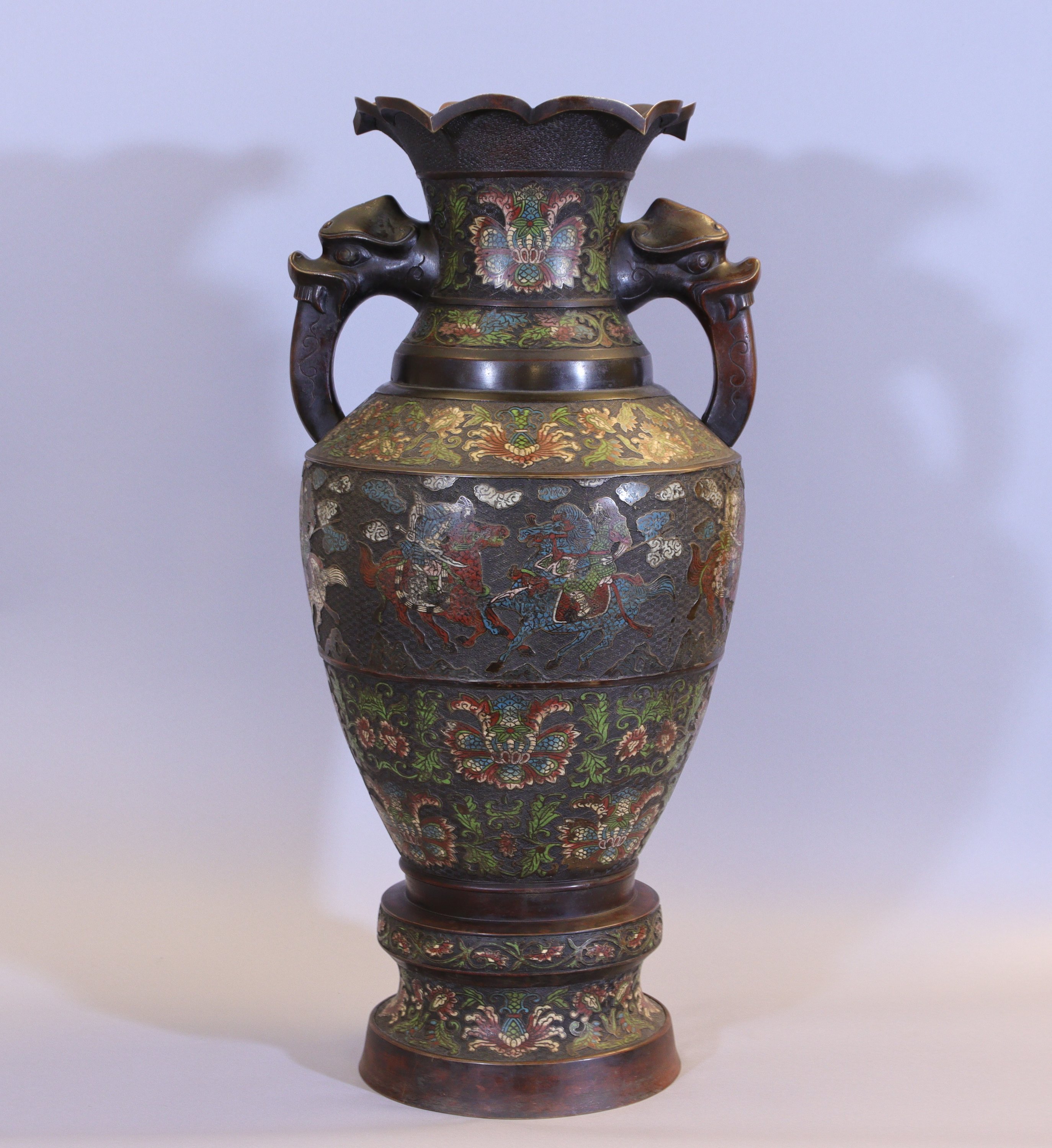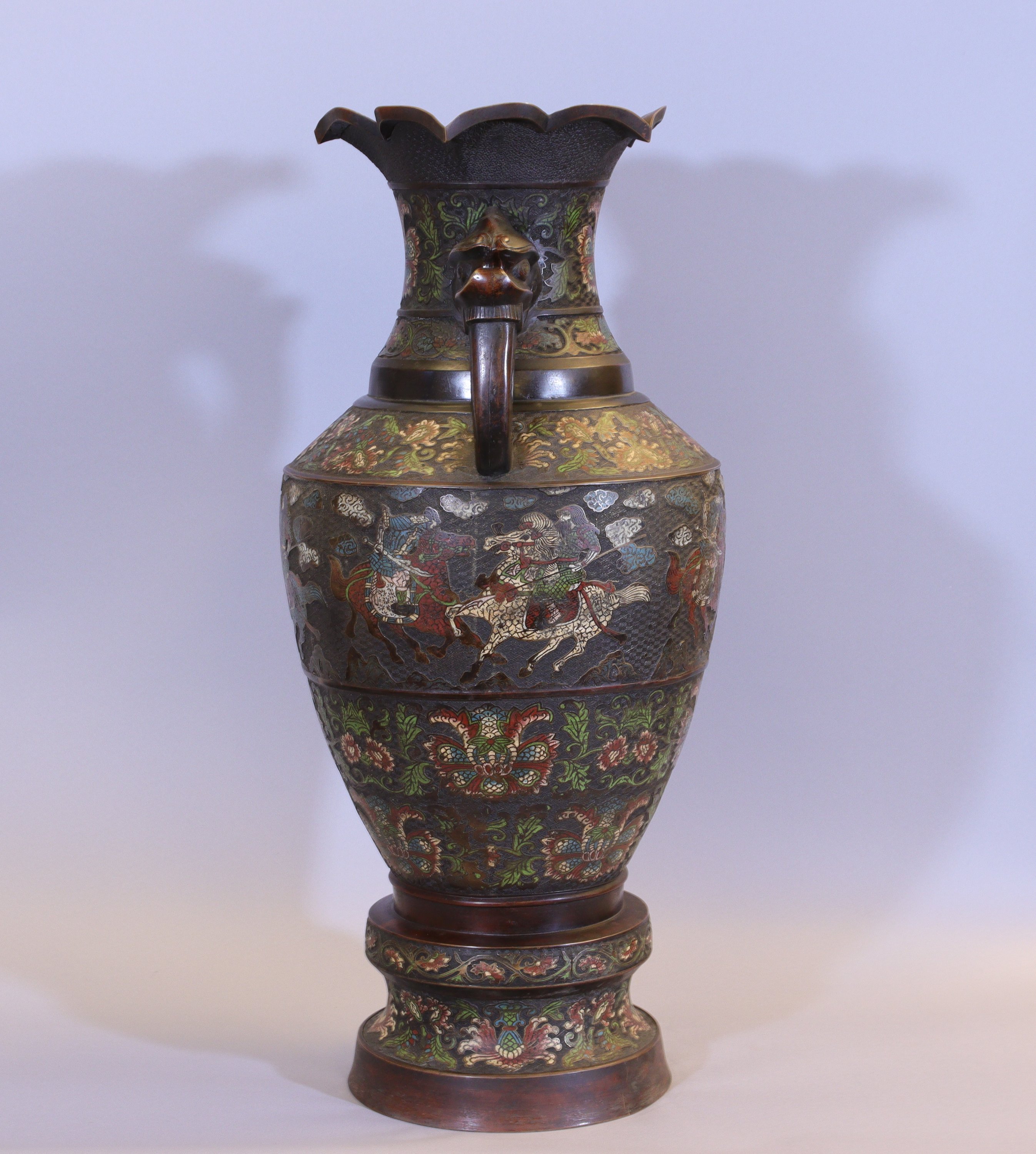 en bronze à patine brune et émaux cloisonnés, à décor d'une scène de guerriers à cheval entourés de frises de lotus stylisés dans leur feuillage. Deux anses en forme de têtes de lions.