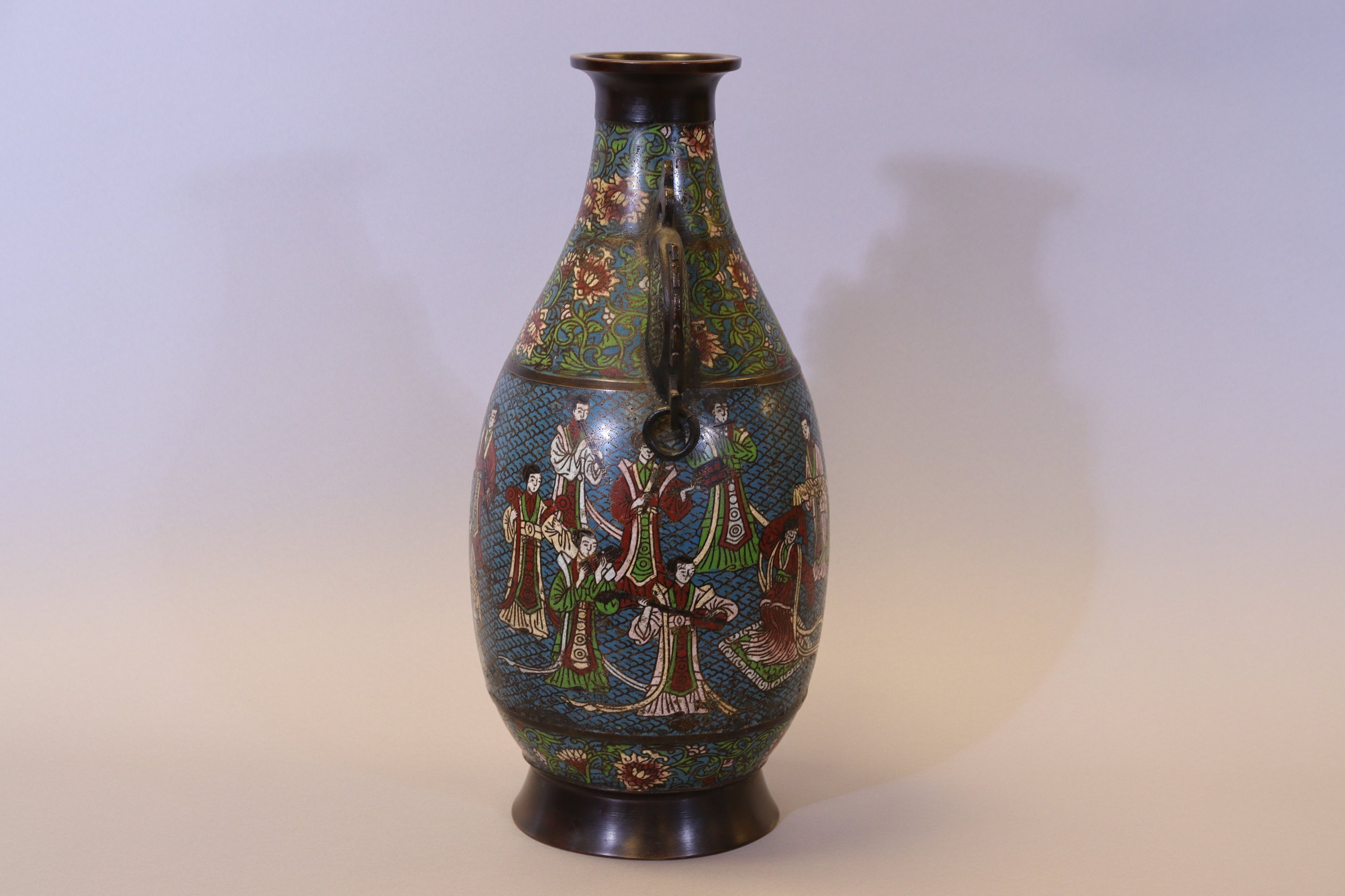 en bronze à patine brune et émaux cloisonnés, à décor de jeunes musiciennes debout surmontées d'une frise de lotus dans leur feuillage.