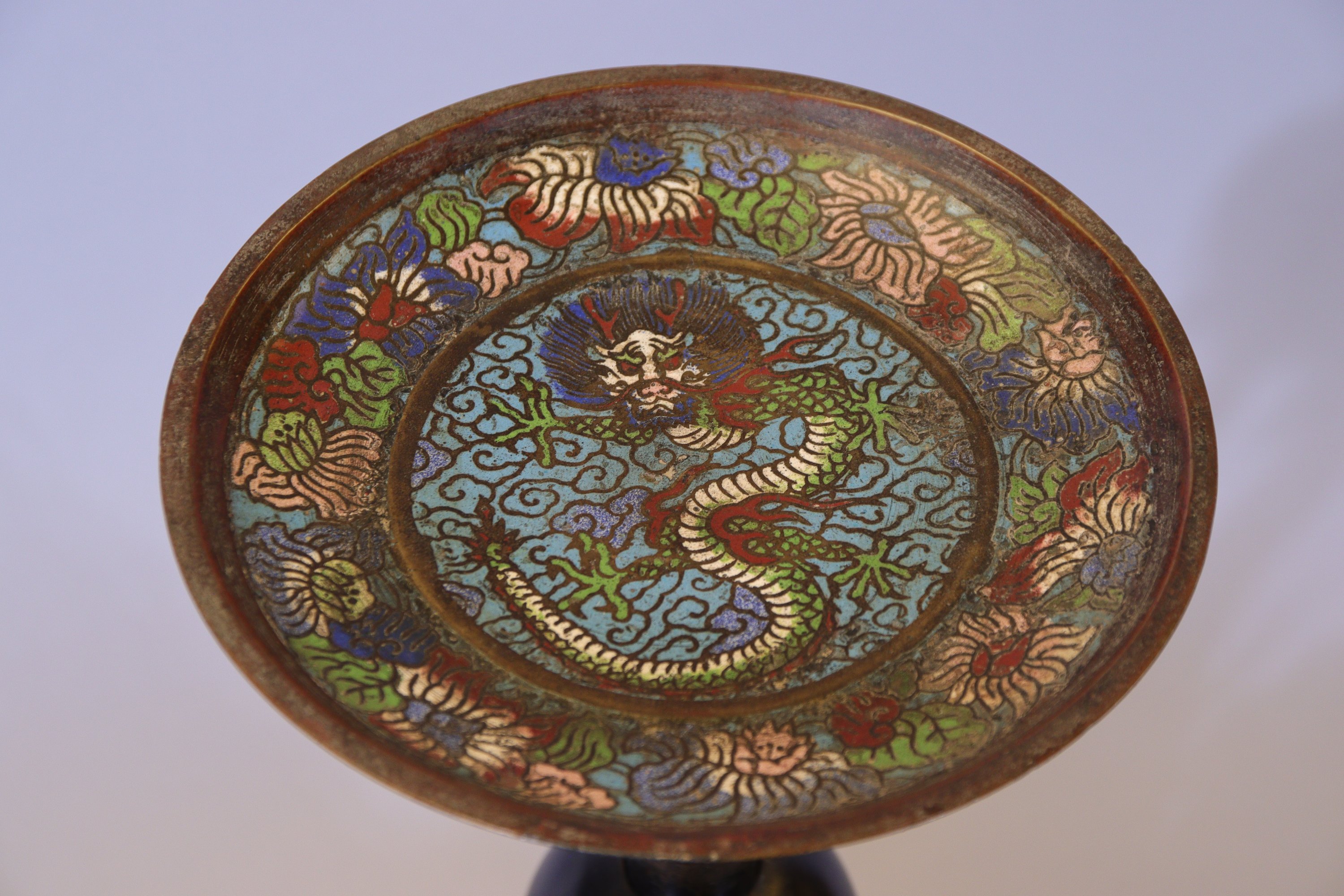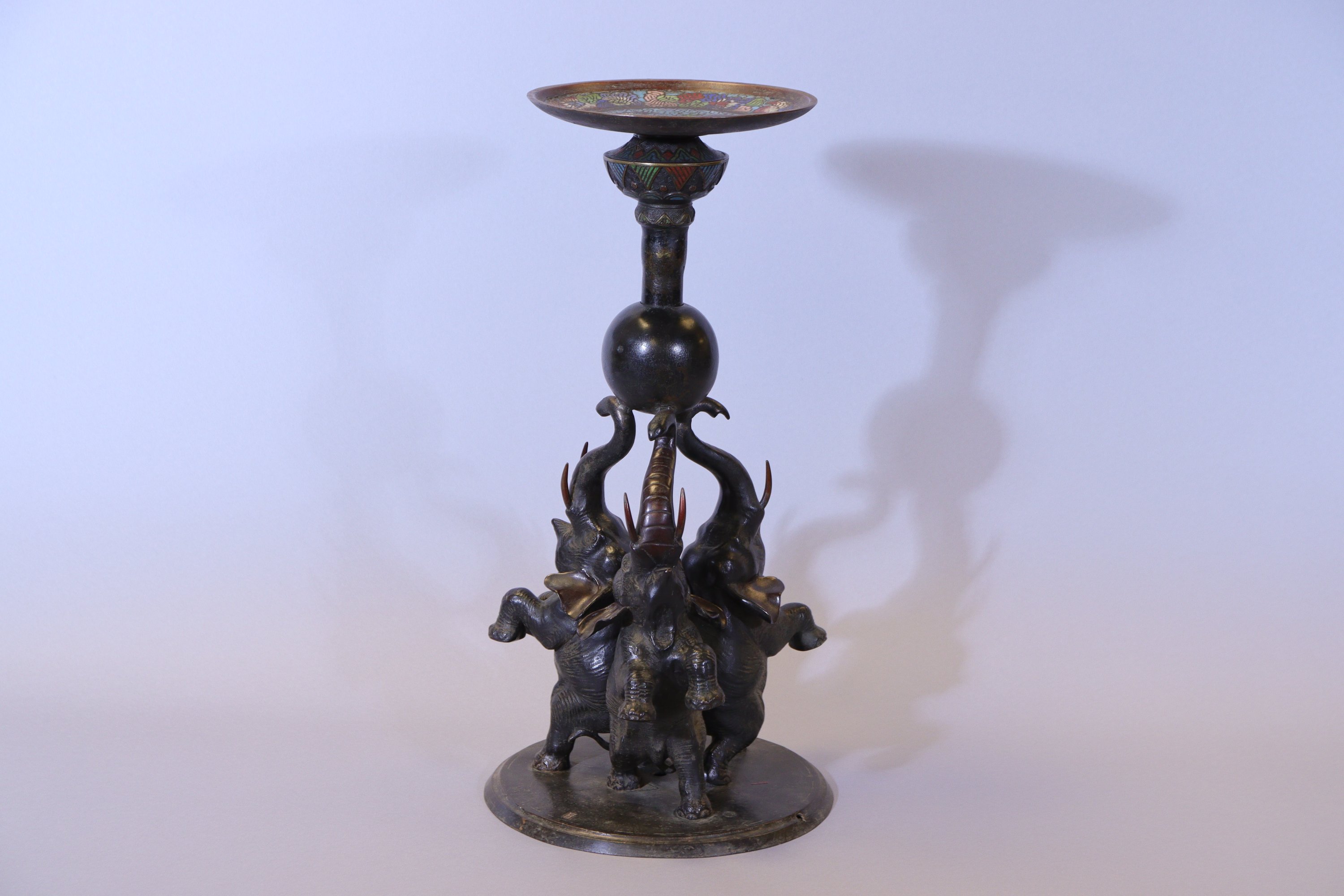 formé de trois éléphants dressés supportant une boule. Dans la partie supérieure, une coupe au dragon en bronze à patine brune et émaux cloisonnés.