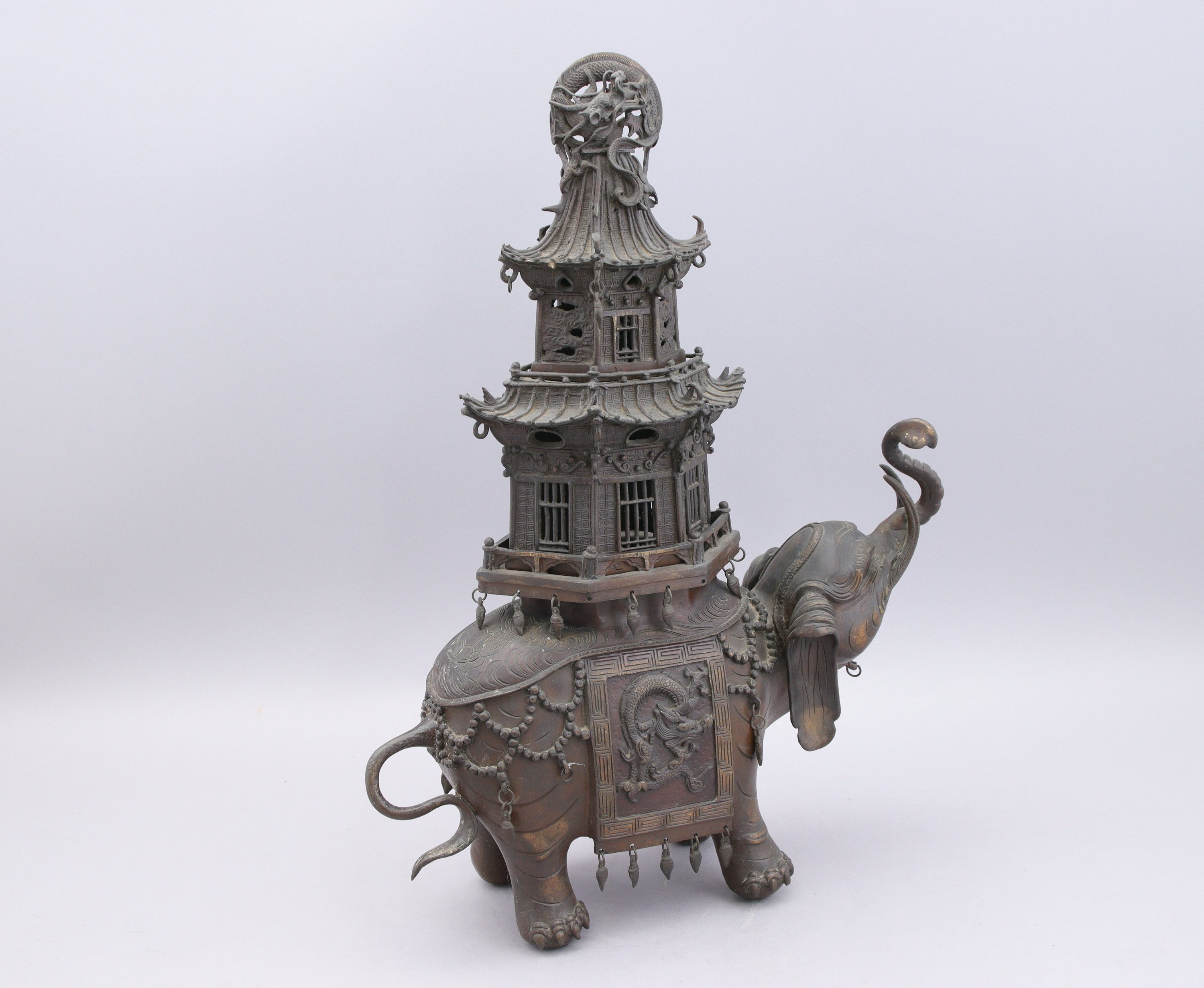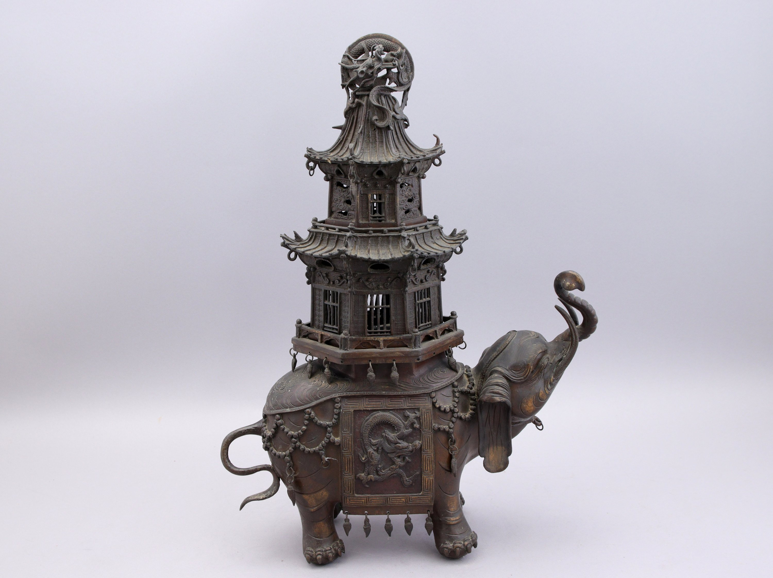 en bronze, portant sur son dos une pagode ajourée. Un dragon lové posé sur le toit de la pagode, des dragons ornant le tapis de selle.