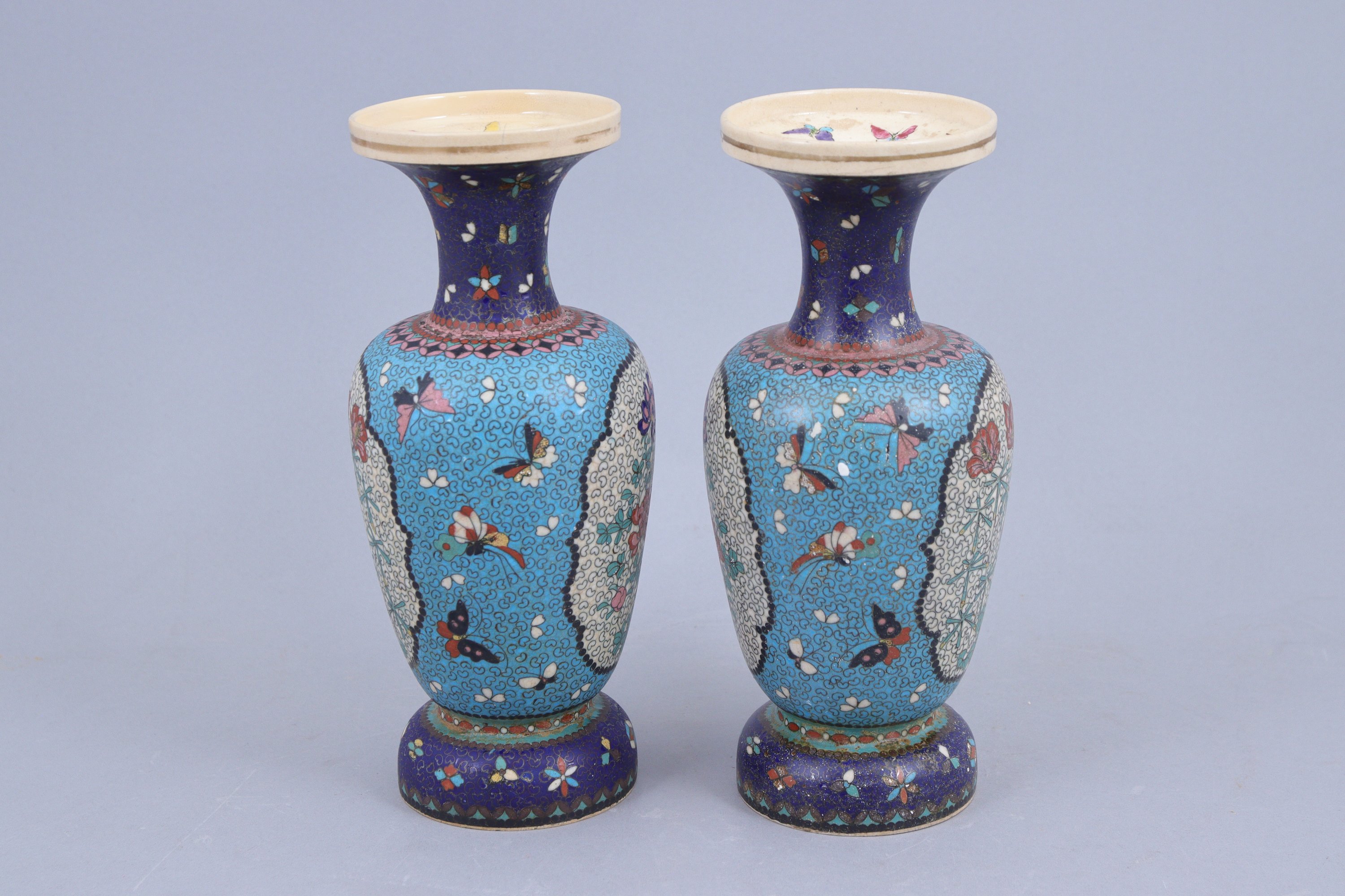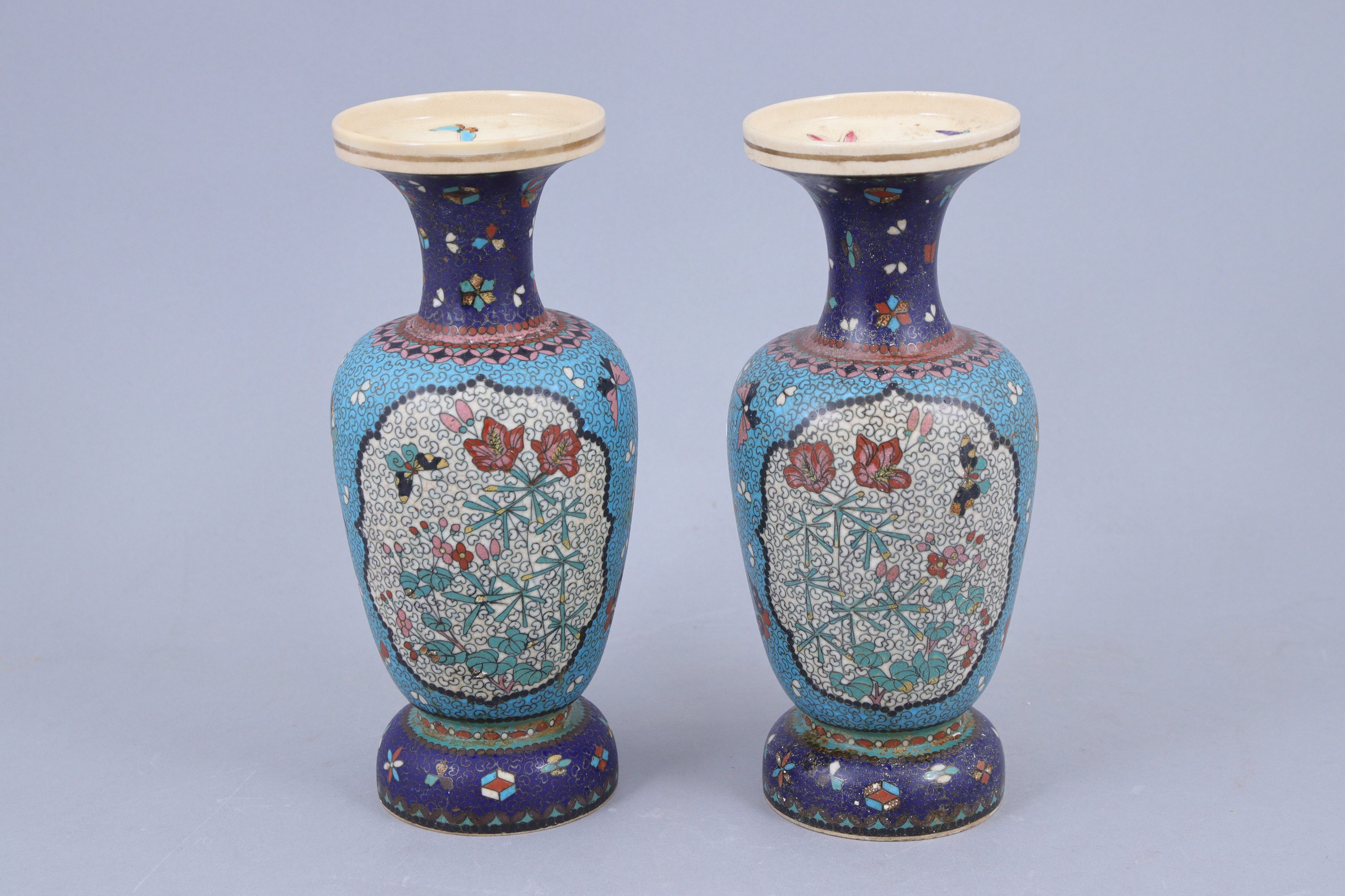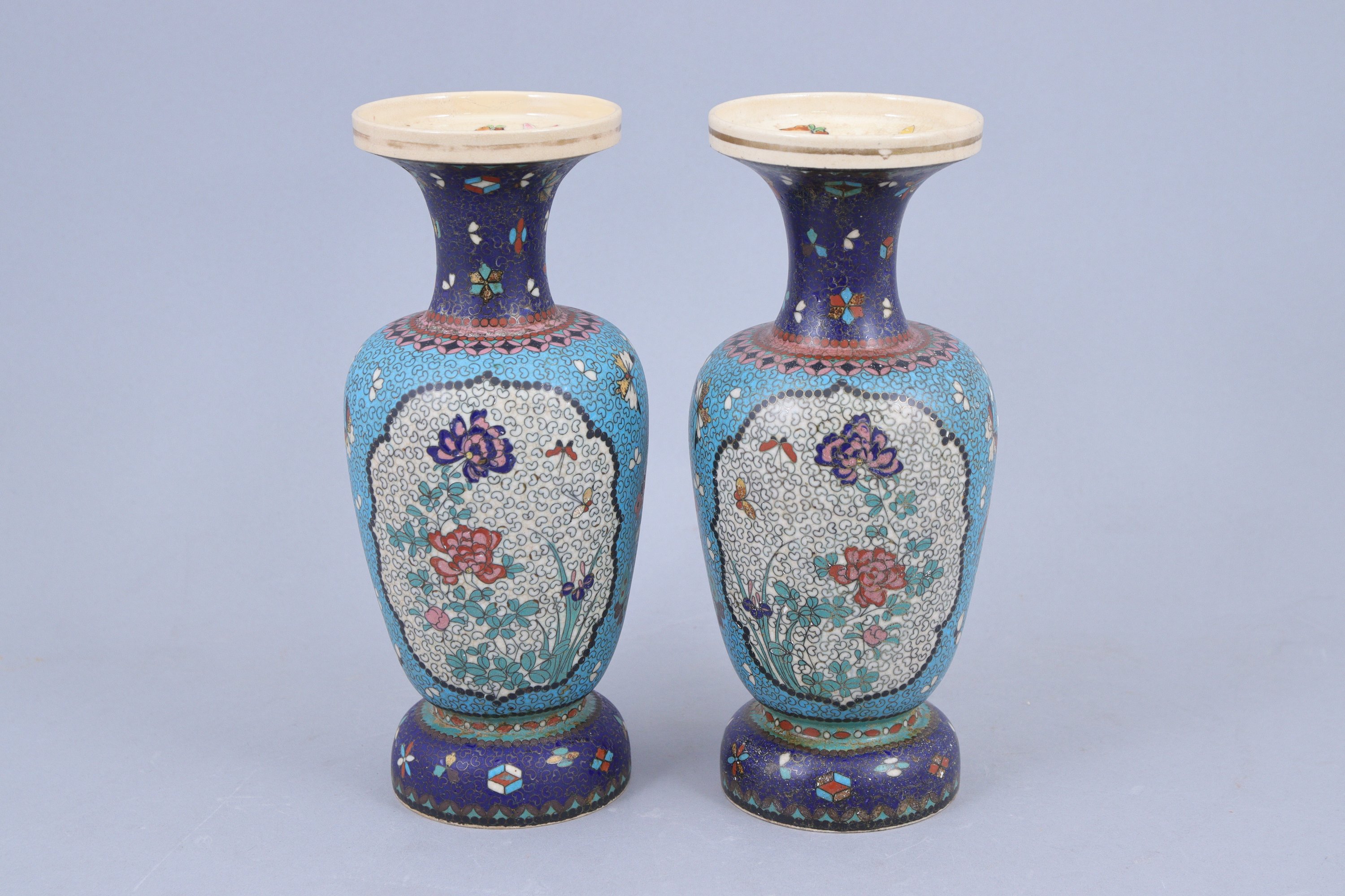 en céramique et émaux cloisonnés, à décor de réserves ornées de fleurs dans leur feuillage et papillons sur fond blanc.