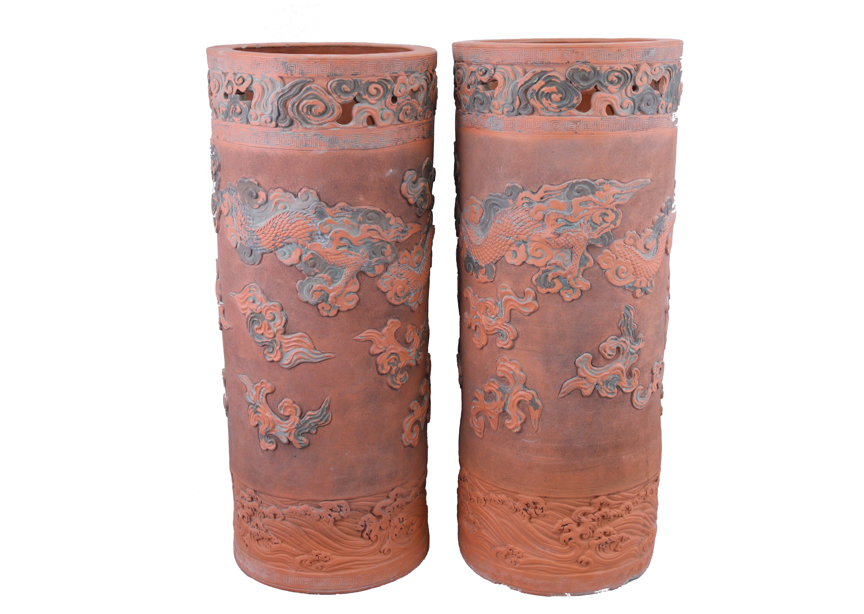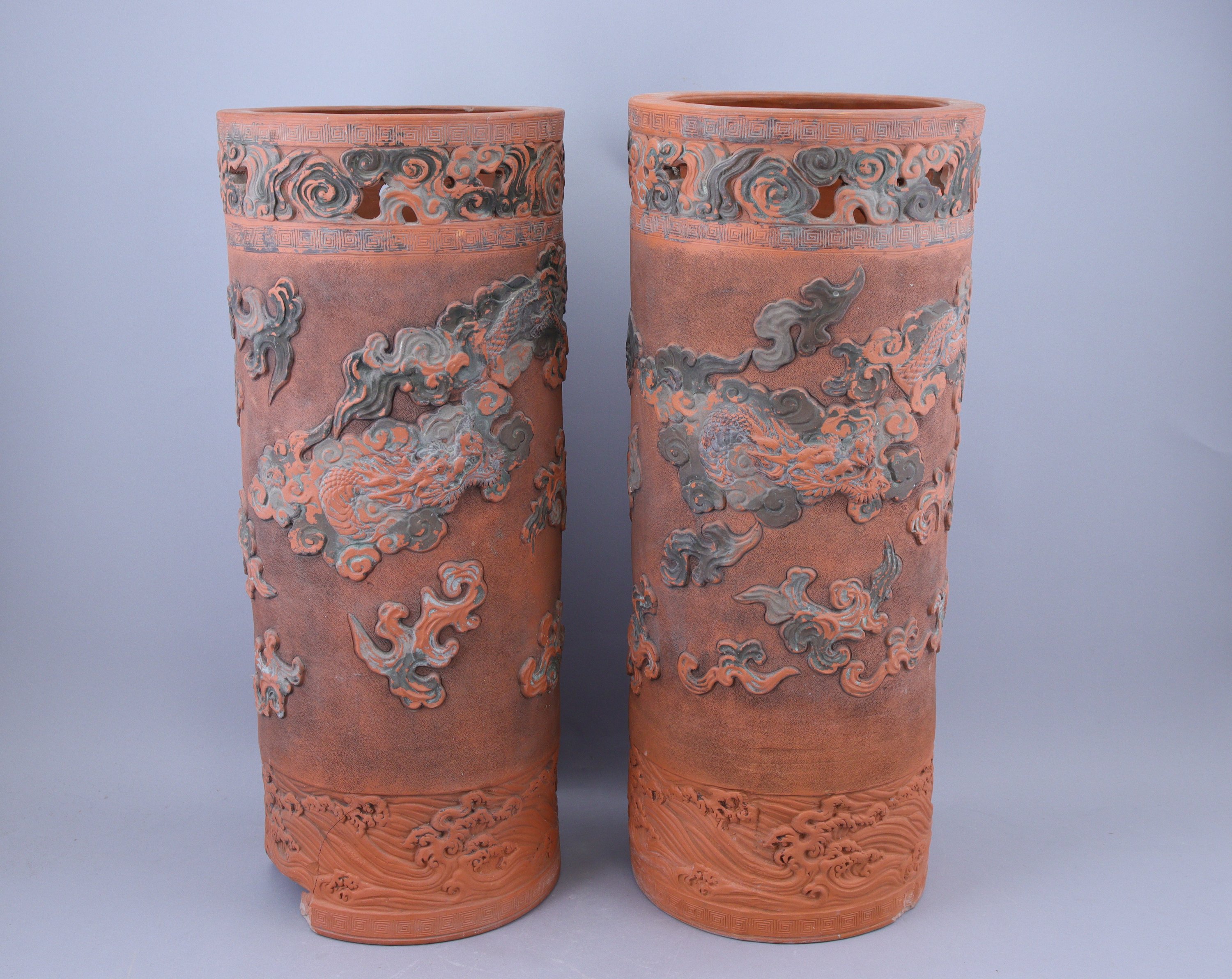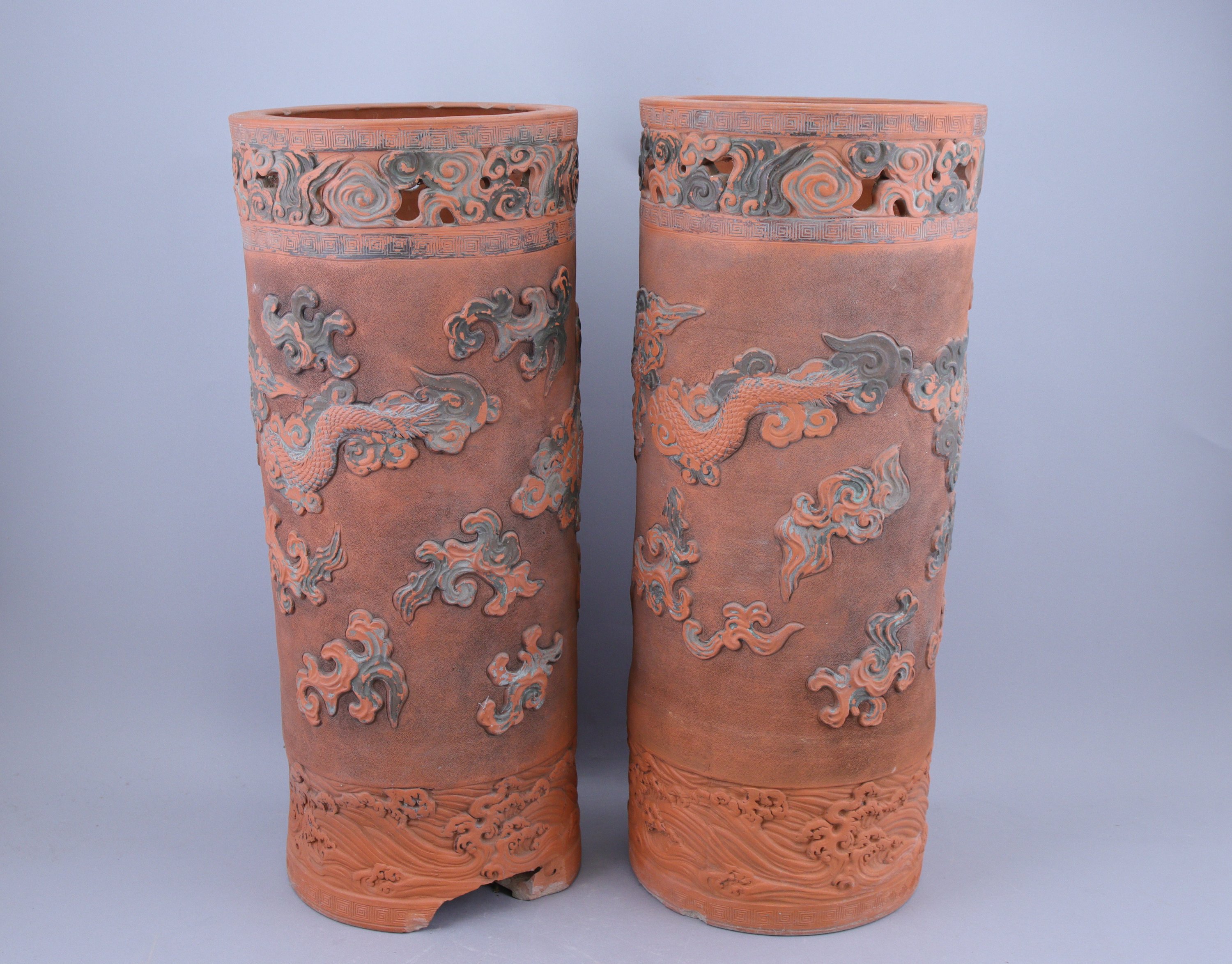 en terre cuite émaillée polychrome, à décor en relief de dragons pourchassant la perle sacrée.