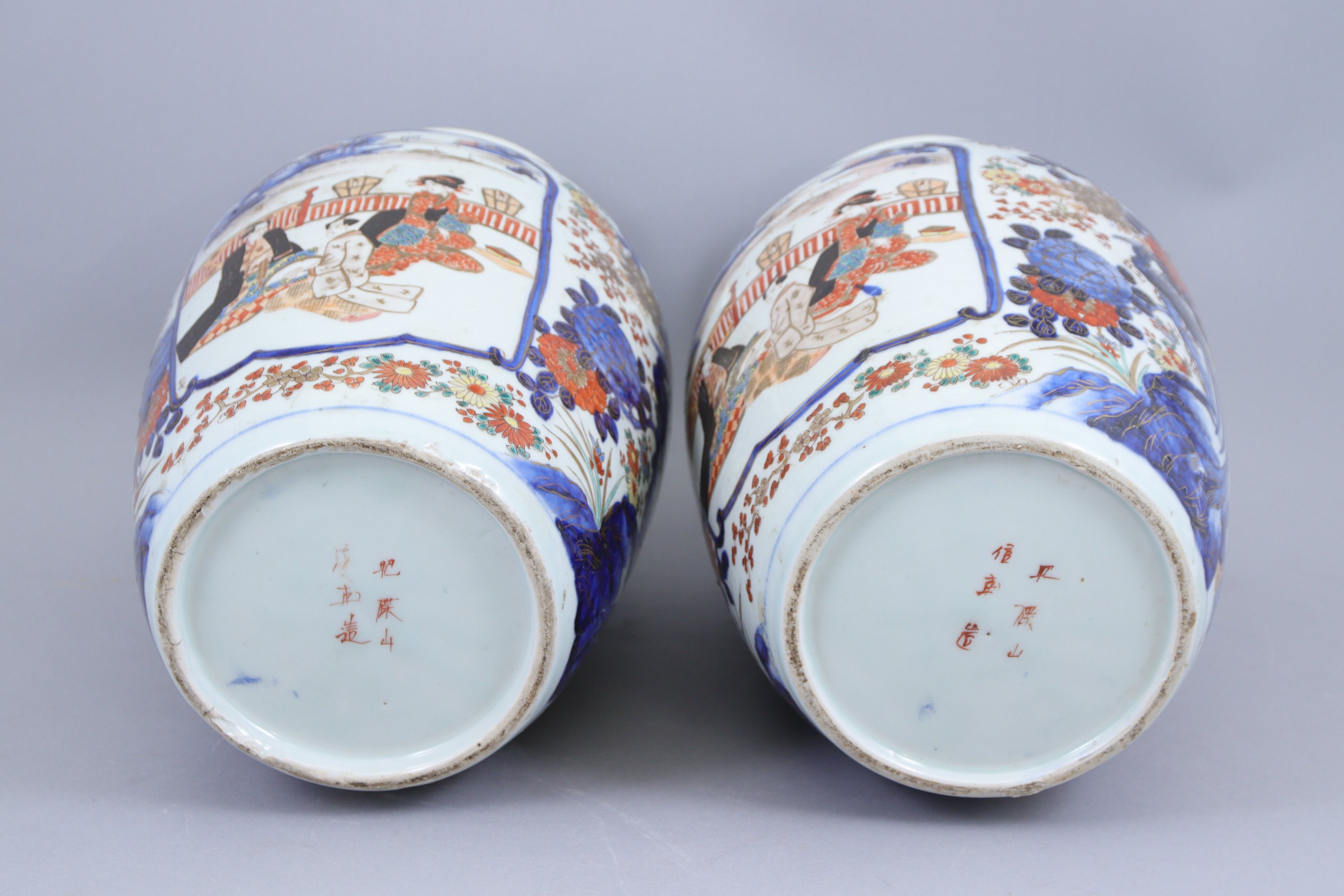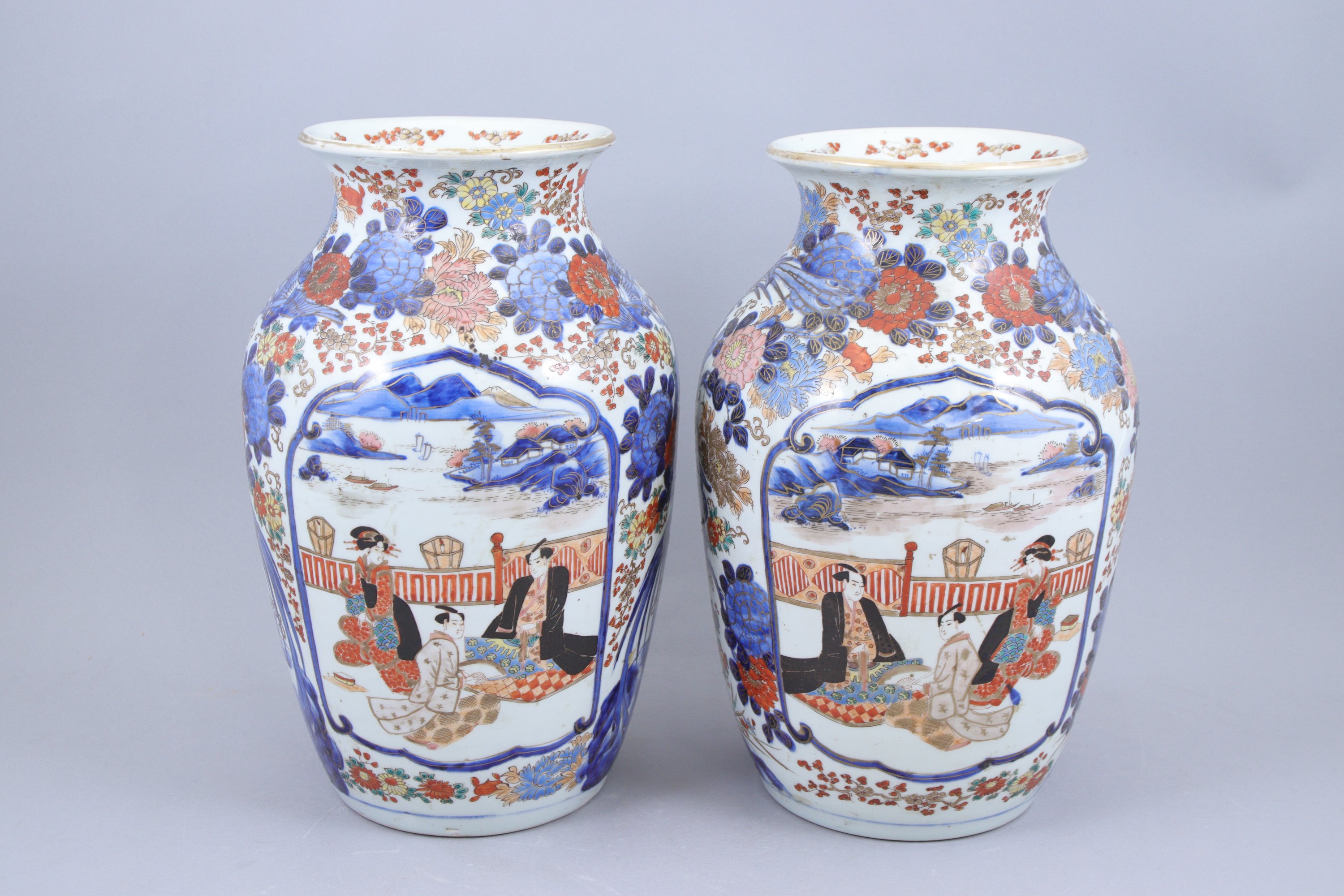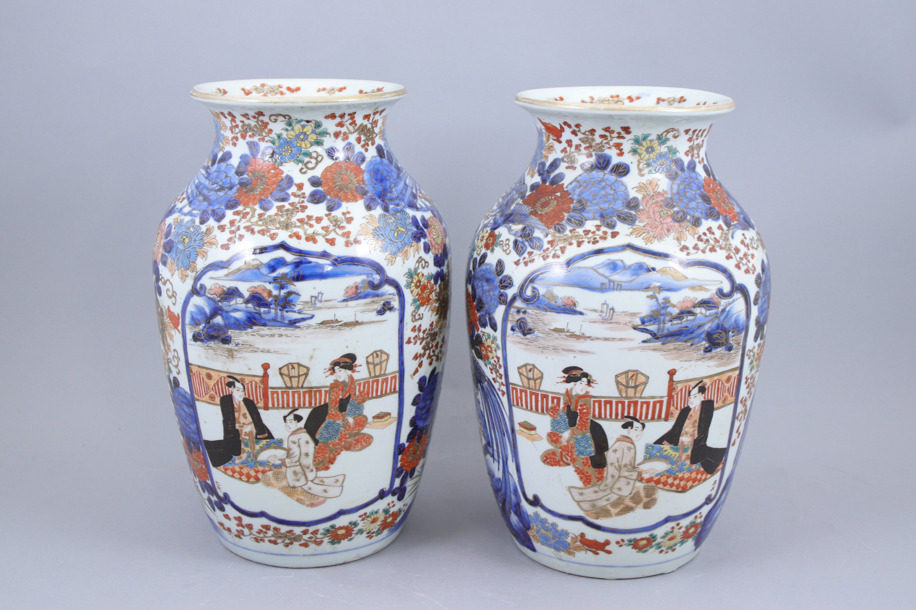 en porcelaine émaillée, à décor imari figurant dans un cartouche une conversation dans un paysage lacustre, sur fond de chrysanthèmes et d'oiseaux.