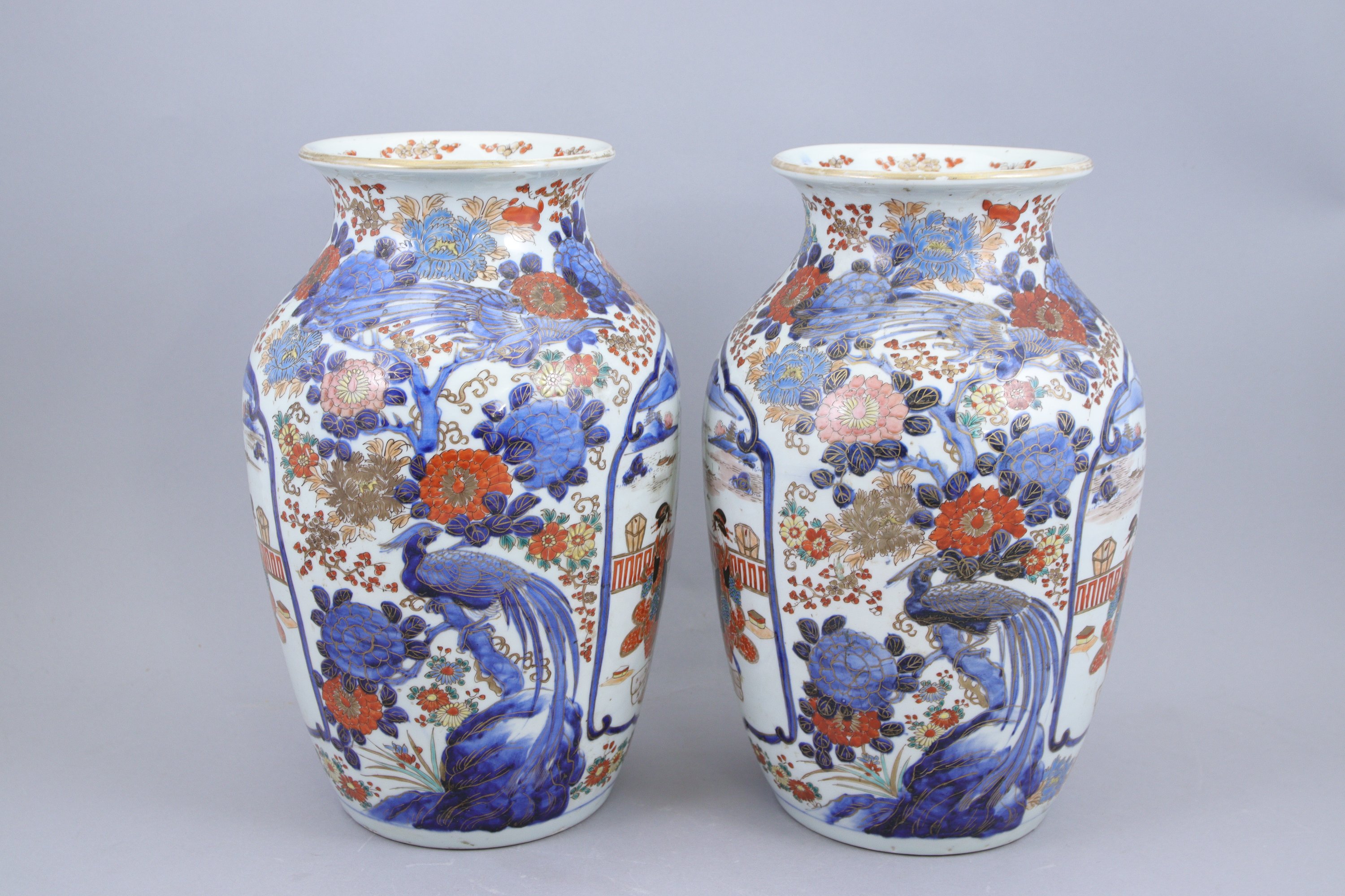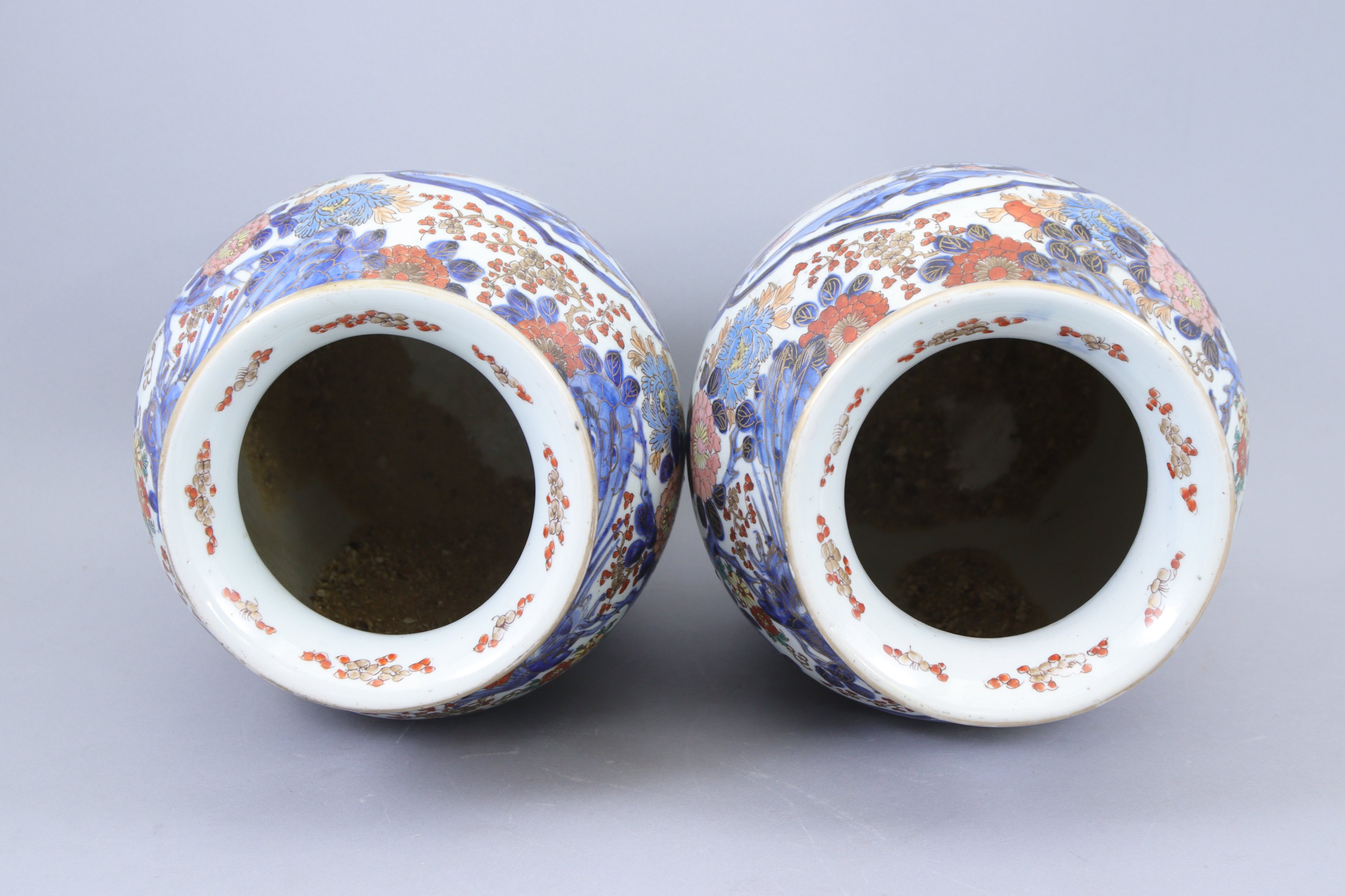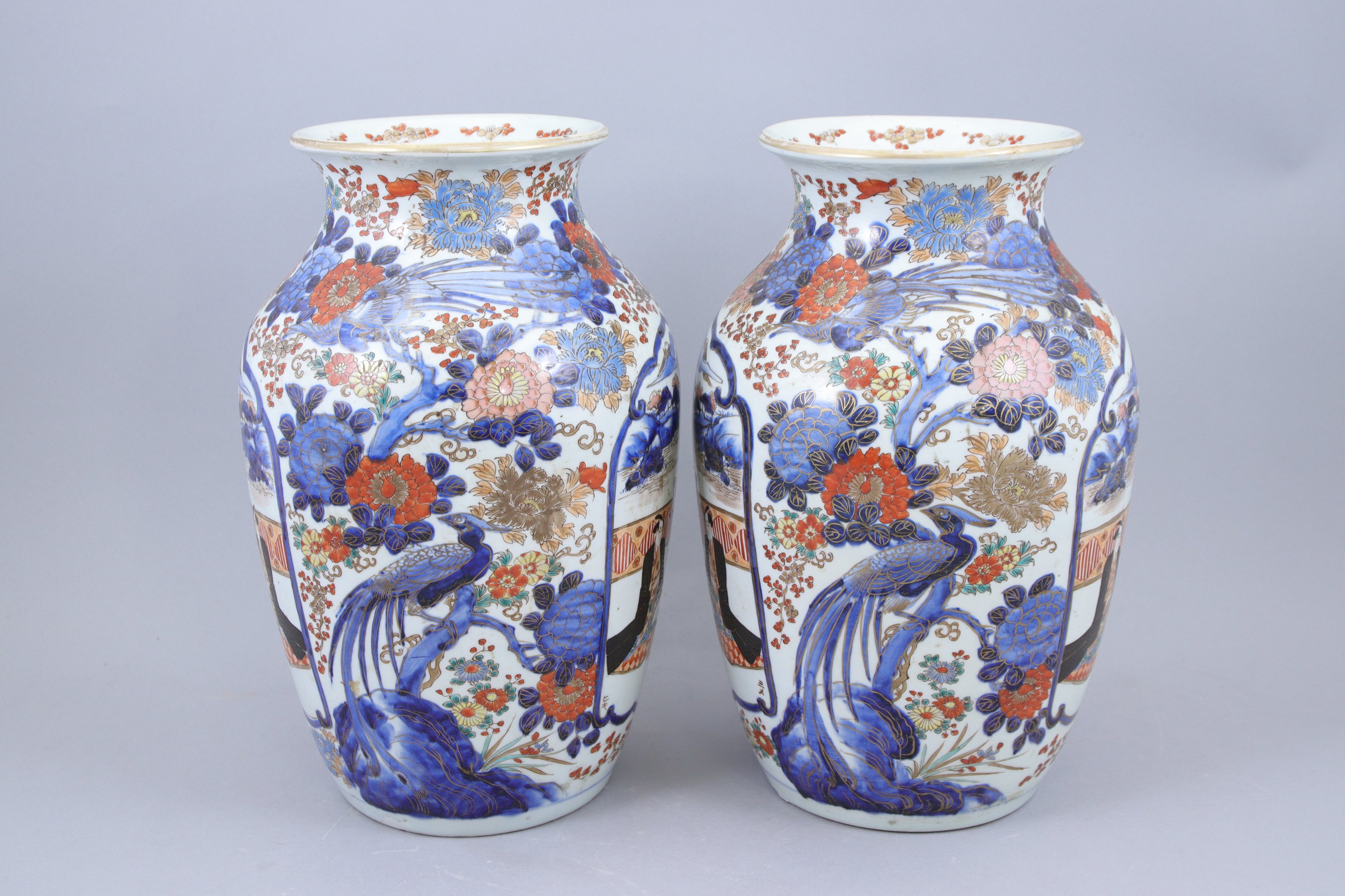 en porcelaine émaillée, à décor imari figurant dans un cartouche une conversation dans un paysage lacustre, sur fond de chrysanthèmes et d'oiseaux.