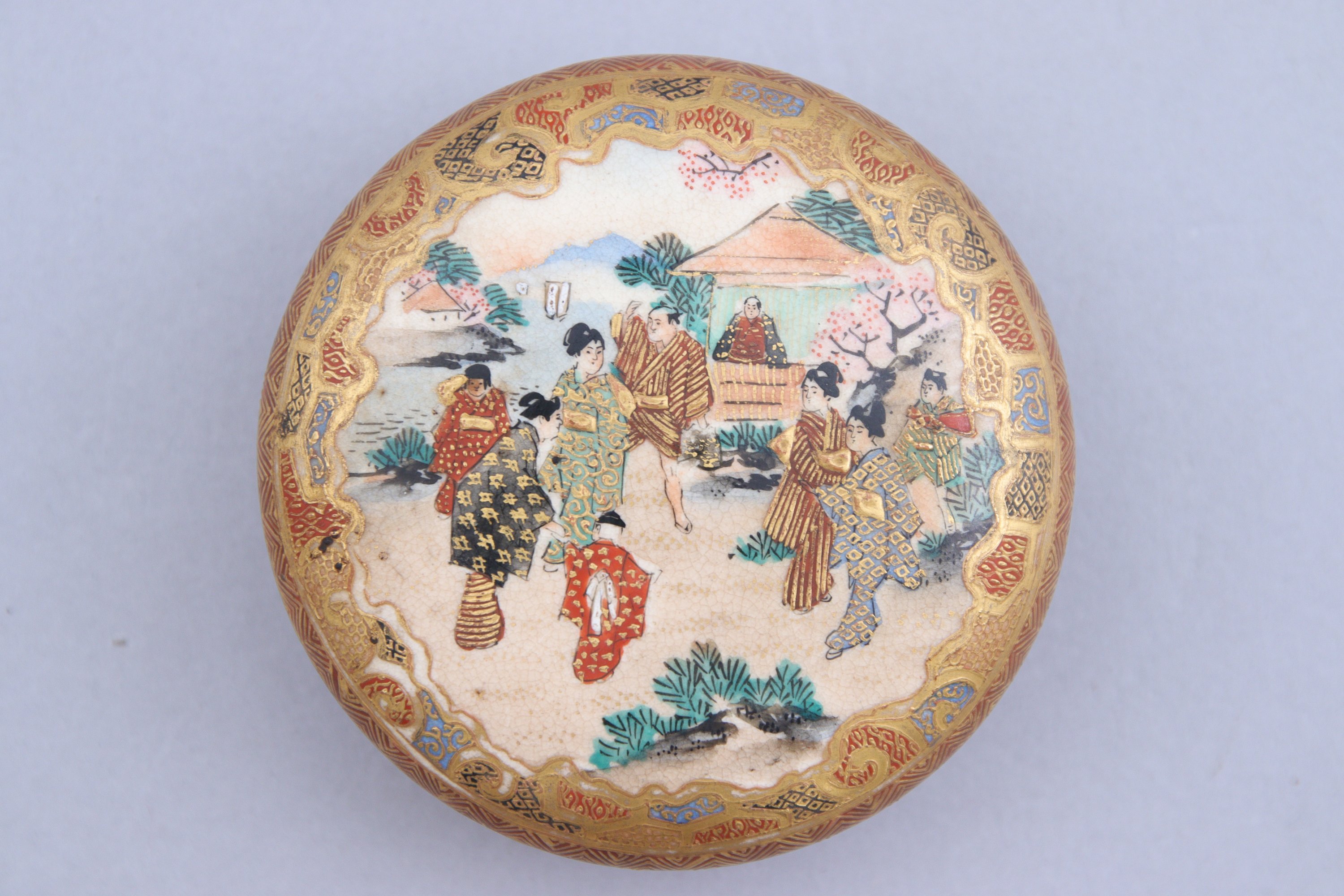 en faïence de Satsuma émaillée polychrome, à décor de jeunes femmes et enfants dans un jardin. L'intérieur orné d'éventails ouverts et décorés de couples.