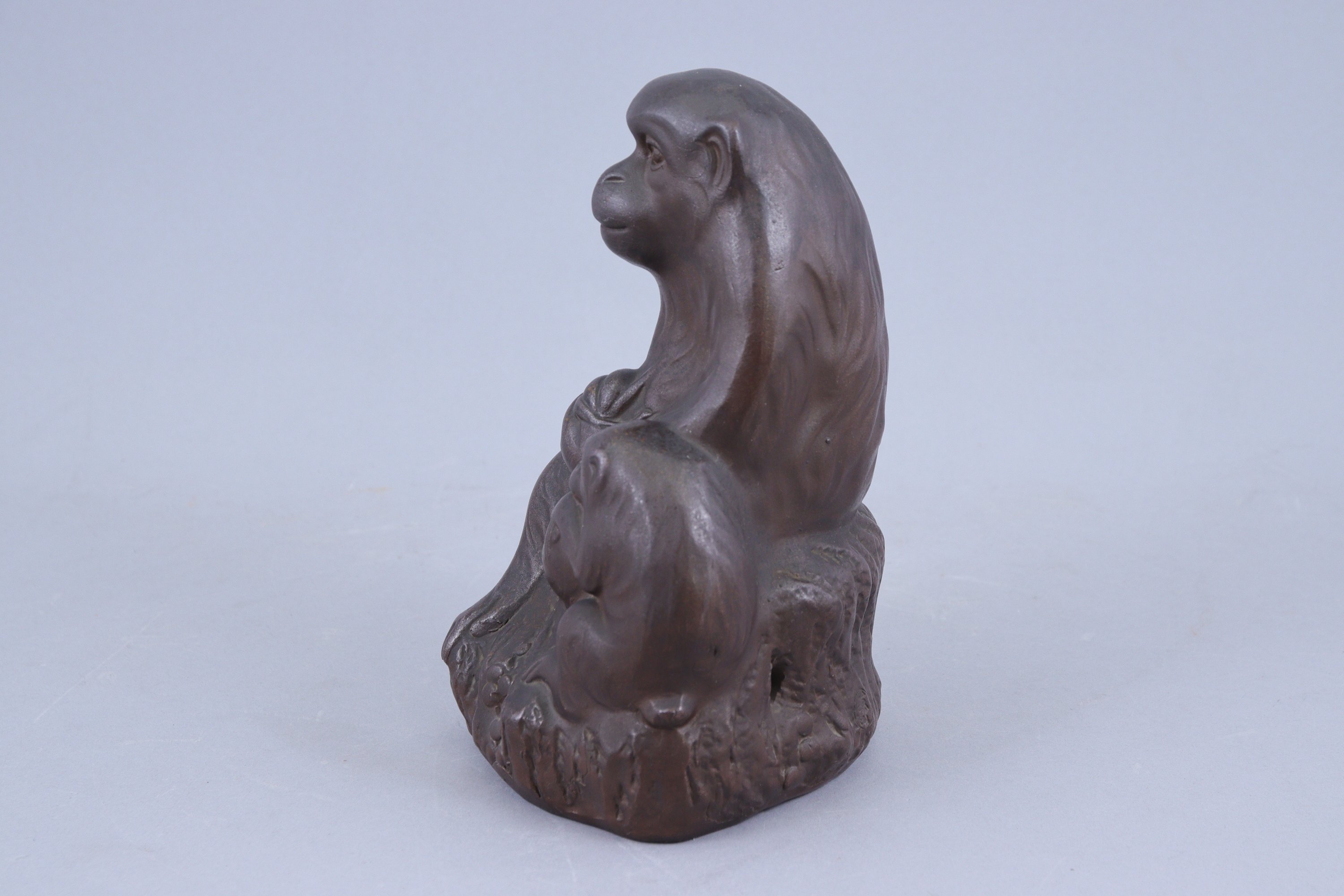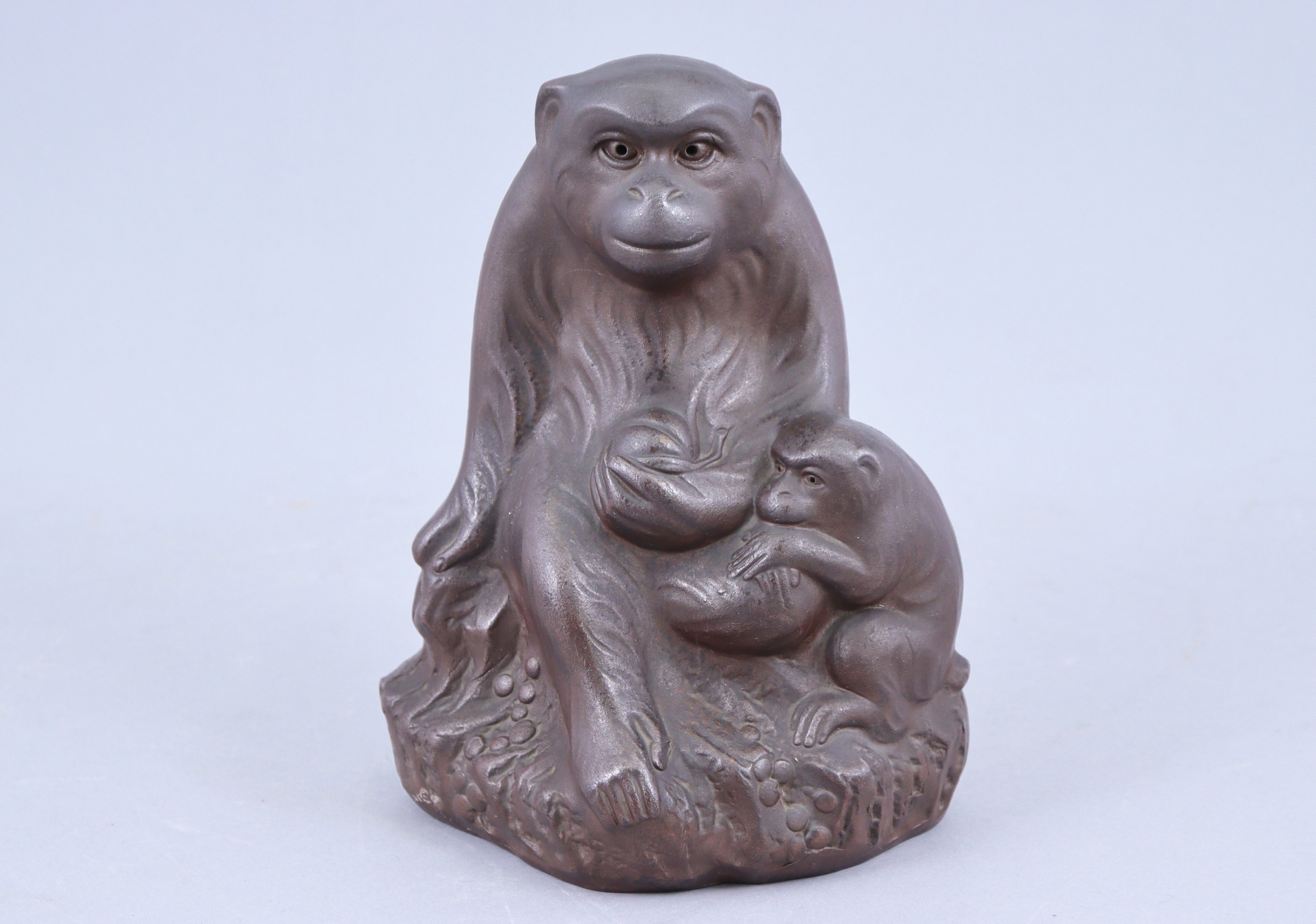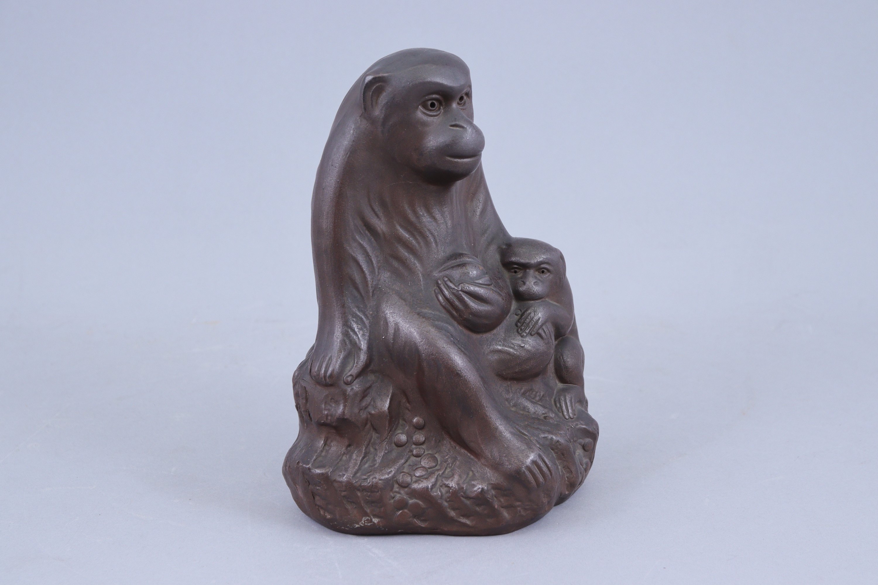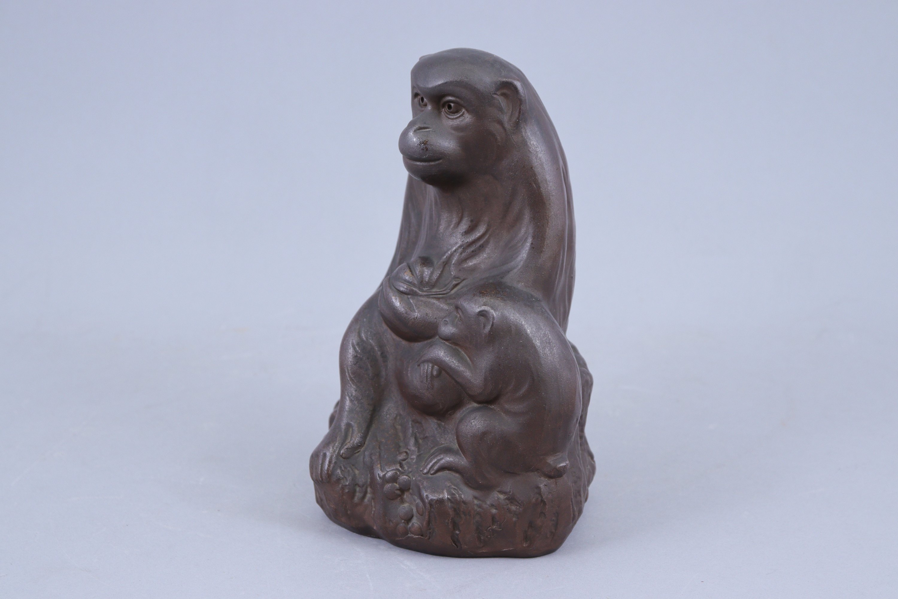 en grès brun, singe assis tenant une pêche dans la patte, son petit à ses côtés.