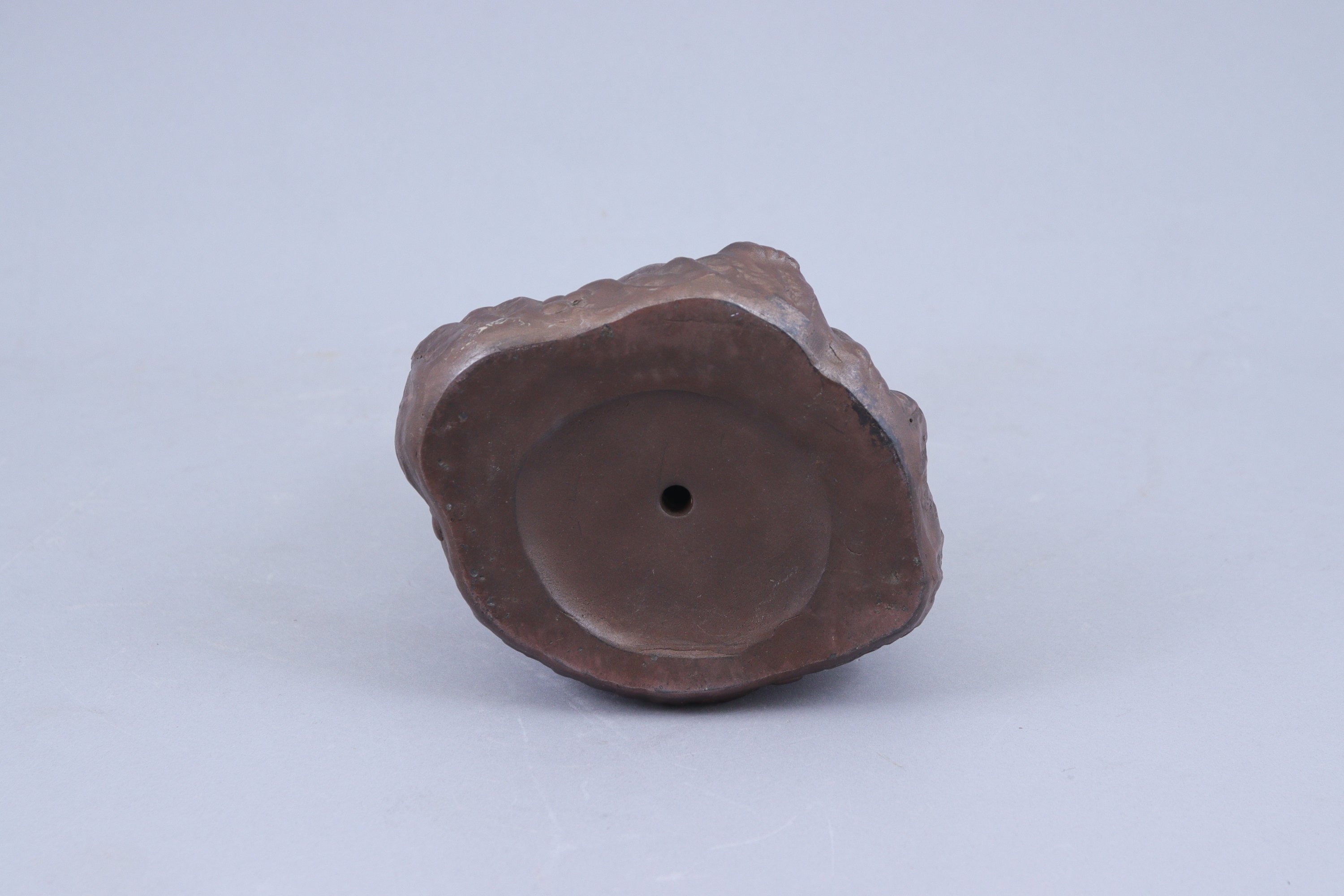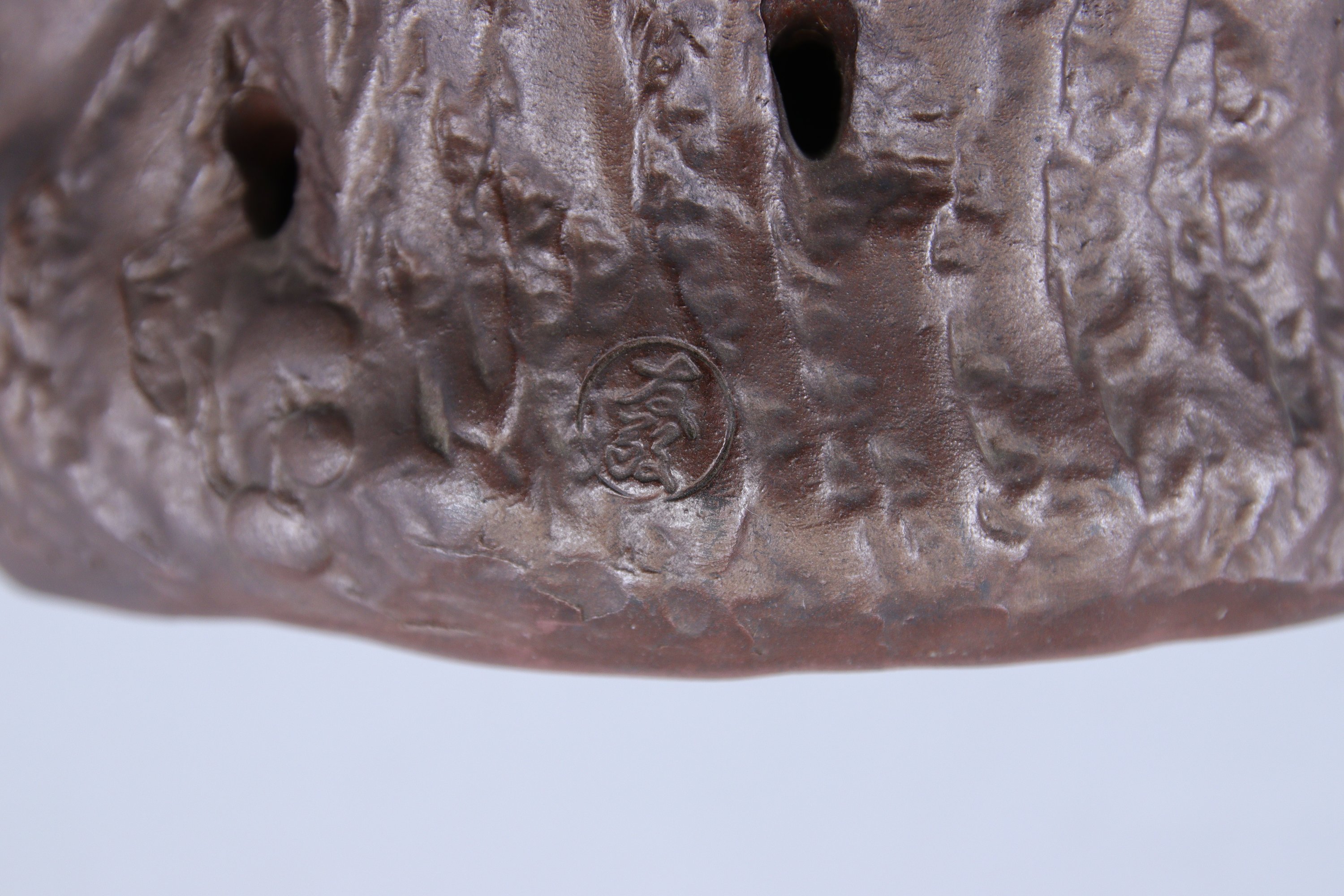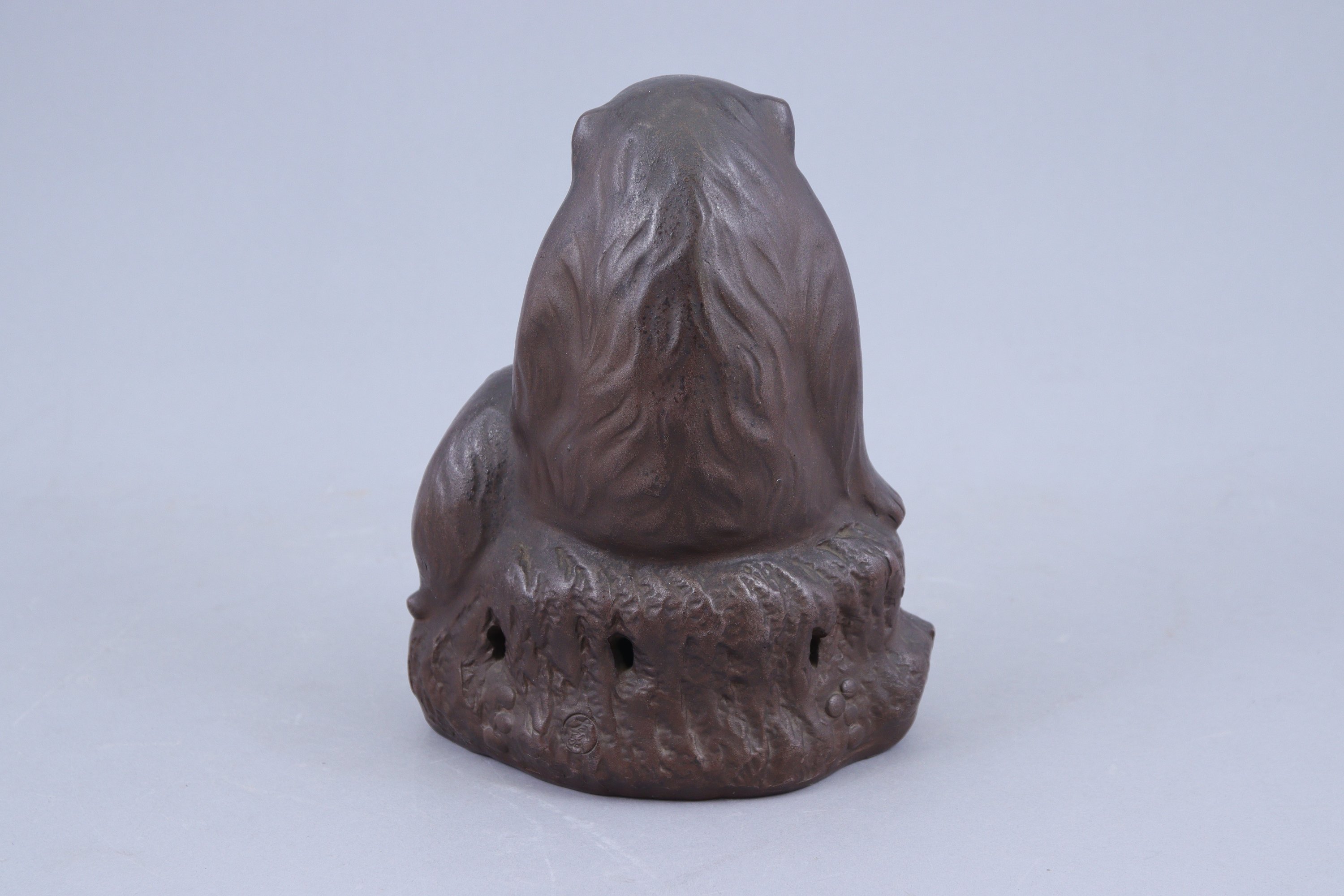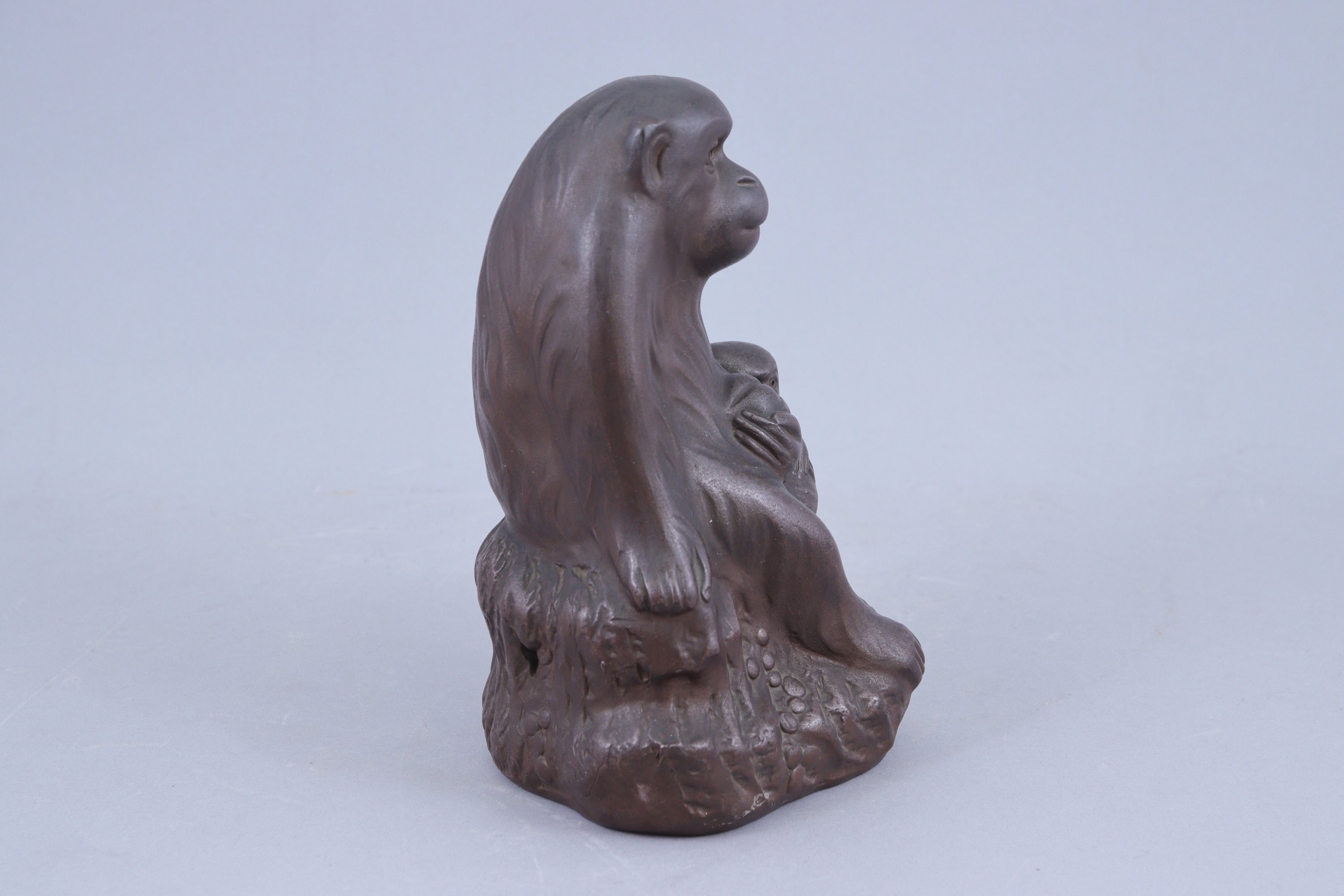 en grès brun, singe assis tenant une pêche dans la patte, son petit à ses côtés.