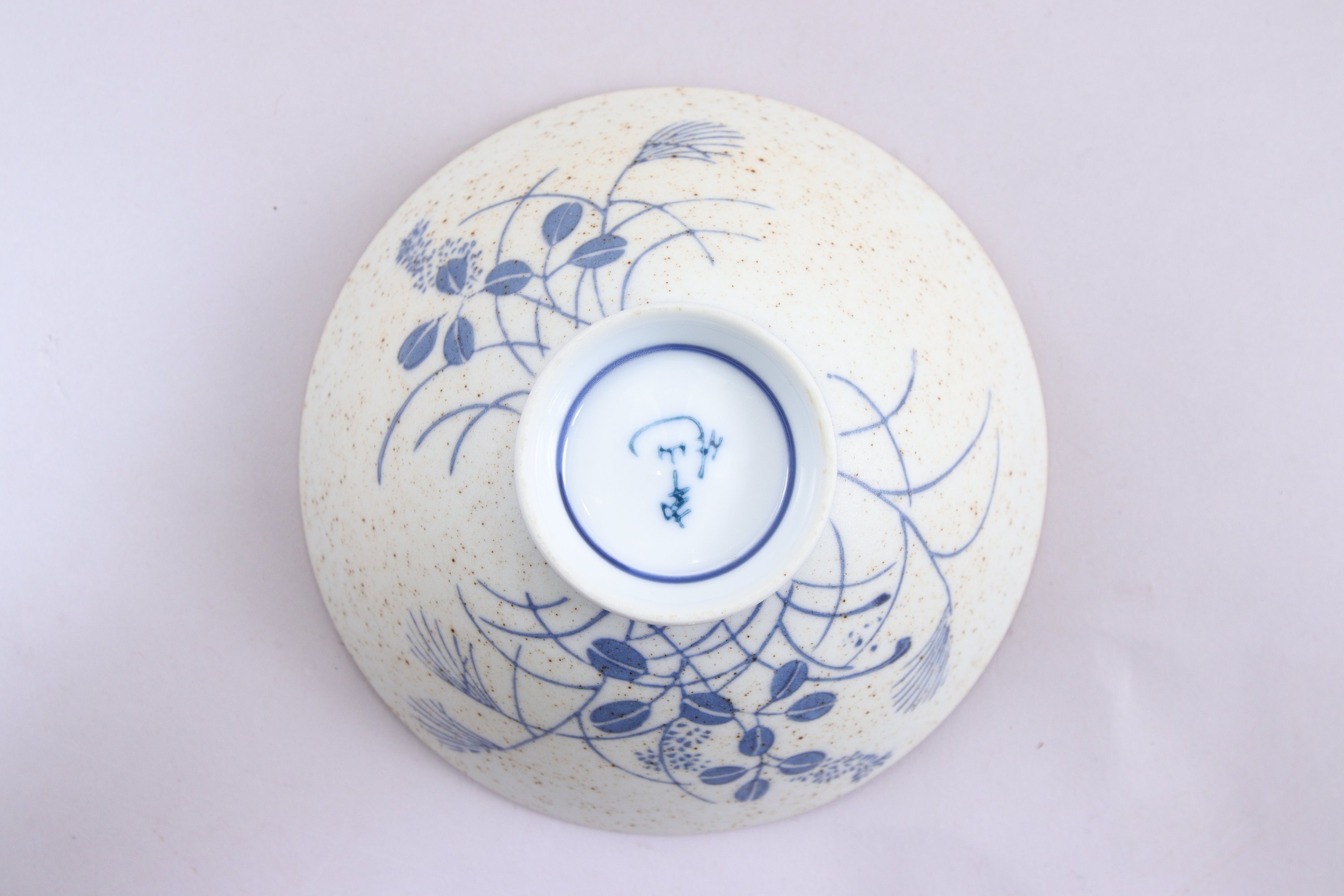 - Japon, XIXe siècle ?. Tasse à thé en porcelaine blanche au décor végétal bleu et col ocre, présence d'un tampon sous la base. Haut. 5,3 Diam. 12 cm.