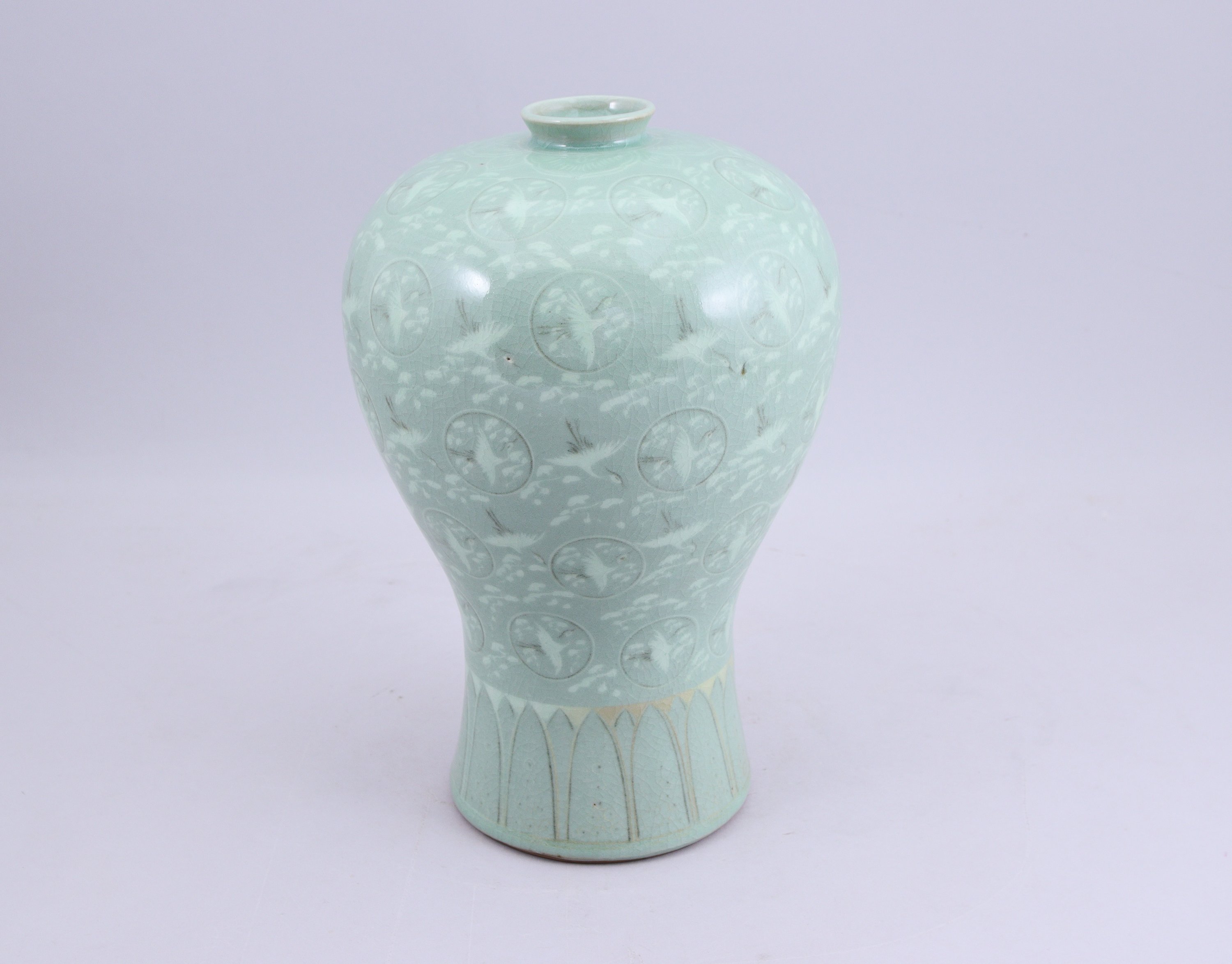 - Corée - XXe s. Vase de forme Meiping, en céramique céladon à décor de grues dans des nuées et frise géométrique. Pictogramme à la base. Haut. 31 cm.
