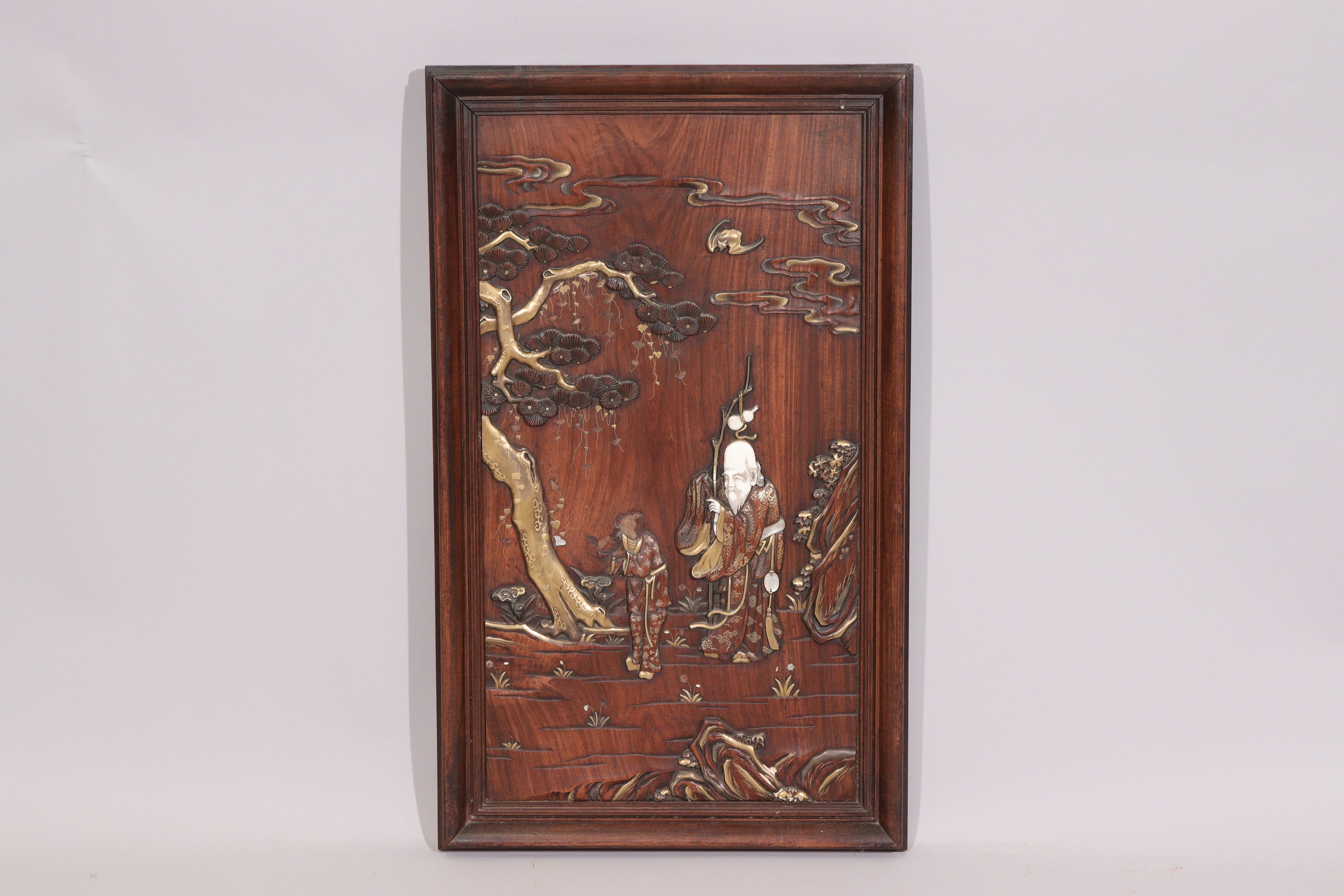 - Panneau représentant Jurojin en bois, à décor sculpté en relief figurant Jurojin tenant un bâton auquel est accroché une gourde, accompagné d'un enfant.