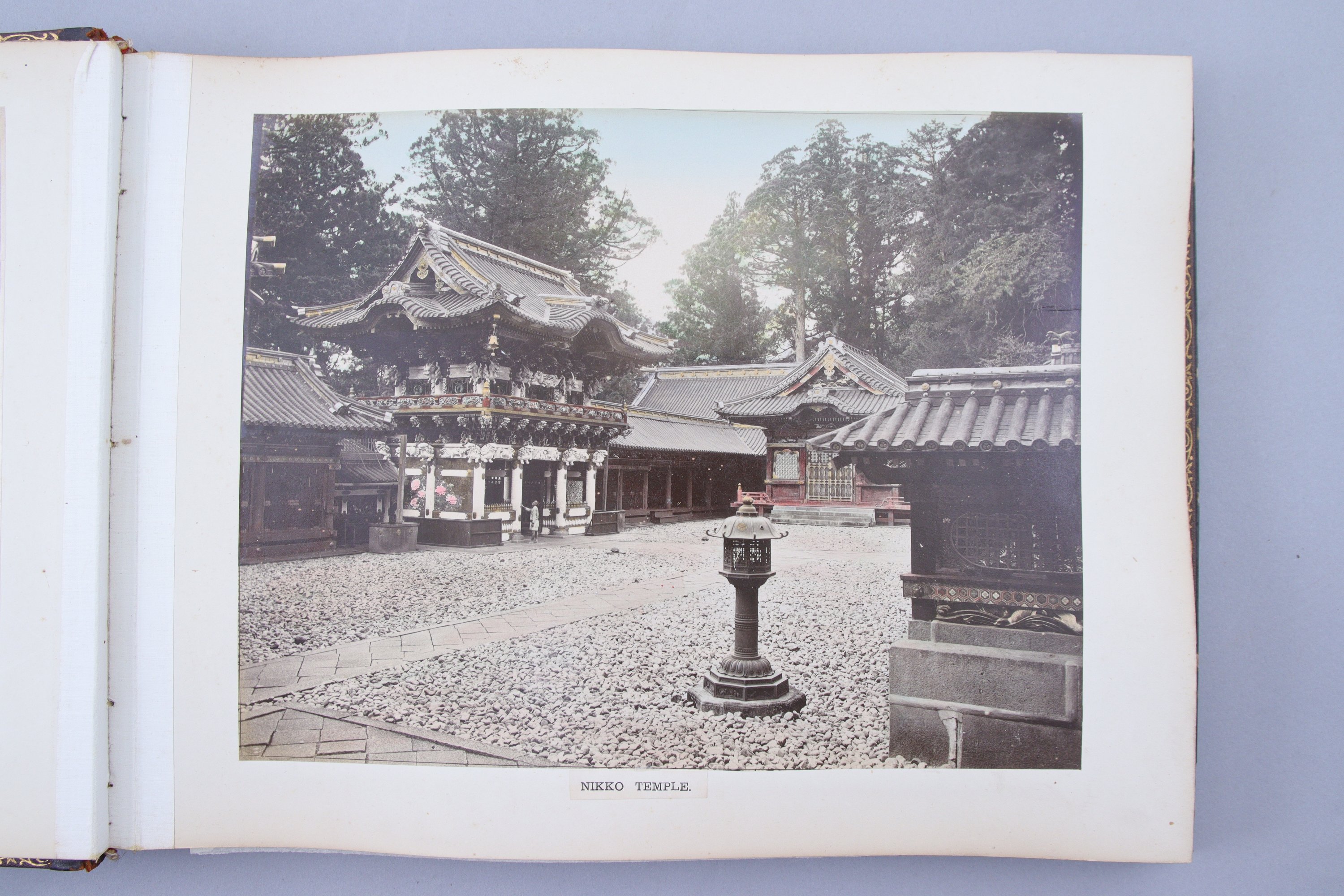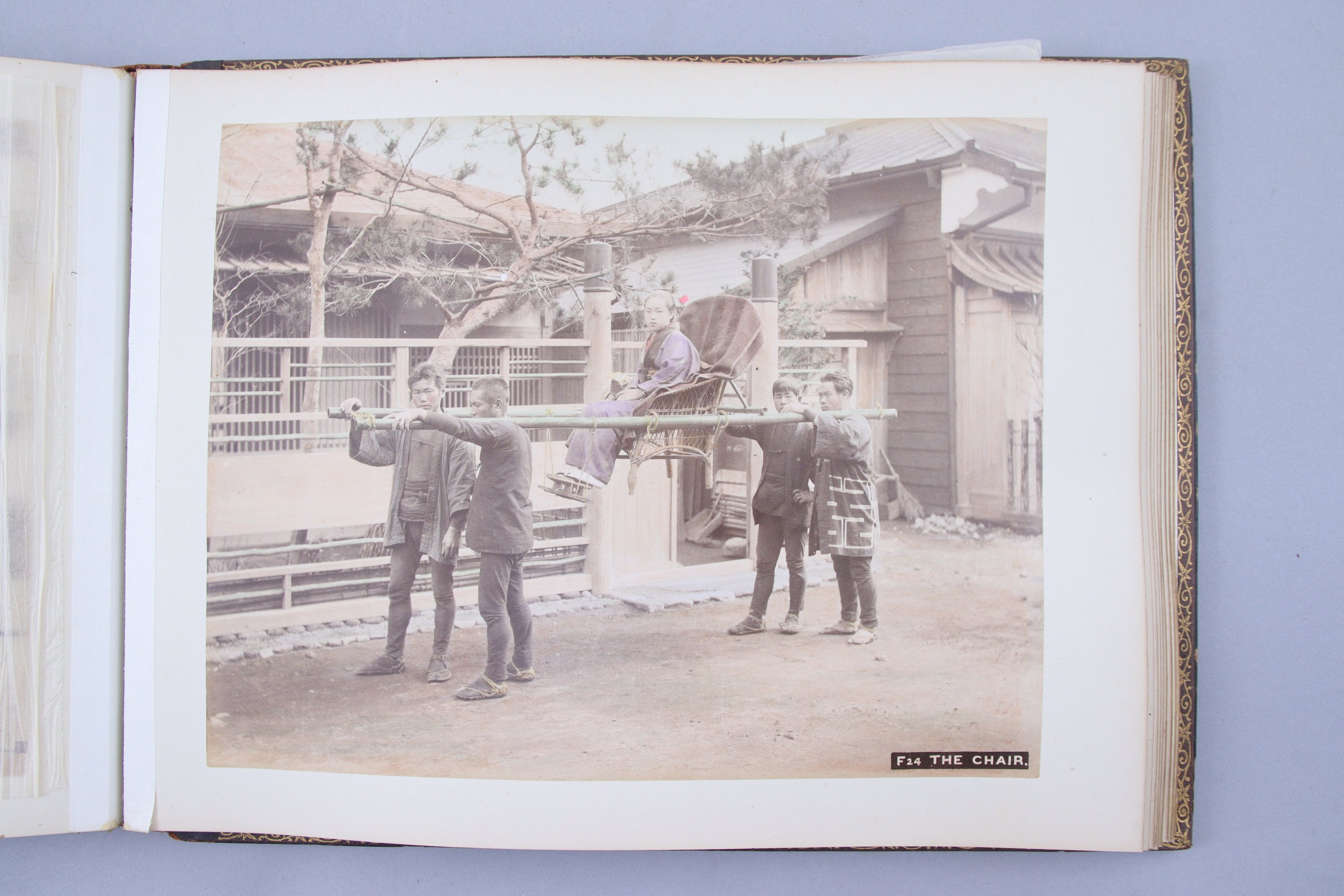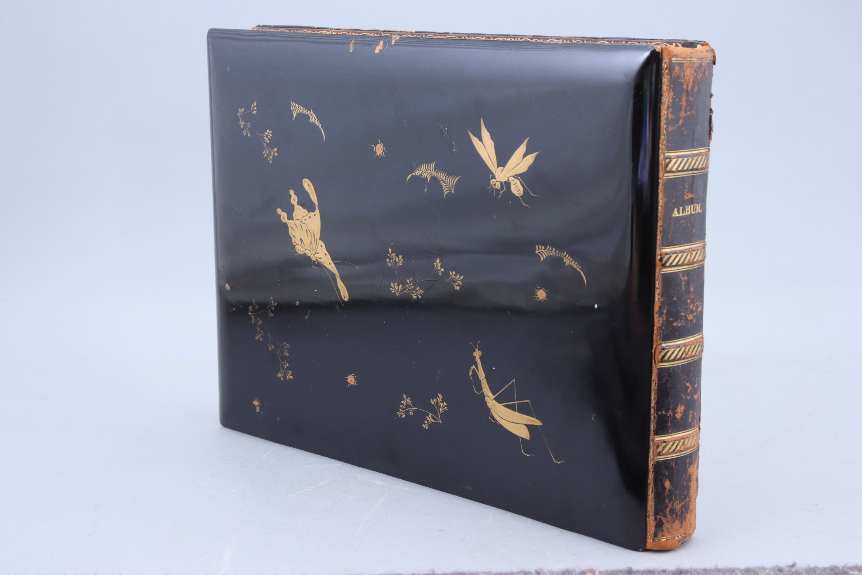 albuminées et rehaussées représentant des portraits en studio, temples et vues de paysages. Reliure en laque noire et or à décor d'insectes et personnages.