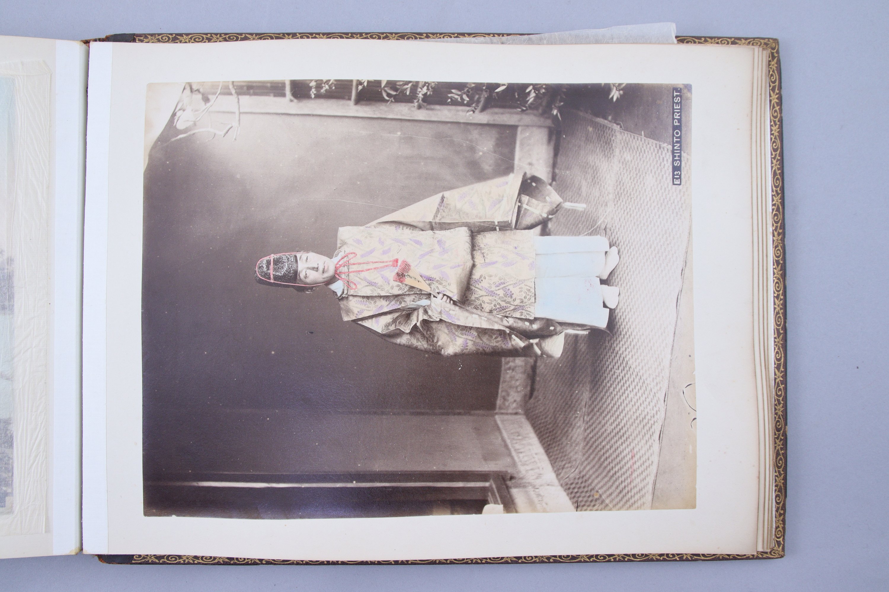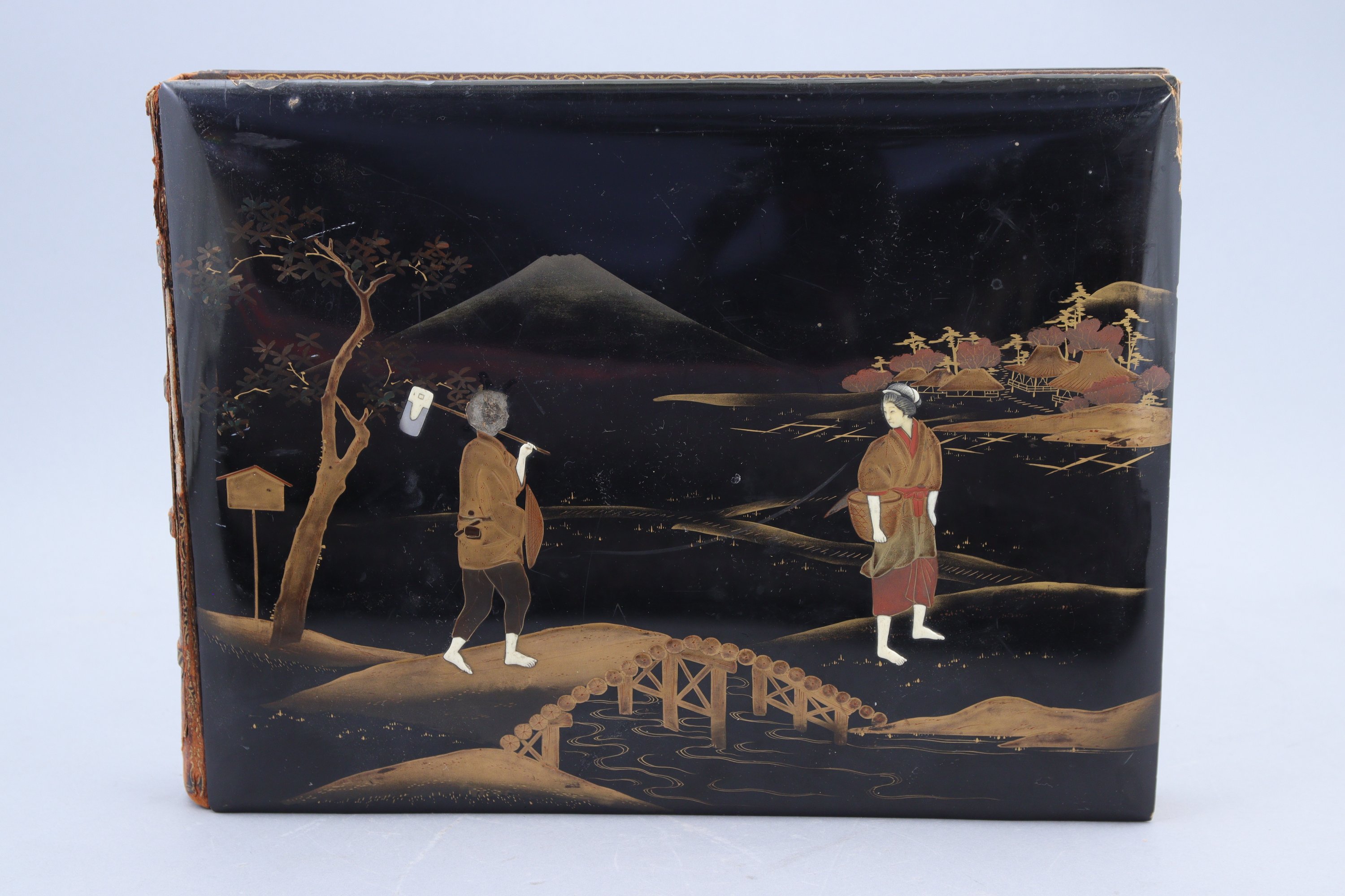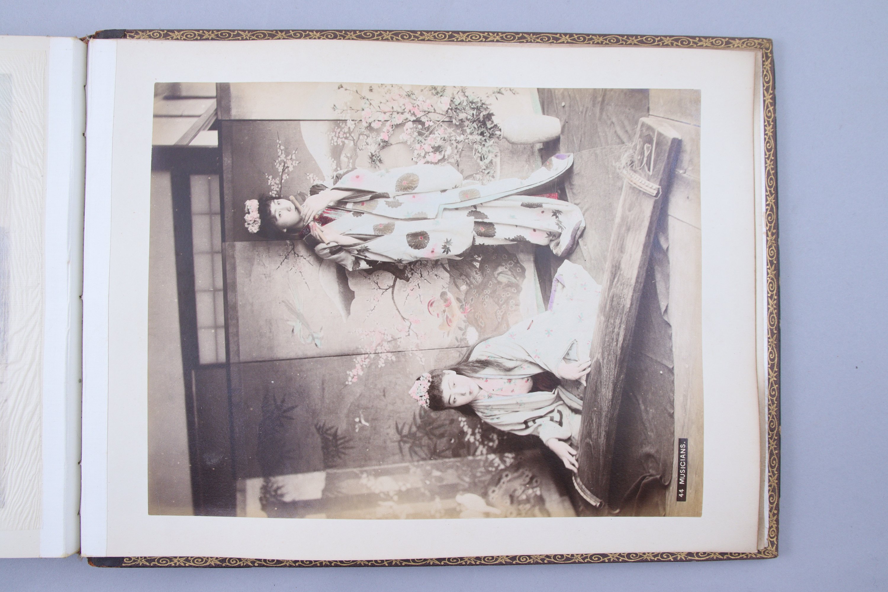 albuminées et rehaussées représentant des portraits en studio, temples et vues de paysages. Reliure en laque noire et or à décor d'insectes et personnages.