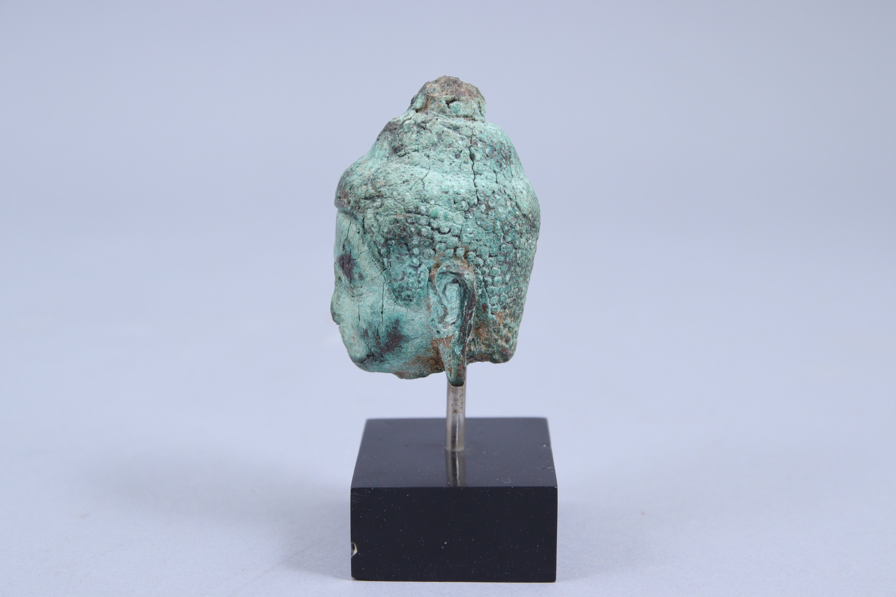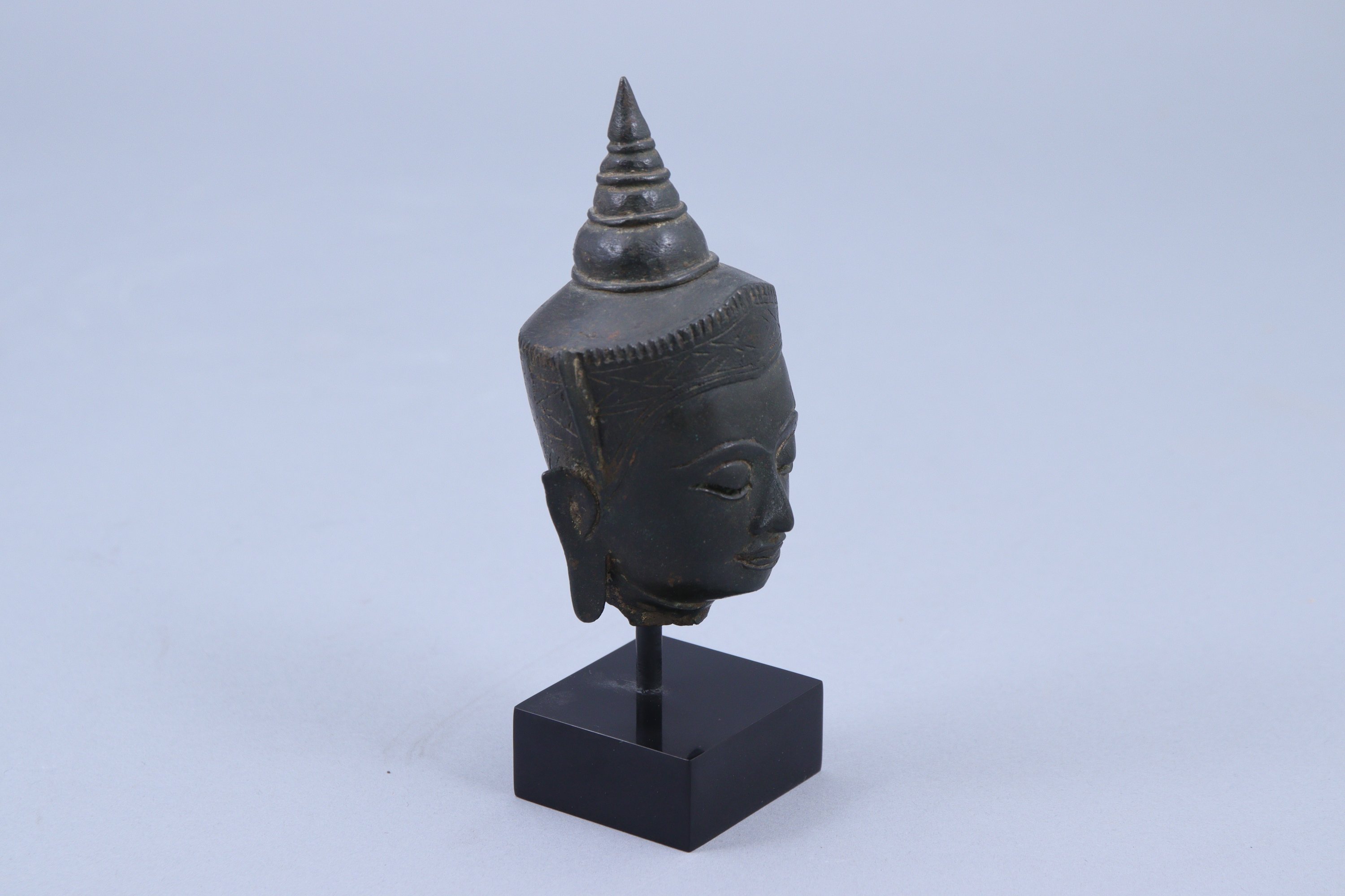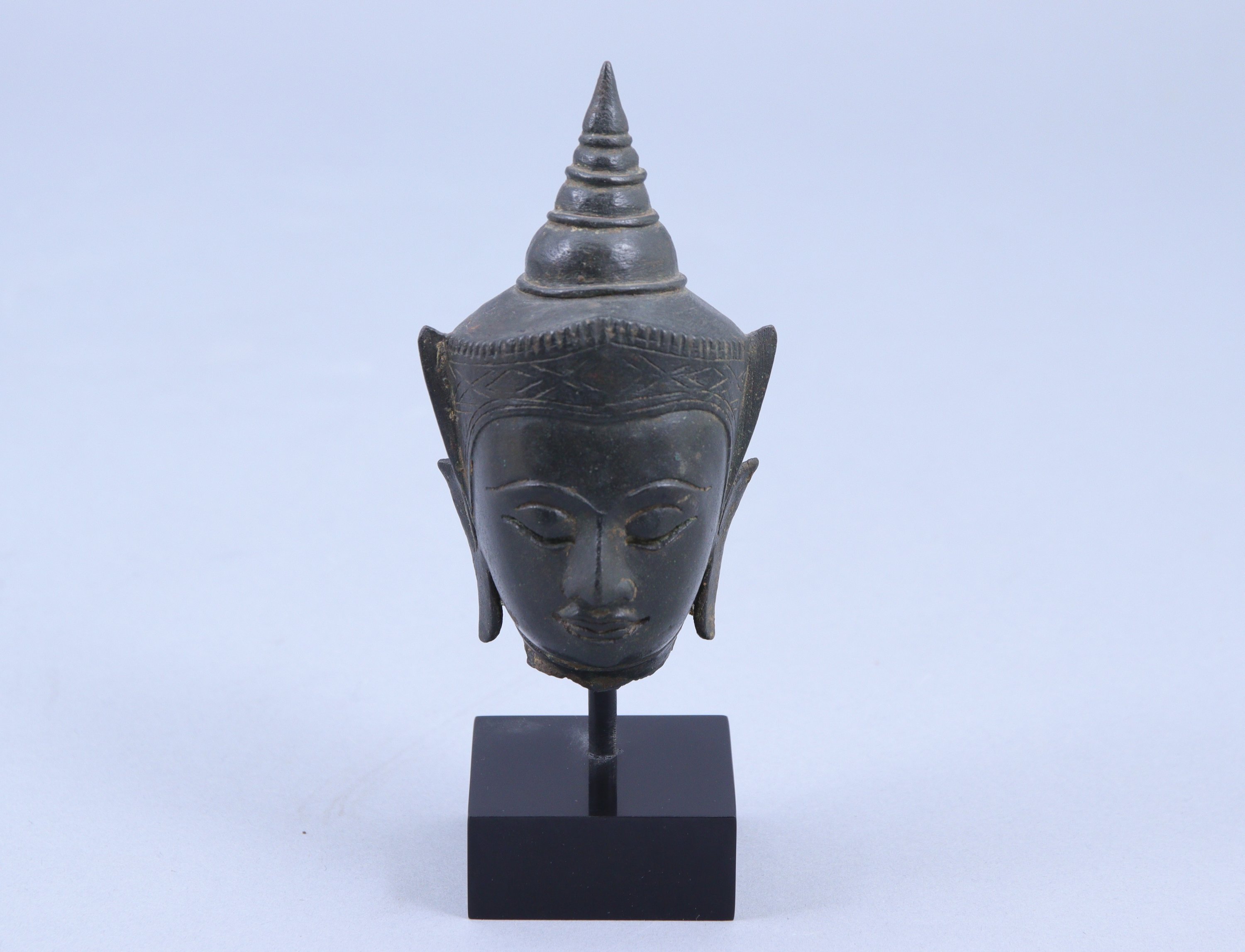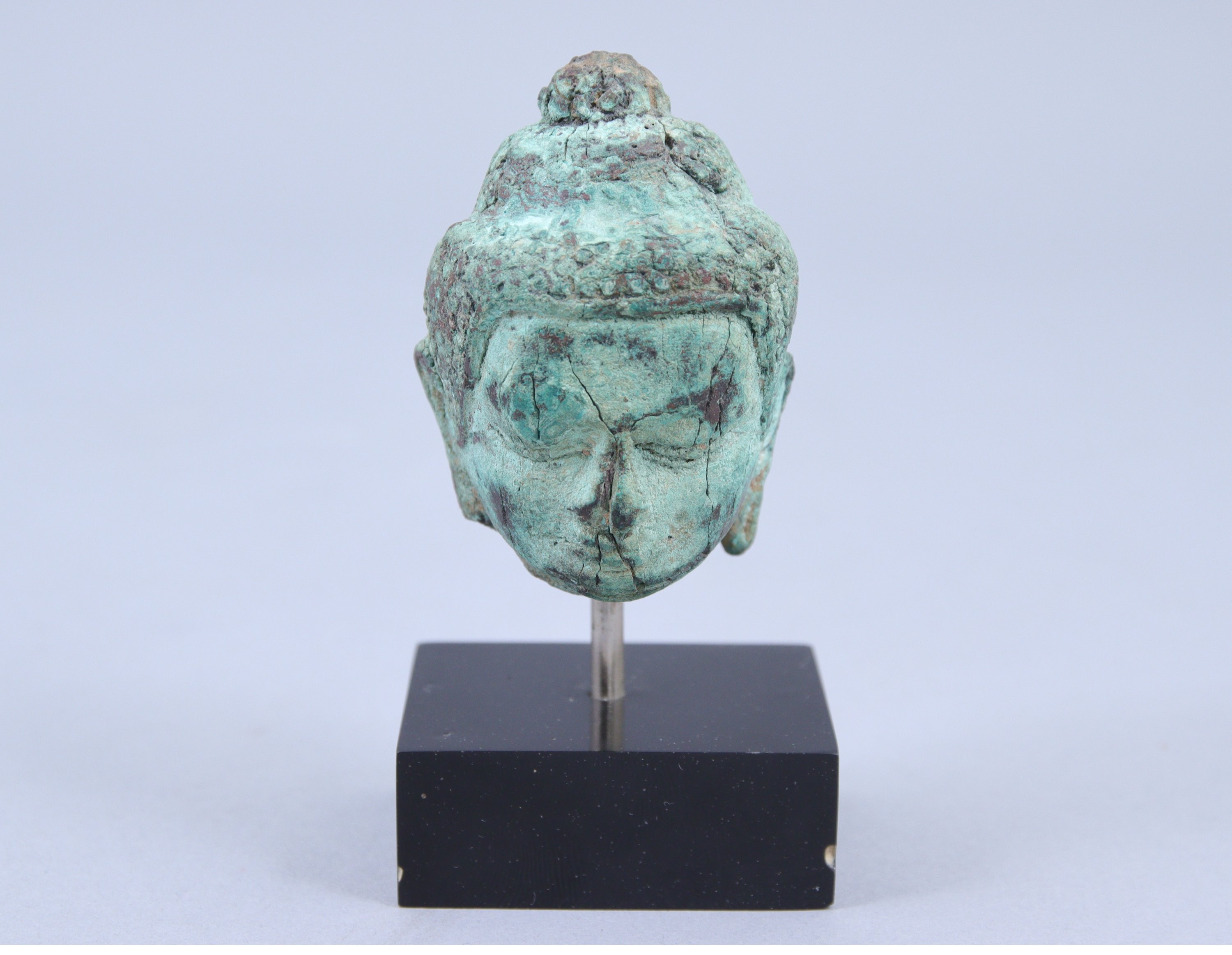 en bronze, l'une à patine verte, la coiffe bouclée et surmontée de l'ushnisha, l'autre à patine brune ornée d'une tiare.