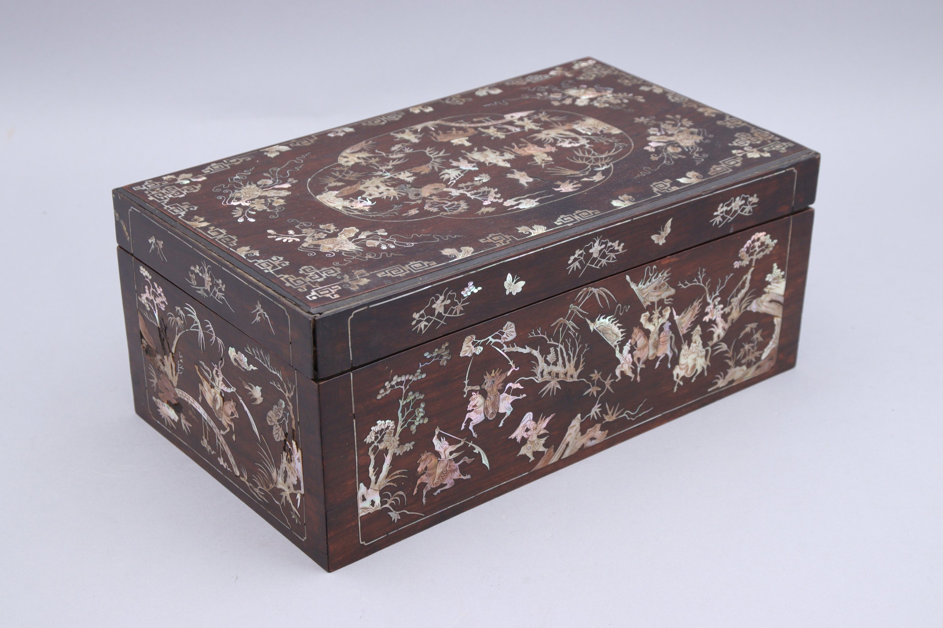 en bois et marqueterie de nacre. Le couvercle à décor d’un médaillon polylobé figurant une chasse. Il est entouré de motifs végétaux et poissons. Chacun des côtés figure des hommes à cheval.