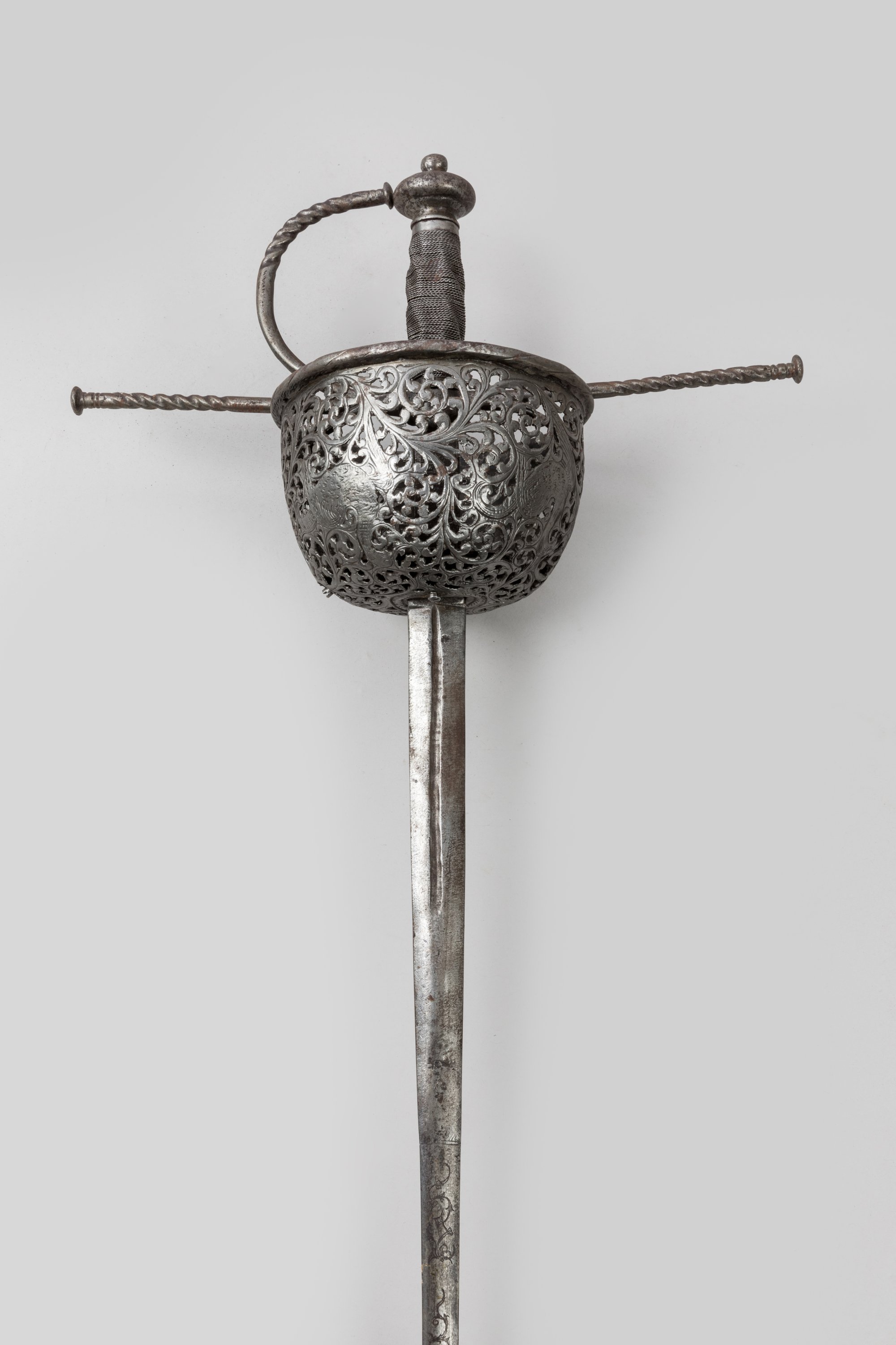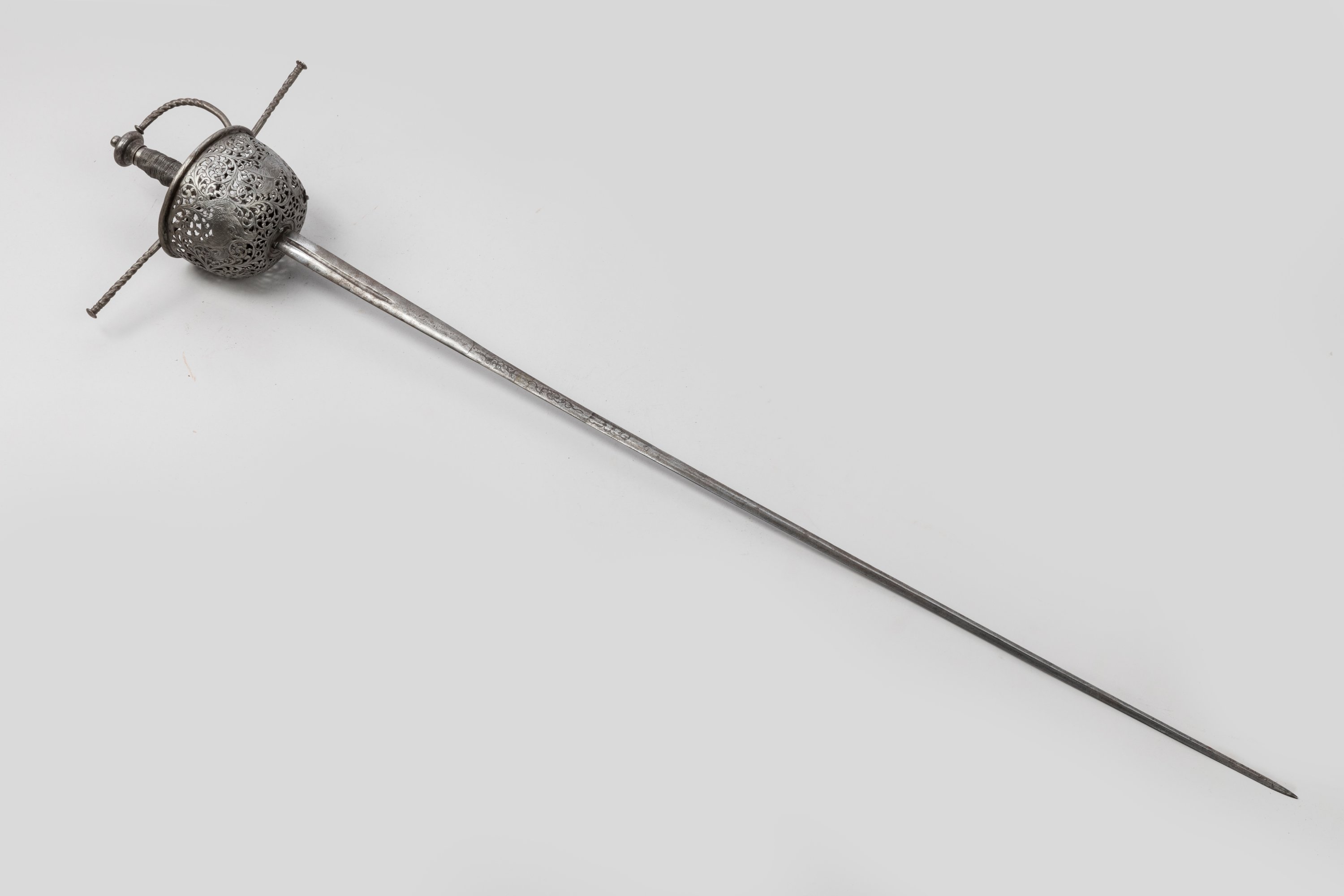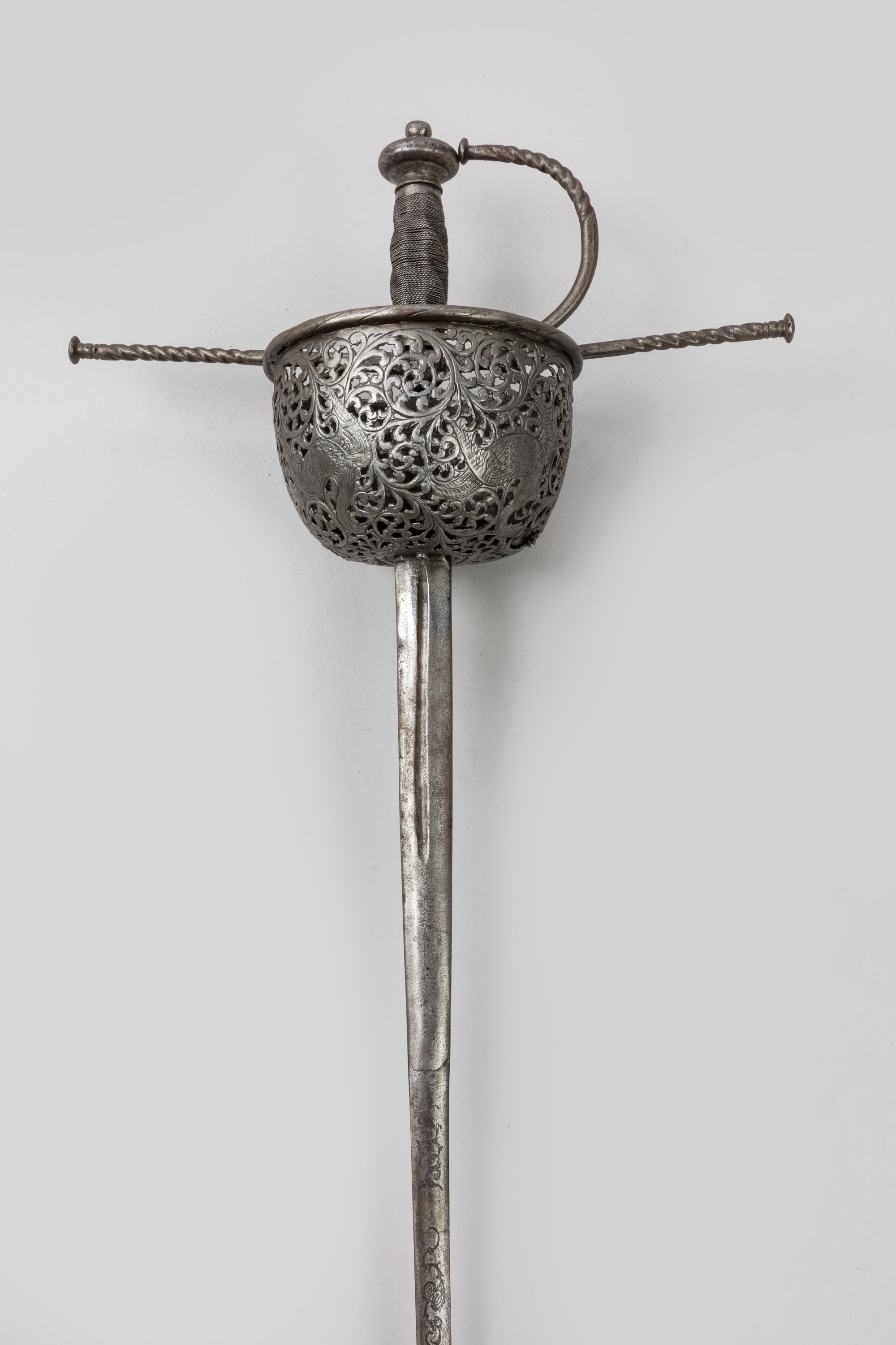 Monture en fer forgé. Fusée filigranée de fer (postérieure). Pommeau sphérique en oignon, à arc de jointure et deux longs quillons droits à décor torsadé. Coquille hémisphérique finement décorée d’oiseaux sur fond feuillagé, le tout ciselé et repercé à jours. Belle lame à gouttière au talon, en partie gravée.