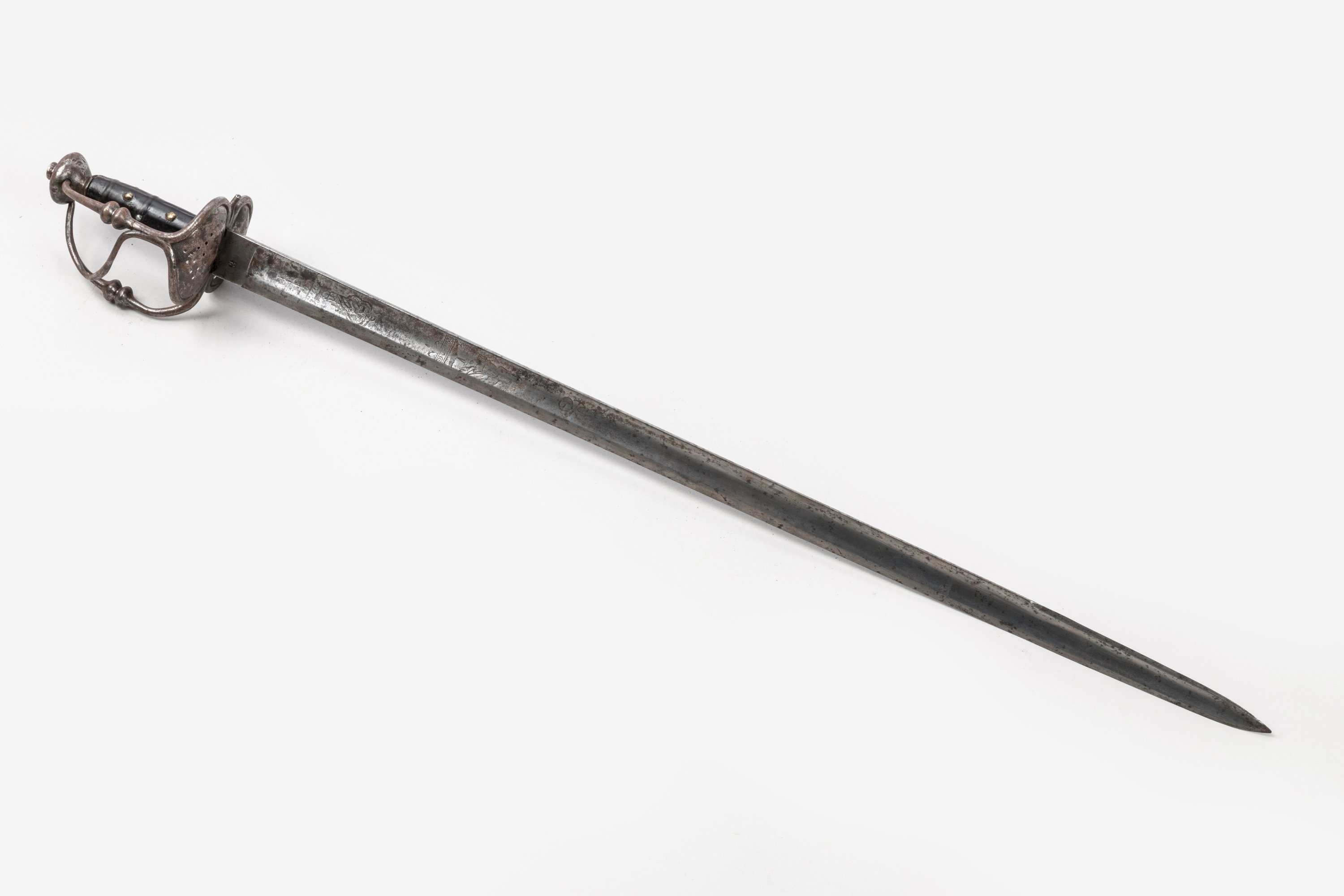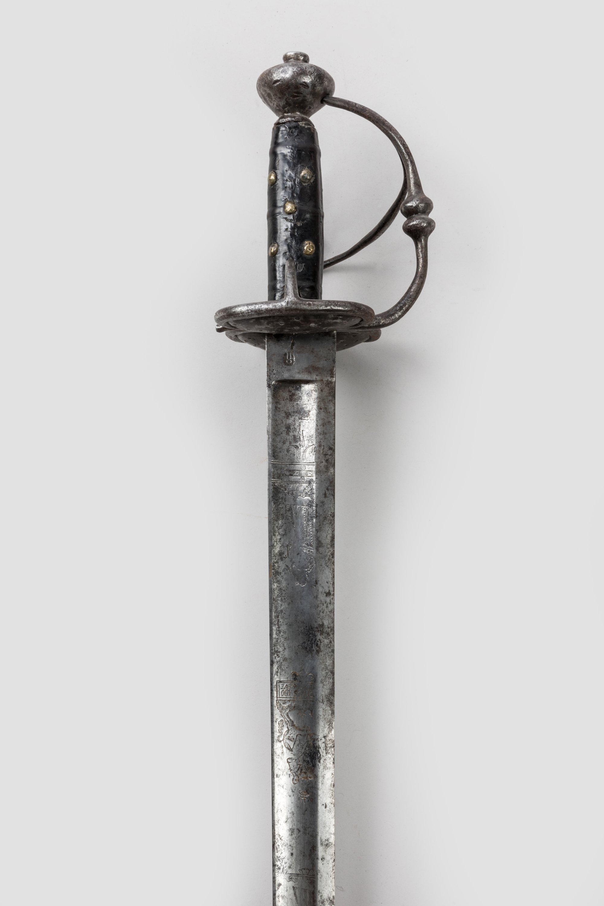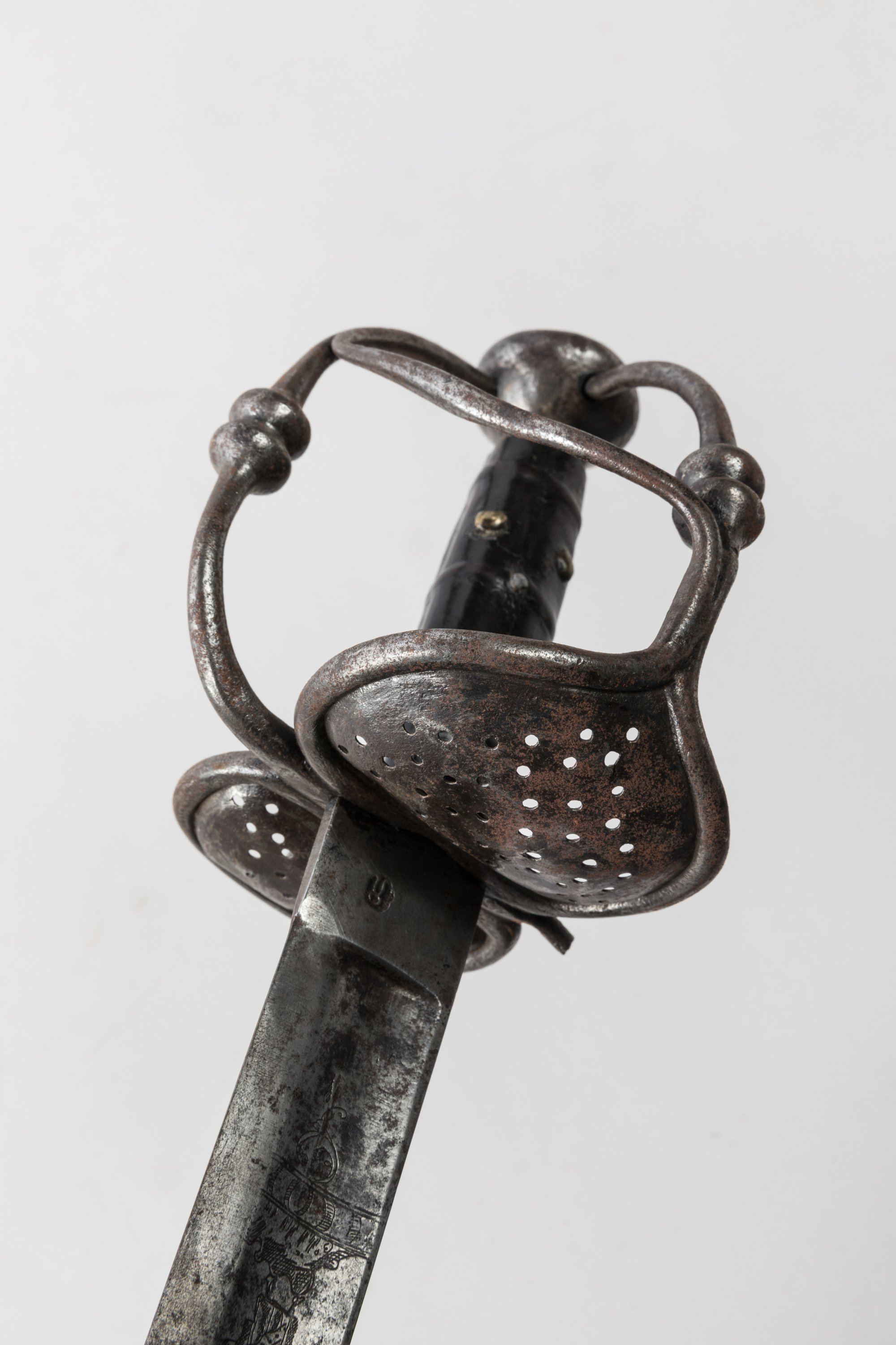 Pommeau en oignon. Monture en fer forgé, garde à trois branches et coquille repercée. Fusée en cuir clouté de cuivre. Lame à dos et pans creux, gravée de personnages allégoriques et de la mention « Solie deo gloria ». Talon poinçonné.