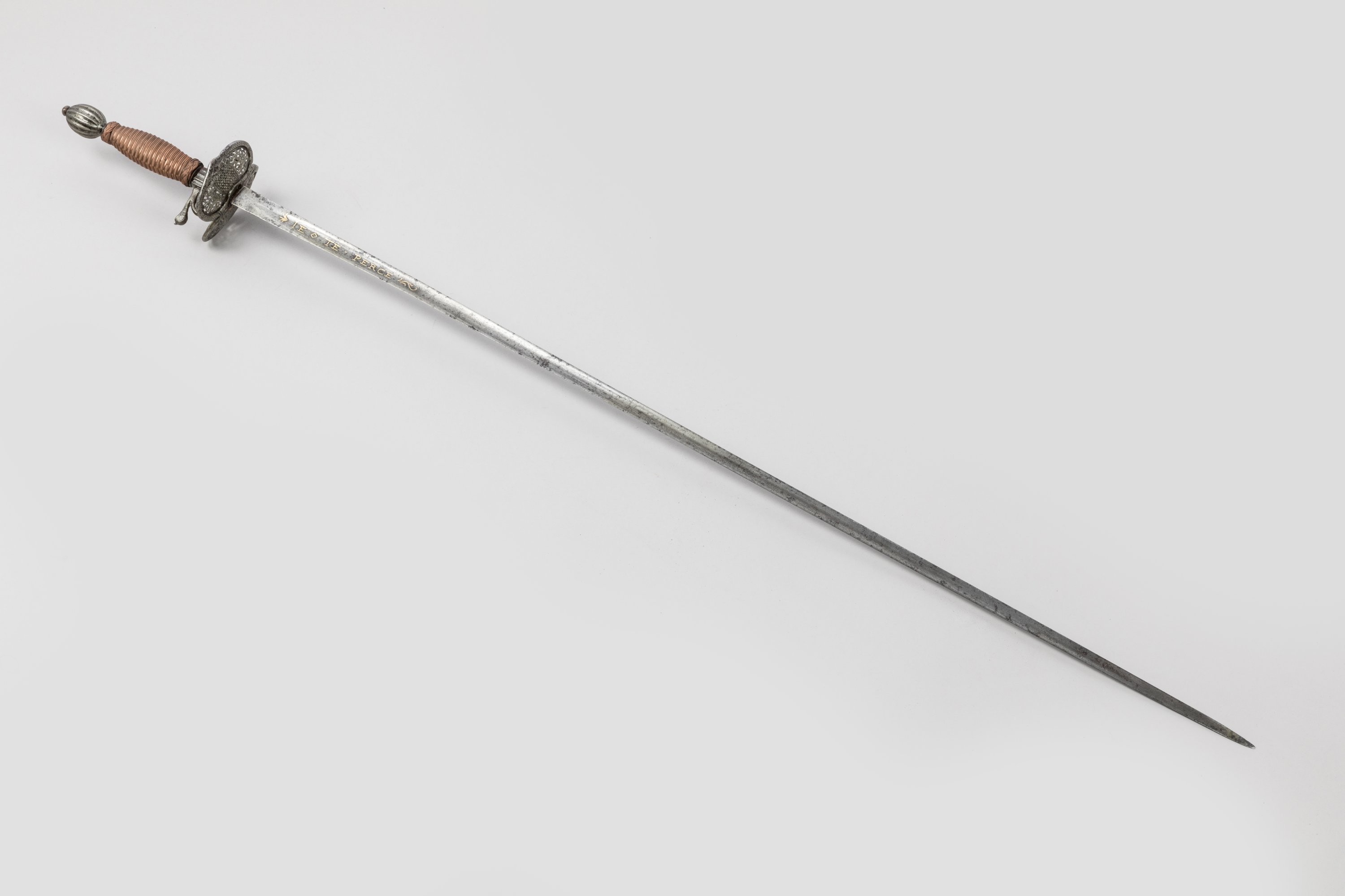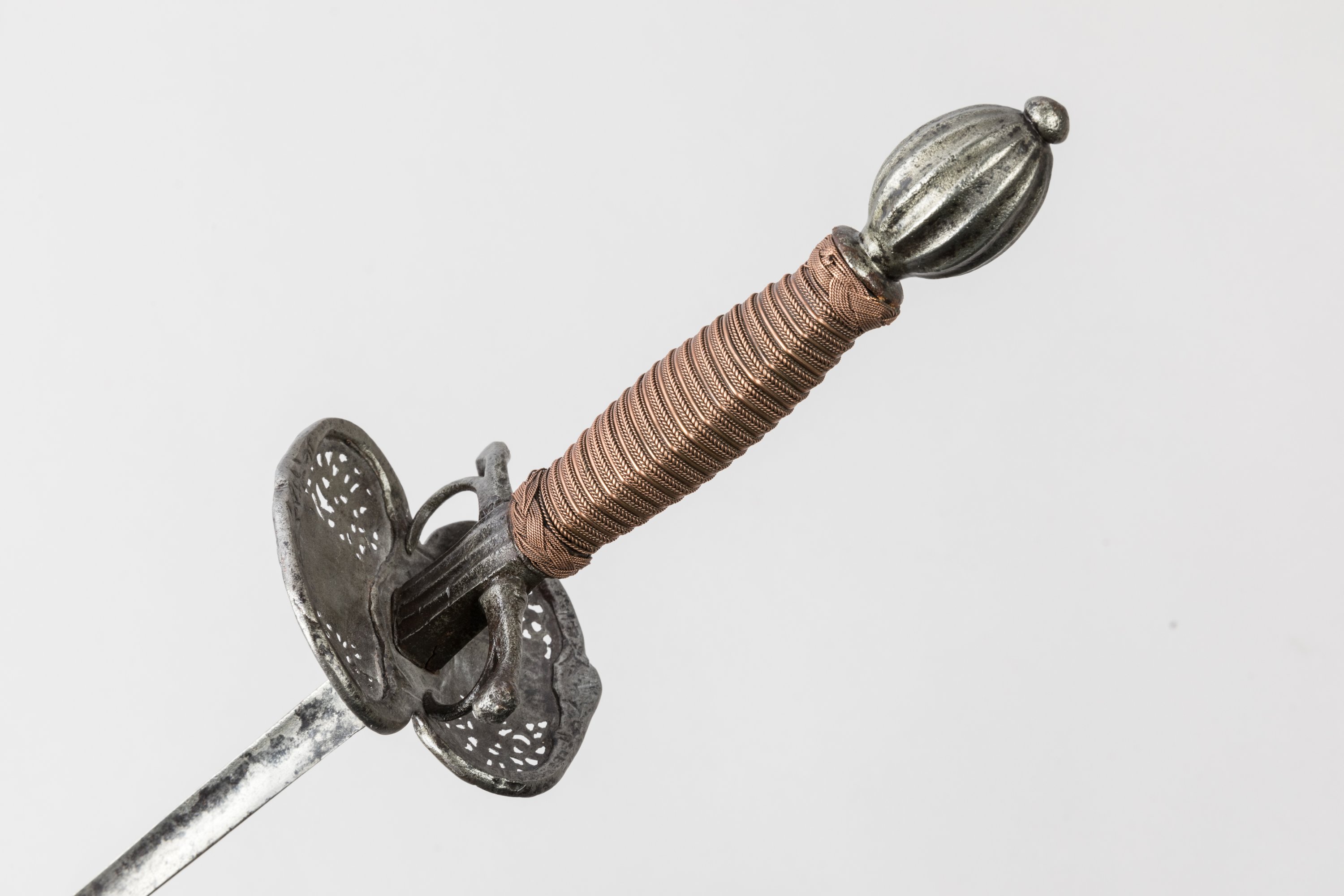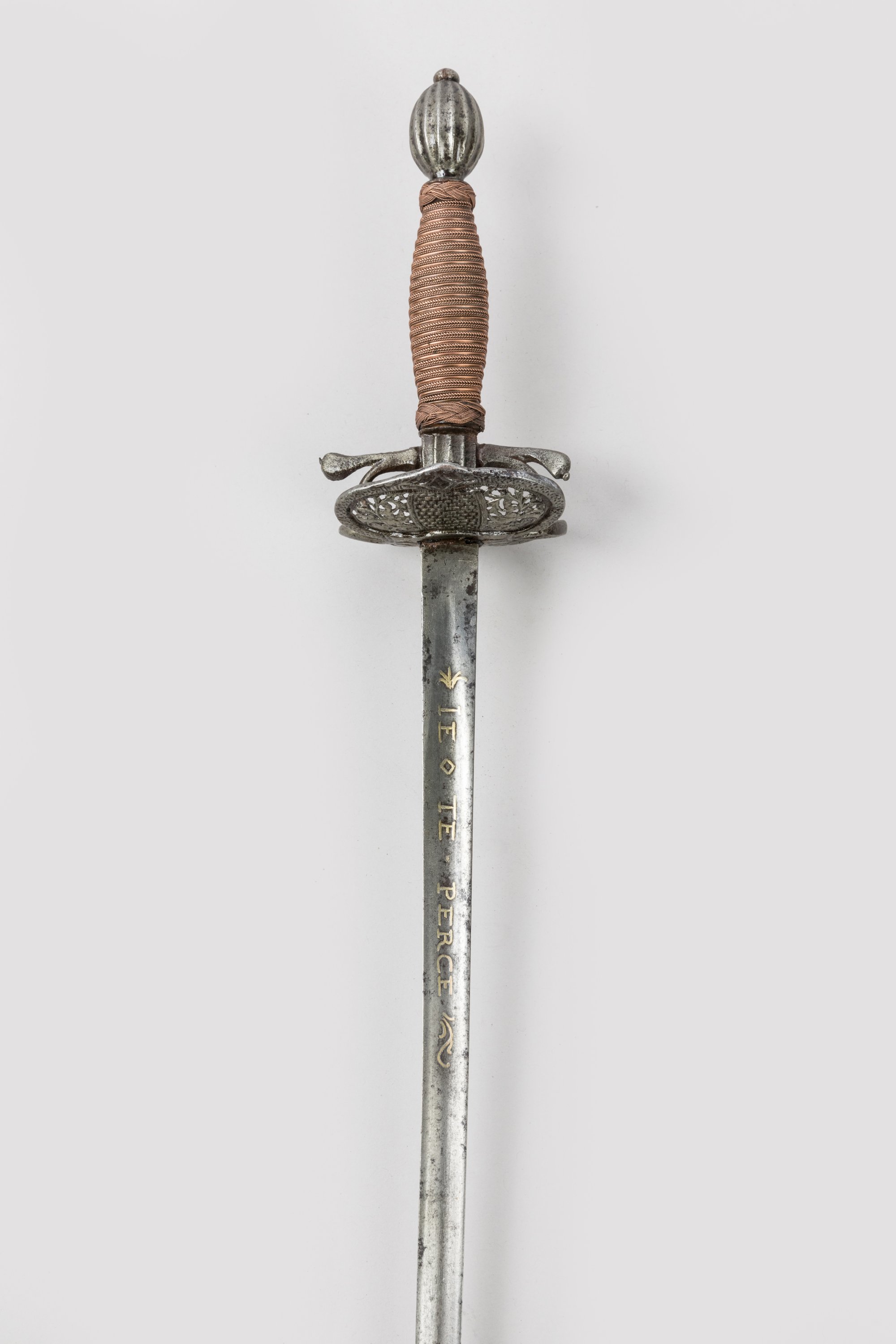 Pommeau en olive à côtes de melon. Monture en fer forgé. Fusée filigranée de cuivre. Garde à pas d’âne ornée de deux coquilles à jours décorées de feuillages et serpents. Lame triangulaire, incrustée « JE TE PERCE ».