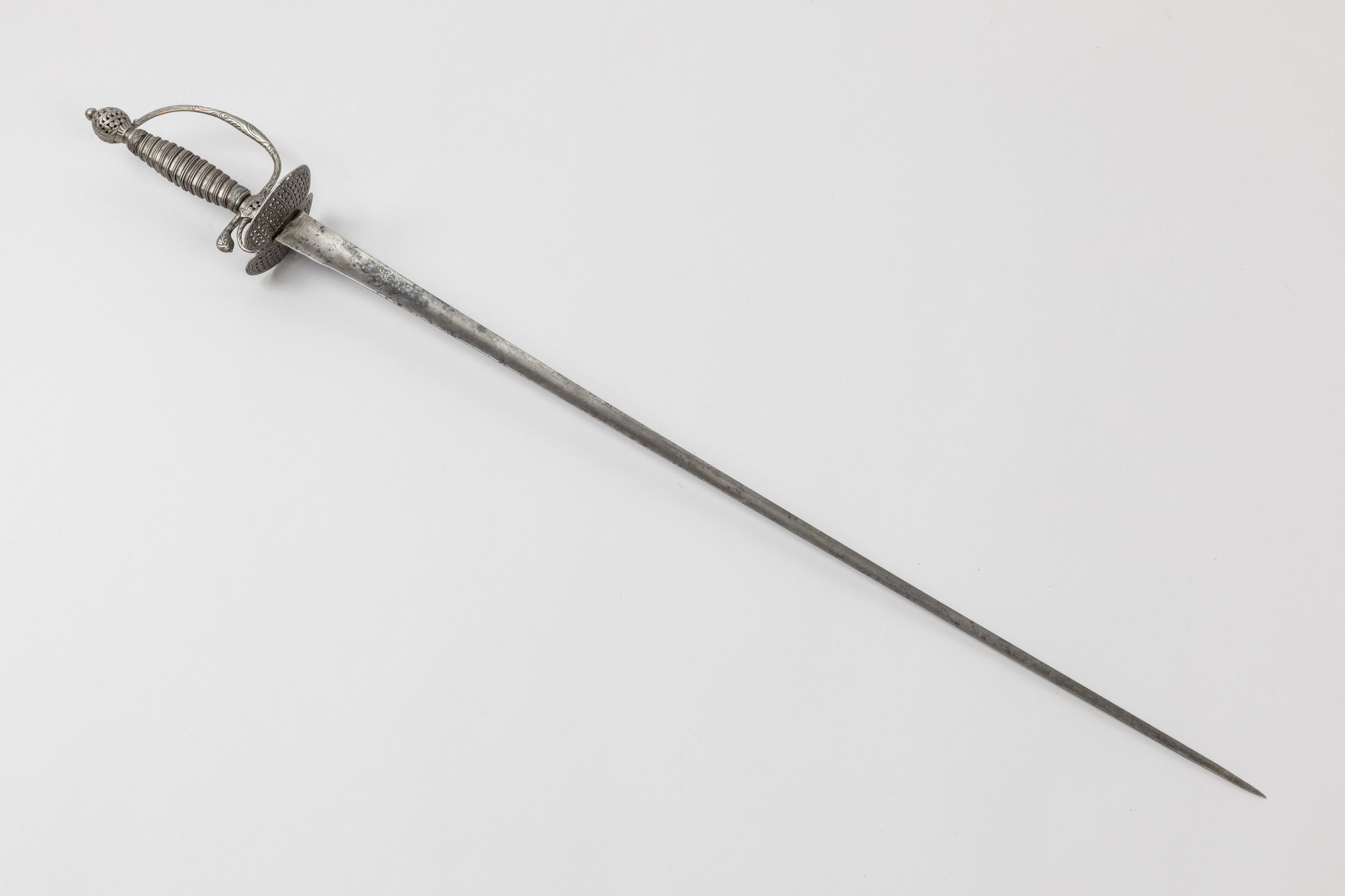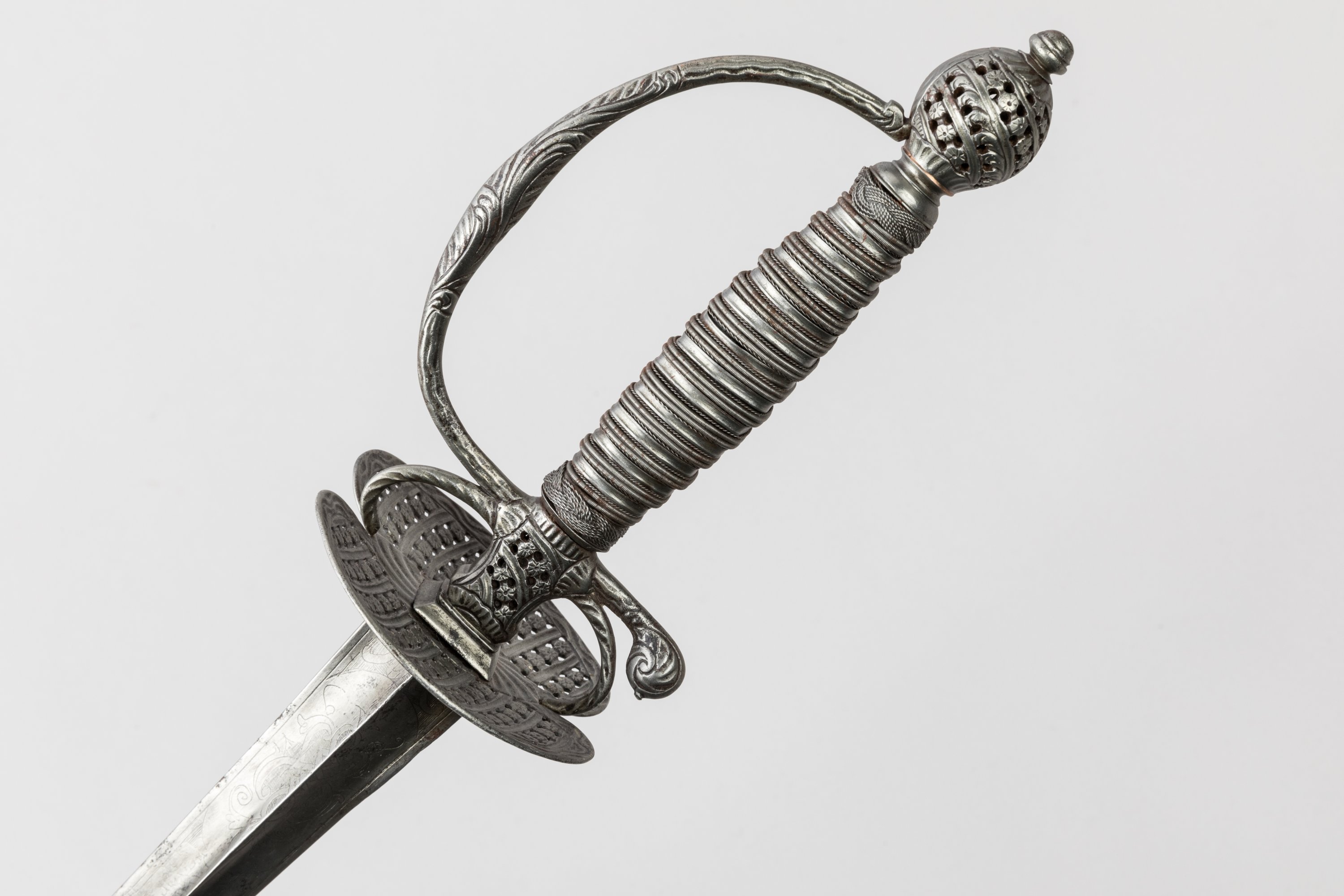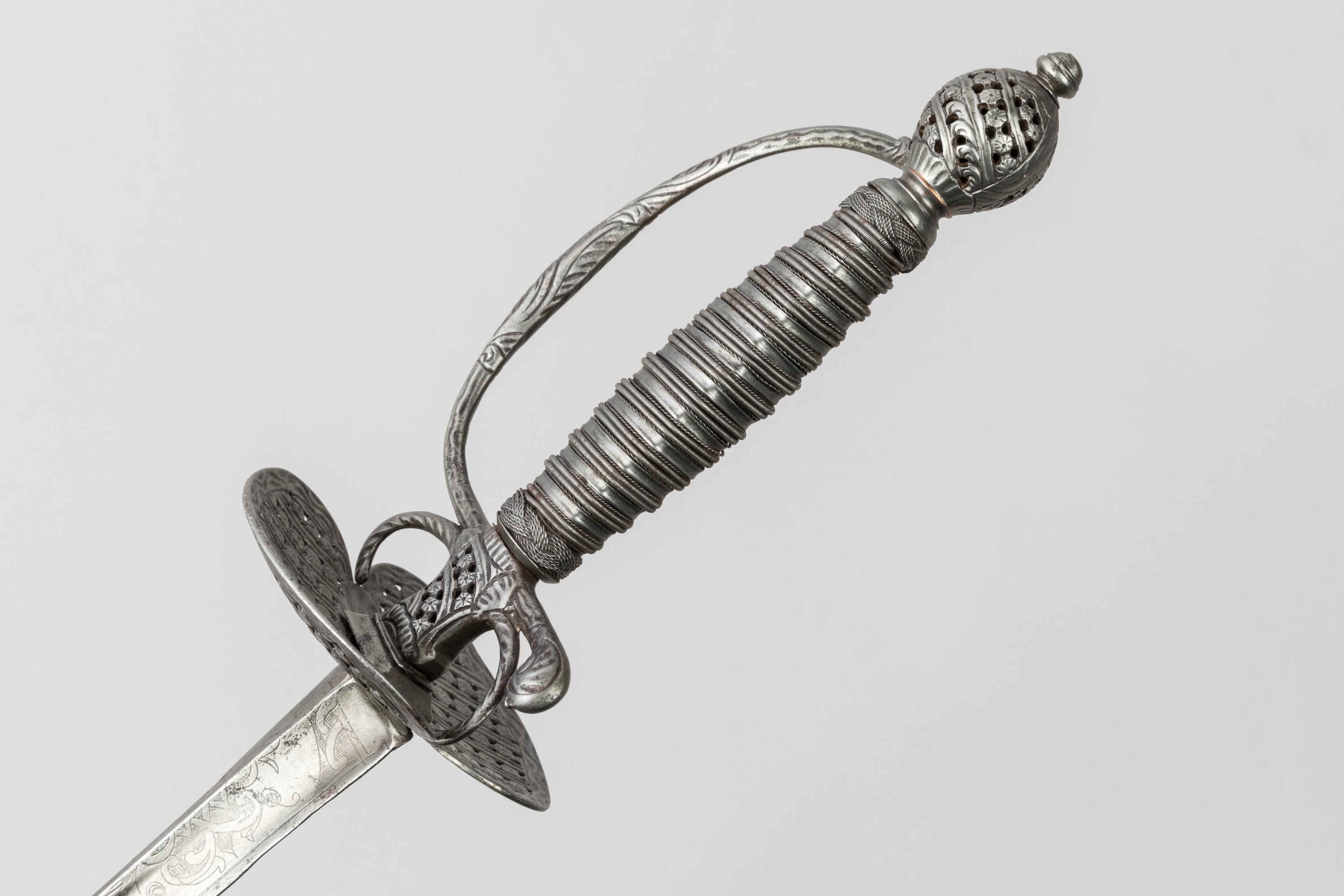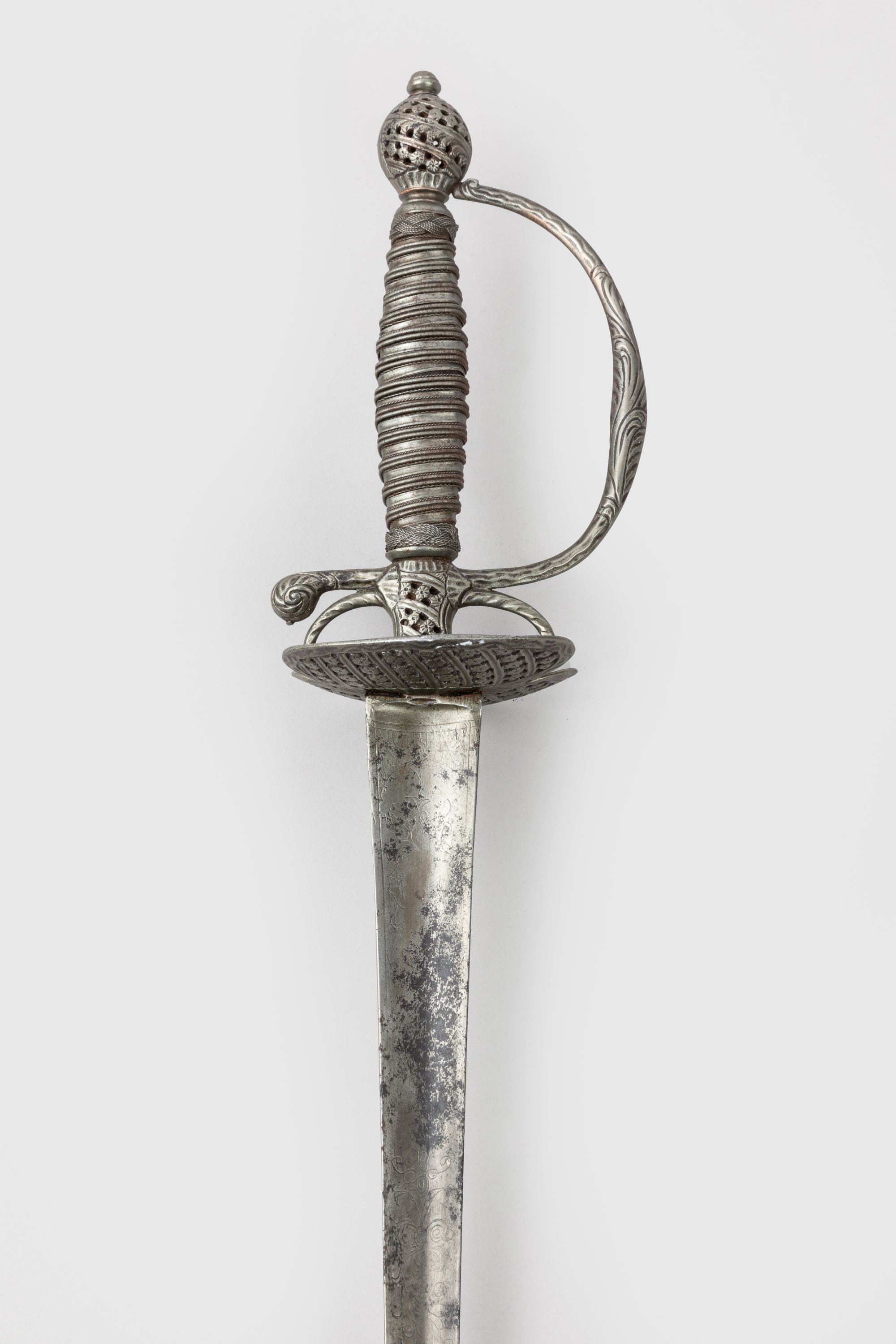 Fusée filigranée et lamée de fer. Pommeau, branche de garde et coquille bivalve a décor à jours de frises et de fleurettes. Monture en fer ciselé. Large lame triangulaire à arête médiane gravée au tiers.