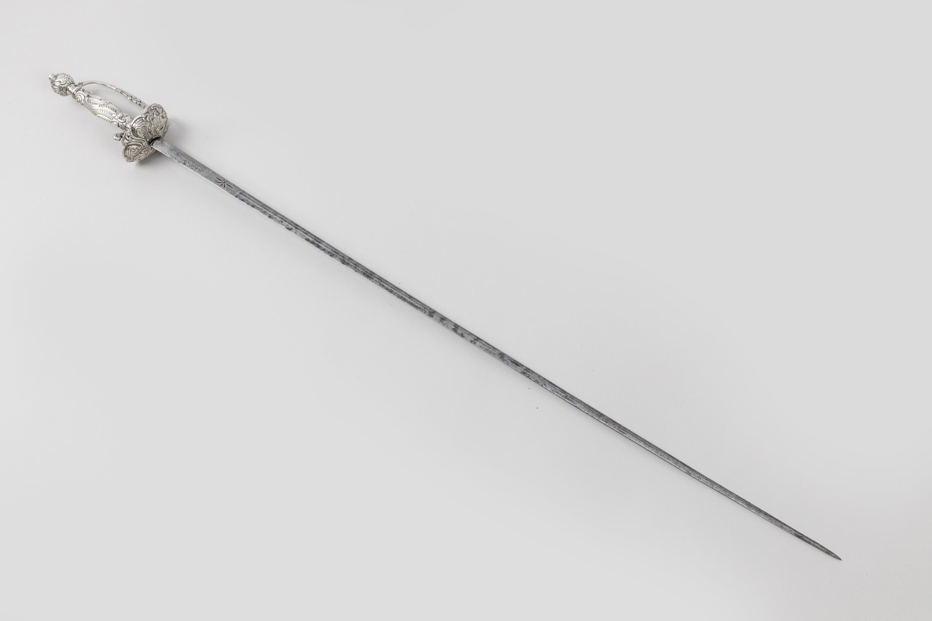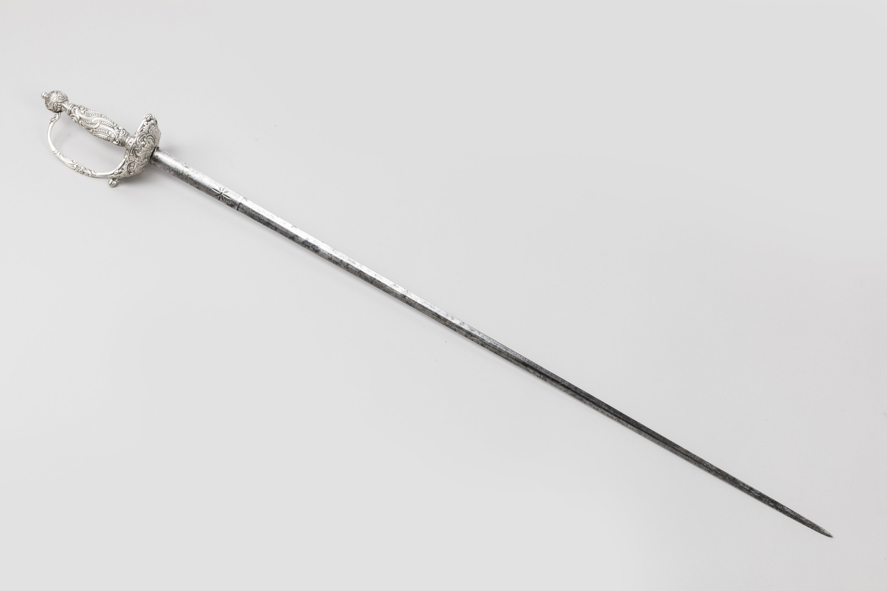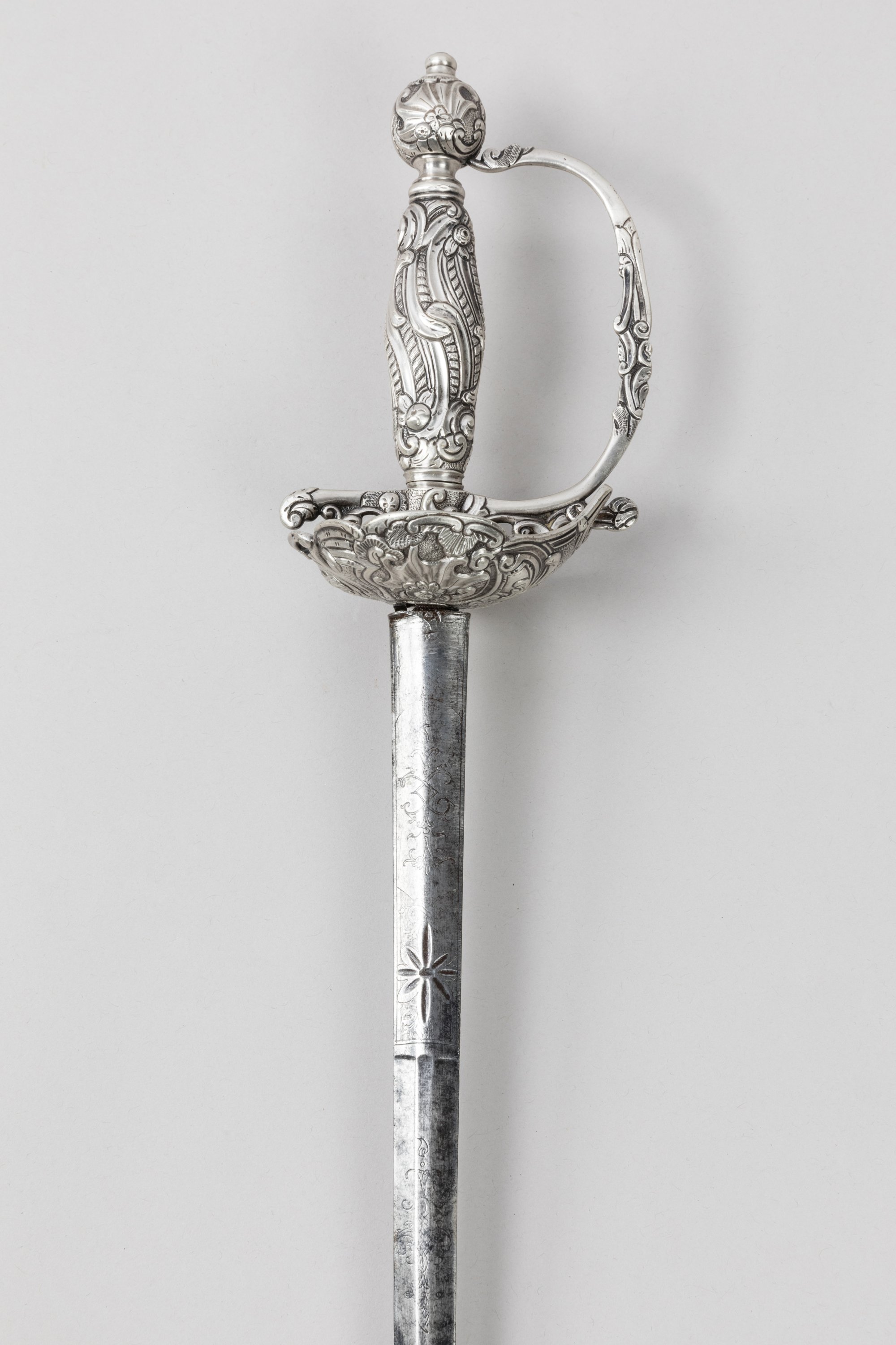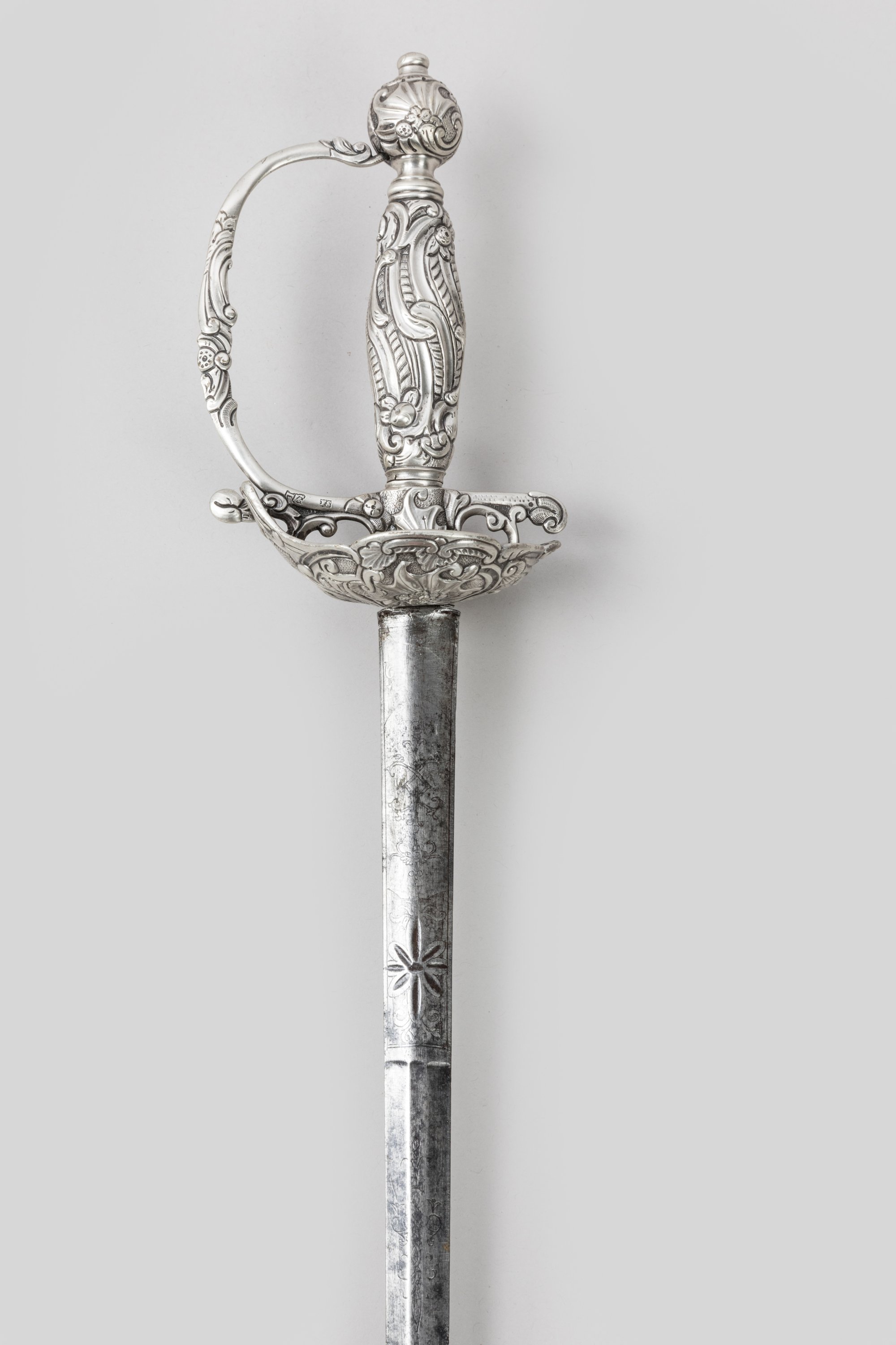Monture en argent, poinçonnée à pommeau rond, fusée, pas d’âne et coquille joliment ciselés de motifs rocaille et entrelacs. Lame à arête médiane gravée au talon.