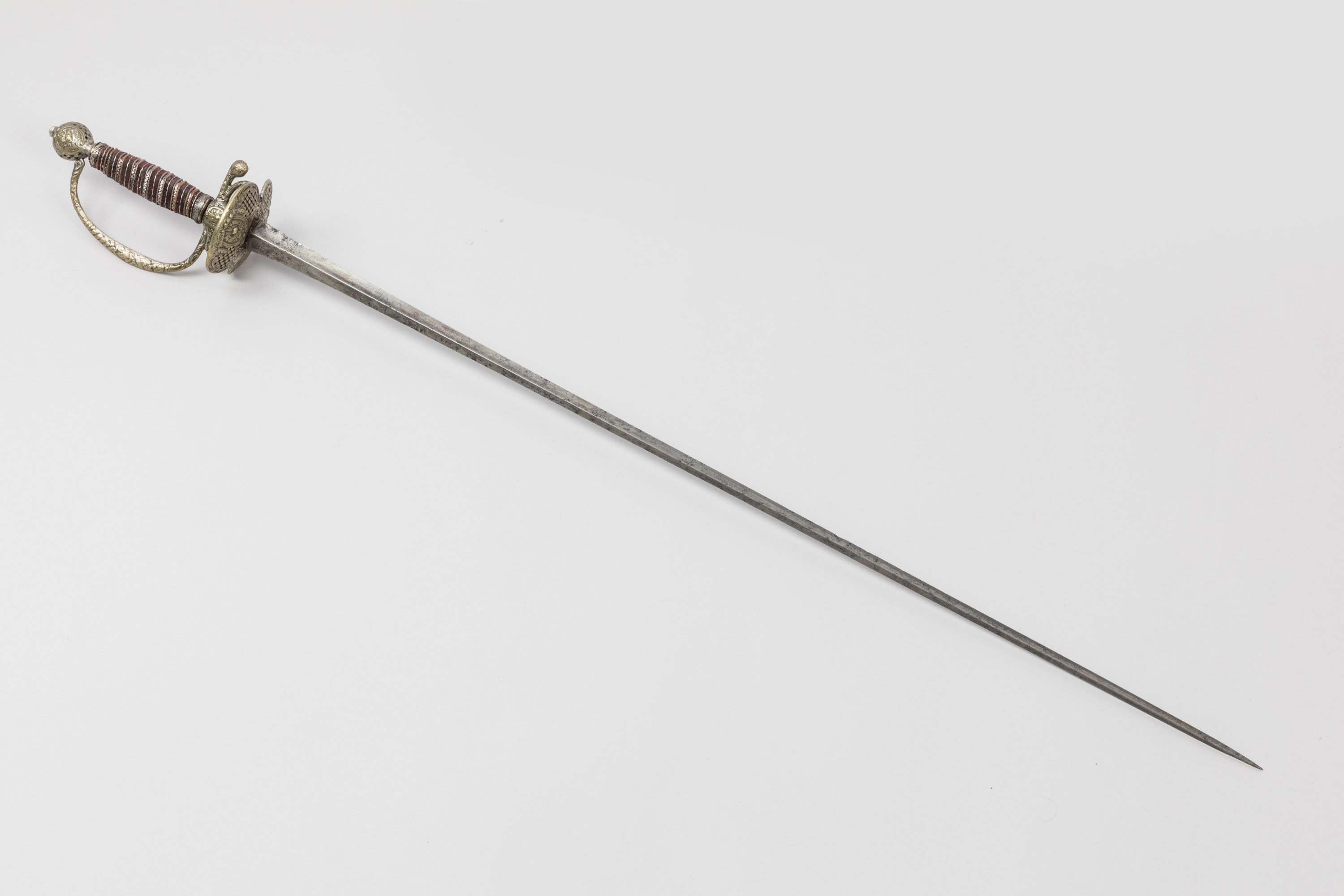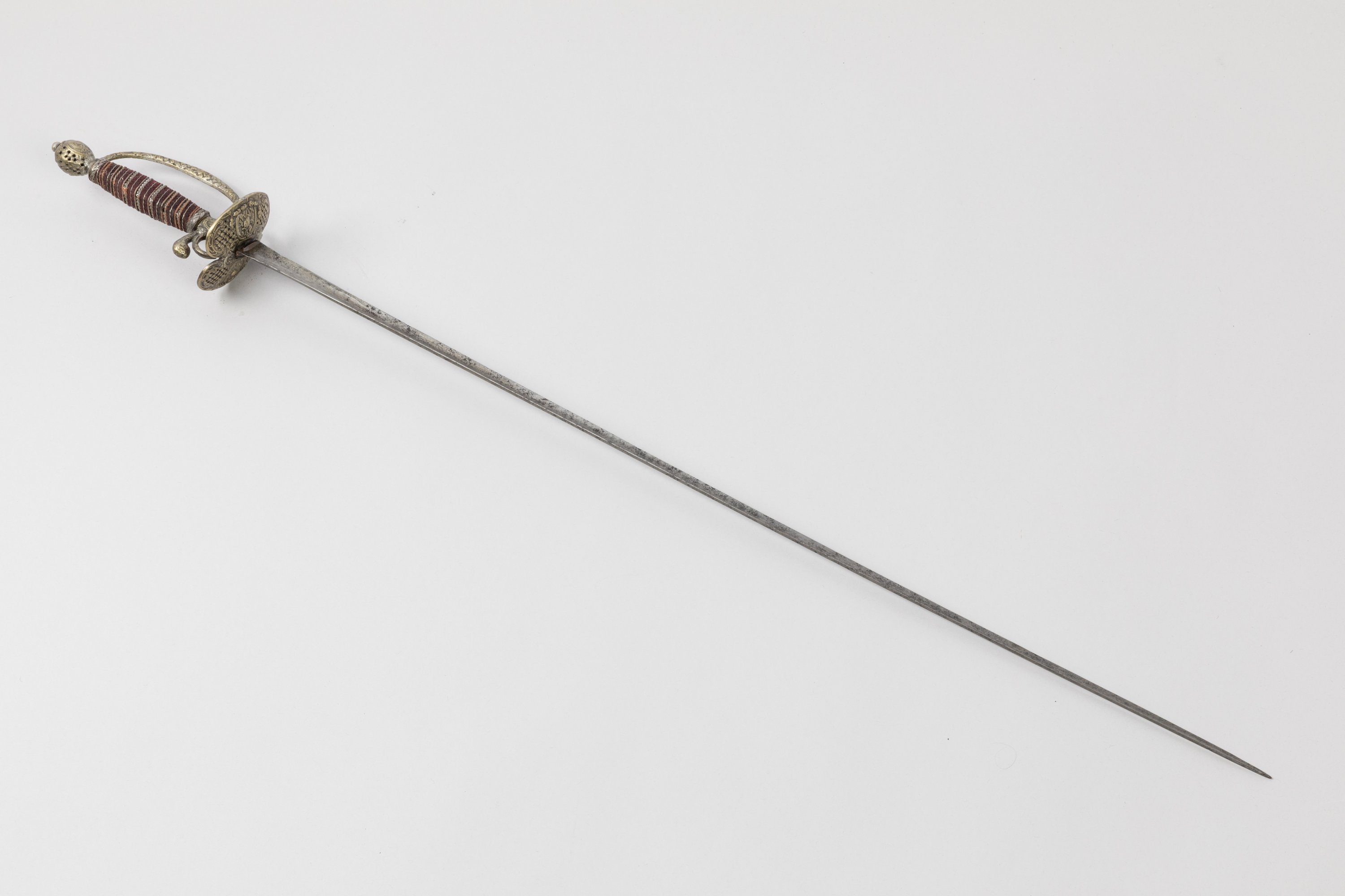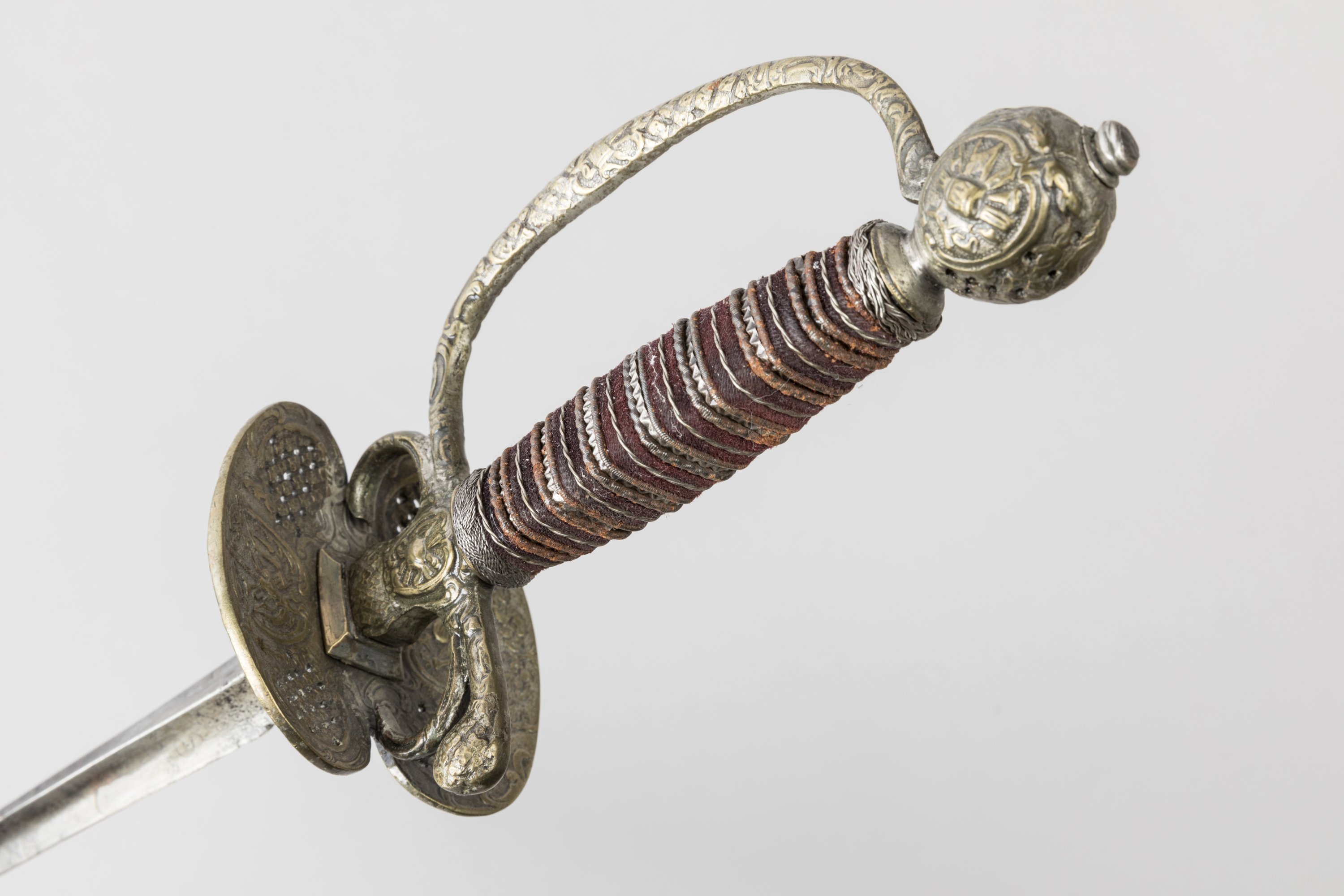 Monture en fer ciselé repercé à décor de trophées. Pommeau rond. Garde à une branche, pas d’âne et coquille à jours ornés de médaillons en suite. Fusée filigranée laiton (postérieure). Lame triangulaire.