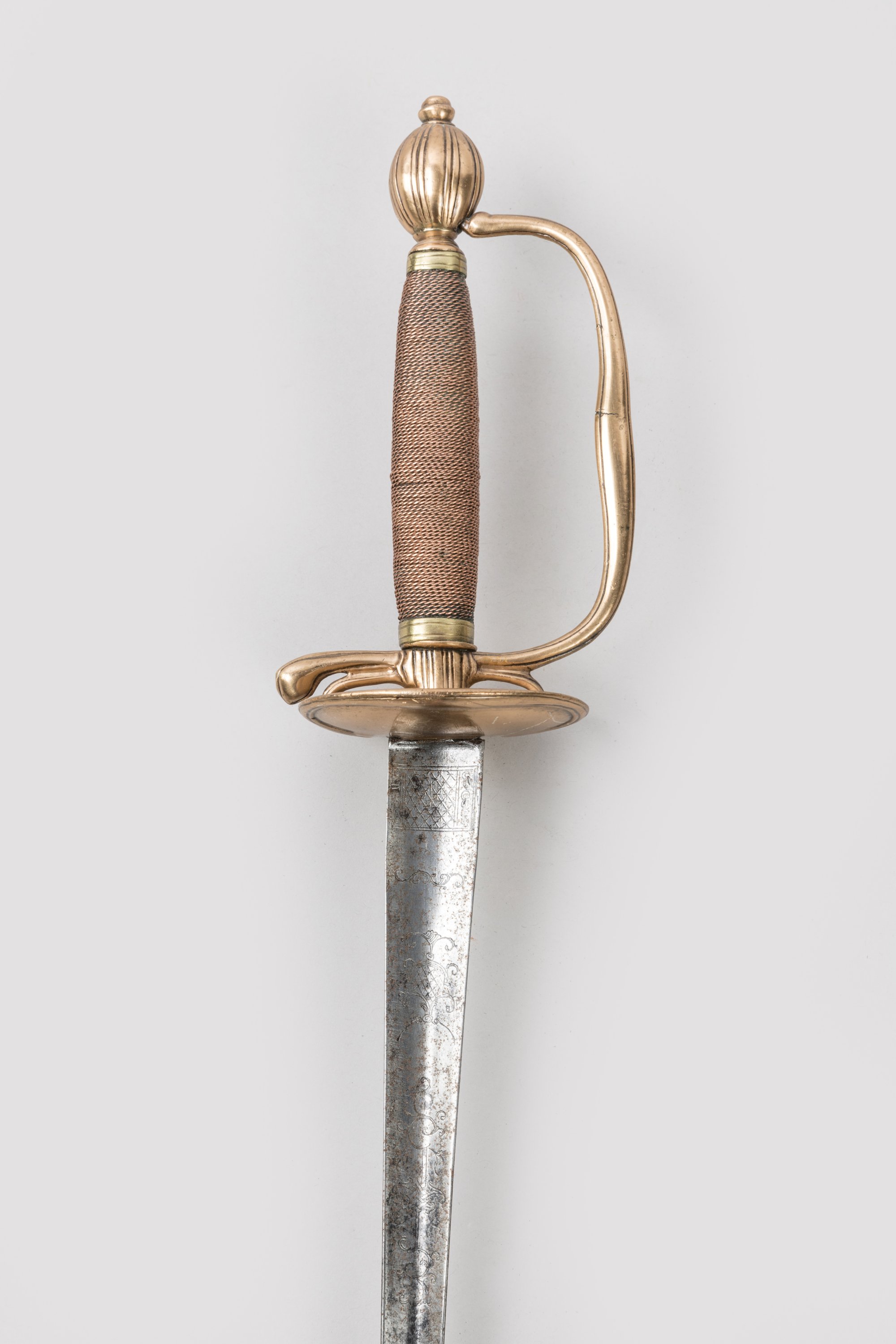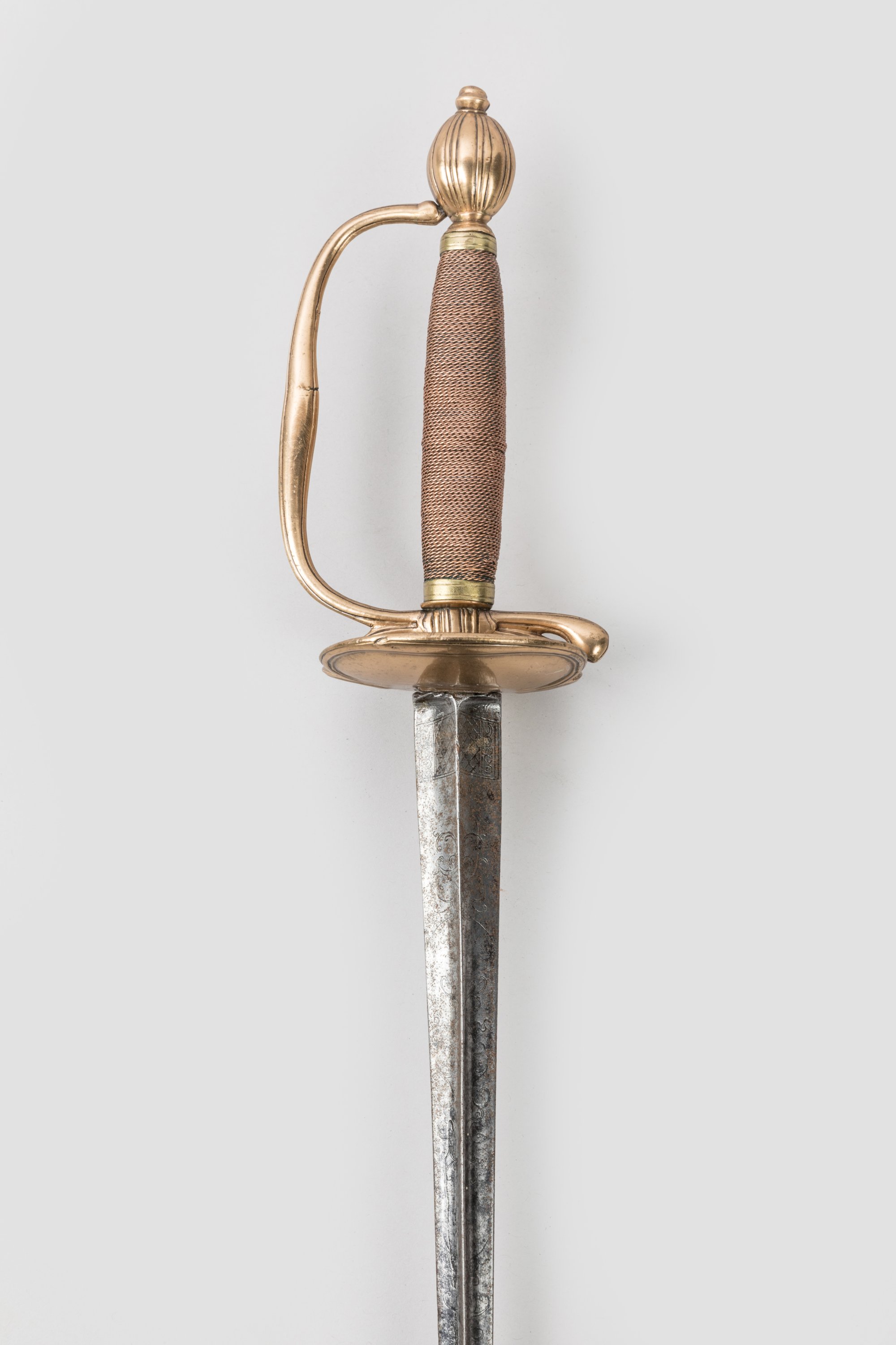 Pommeau en olive rainuré. Garde à une branche et pas d’âne et coquille bivalve à bourrelet. Fusée filigranée de cuivre. Lame triangulaire gravée au tiers.