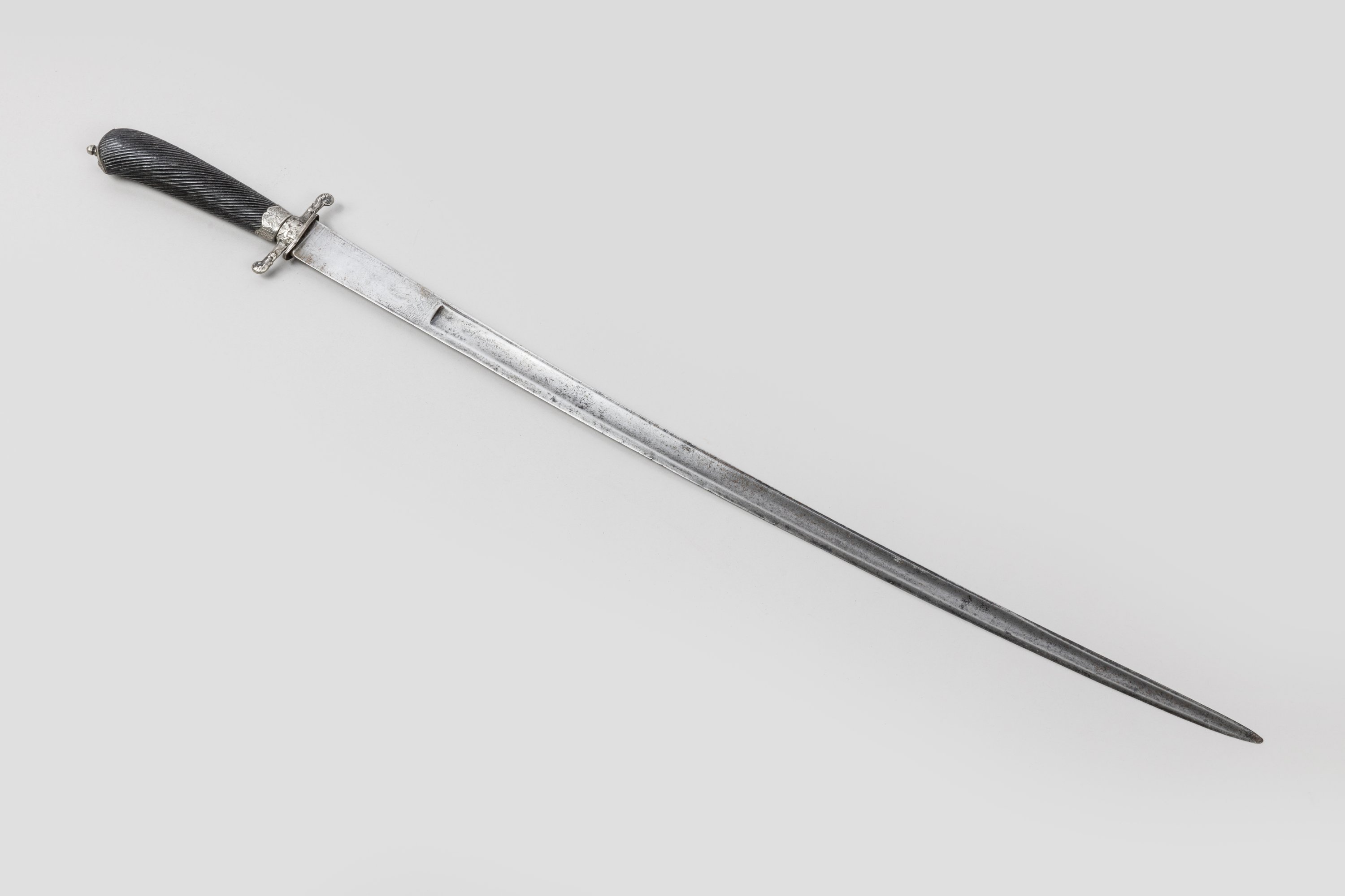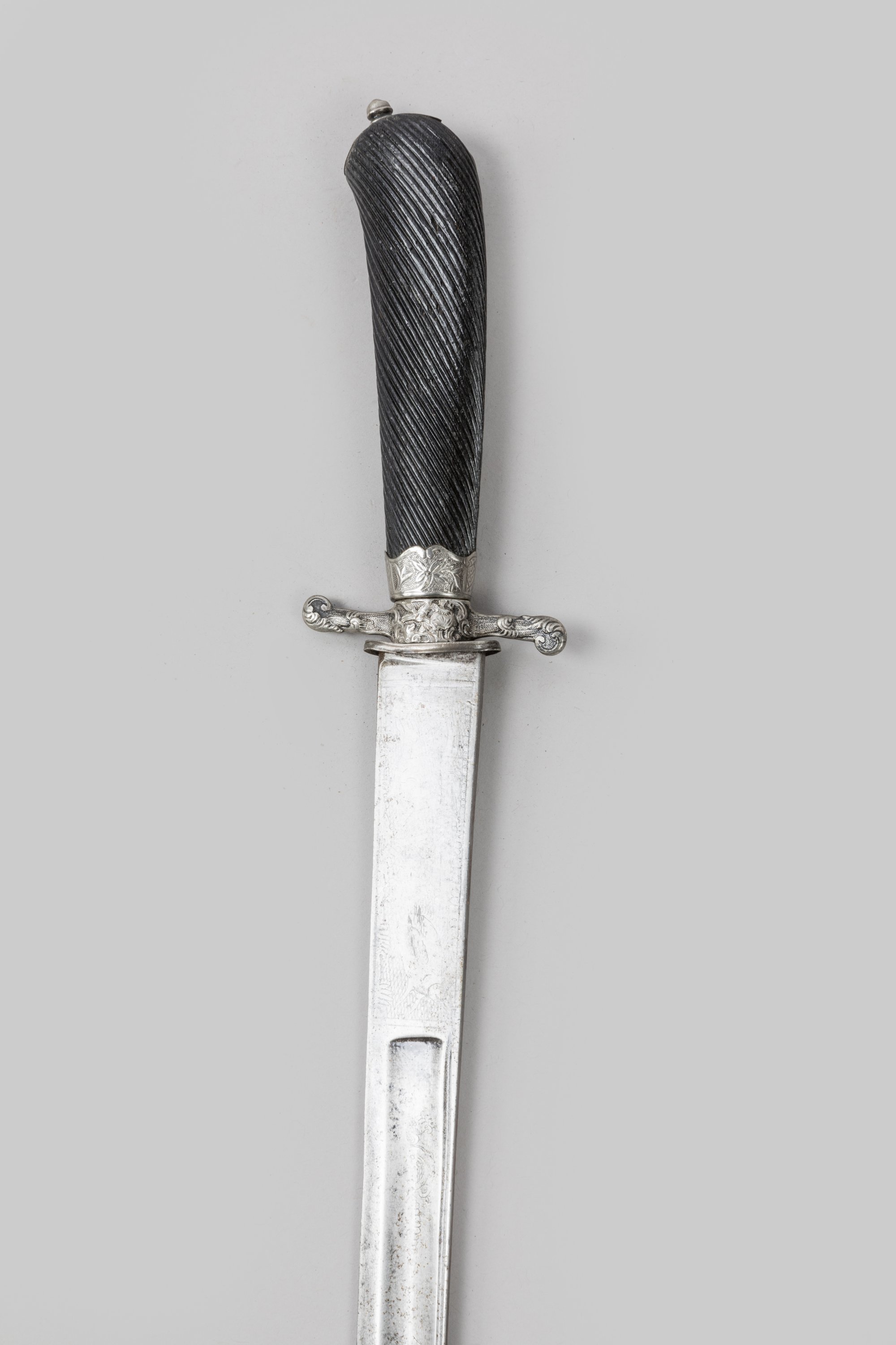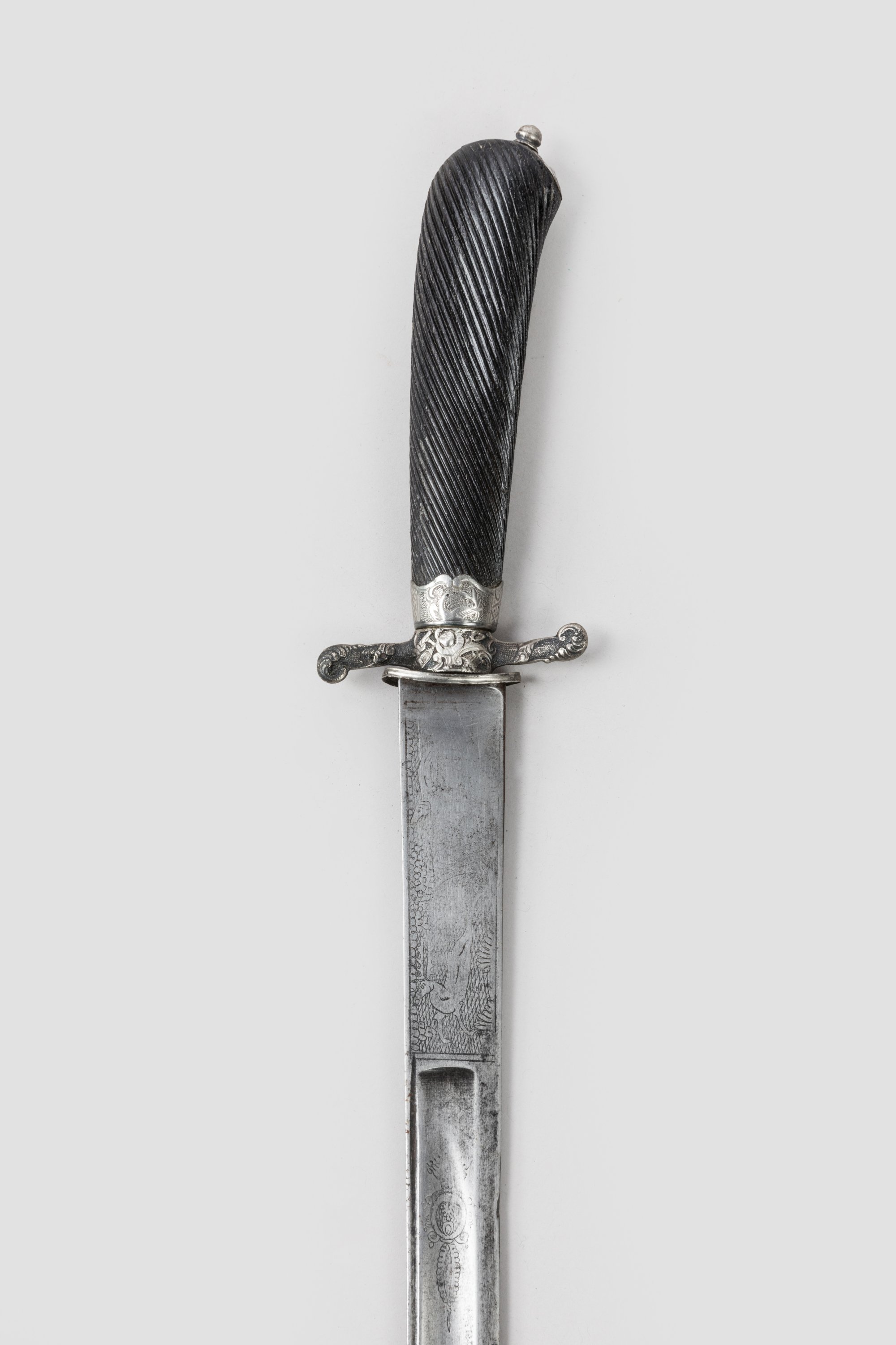 Monture en argent, garde à deux quillons. Fusée en ébène spiralé. Lame cintrée, gravée d'animaux et rinceaux.