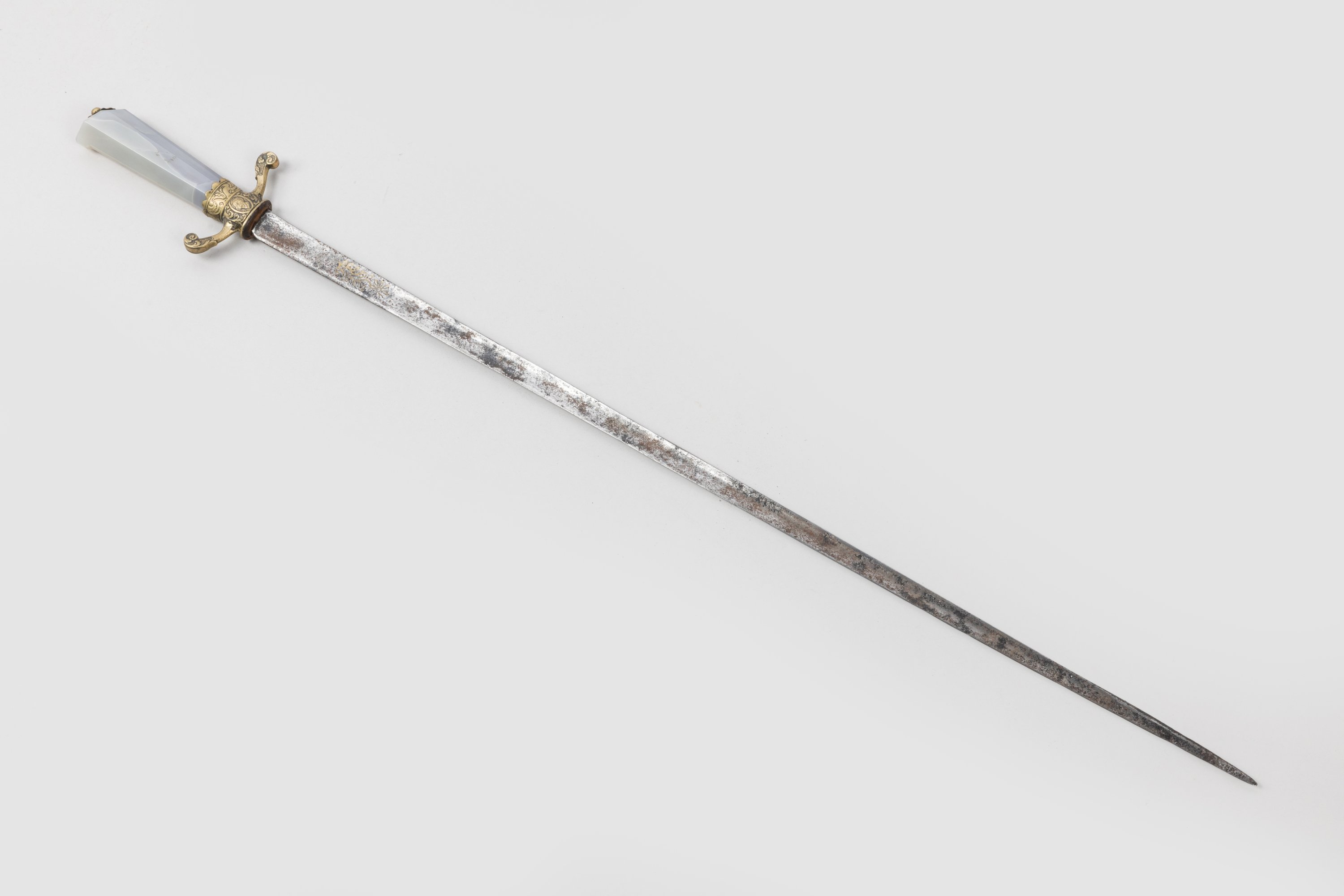 Poignée en pierre dure taillée à pans. Monture et garde en laiton à deux quillons, nœud de corps ciselé de têtes à l'antique. Fine lame droite à dos arrondi à contre-tranchant.