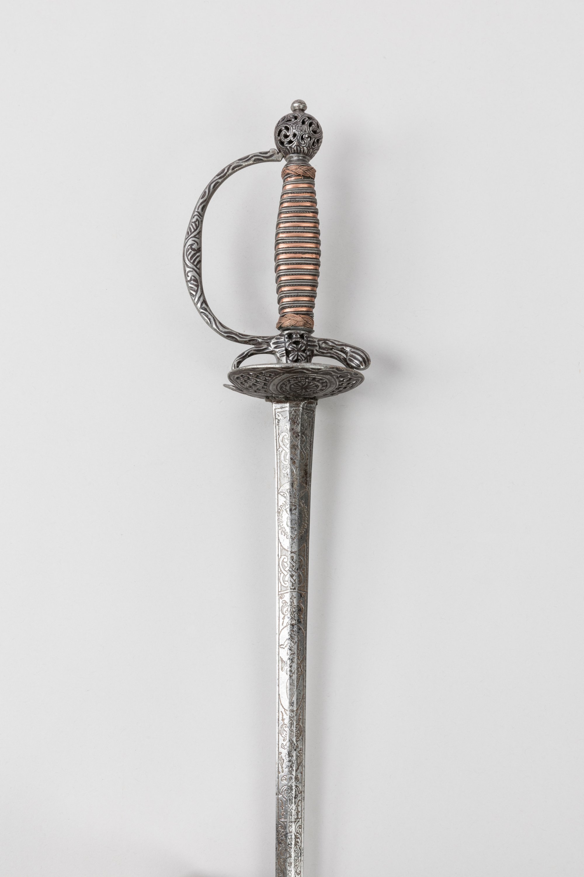 Fusée filigranée de fer et de cuivre. Monture en fer ciselé, garde à une branche, pas d’âne et coquille à jours à décor de fleurs. Lame à méplat médian entièrement gravée de médaillons, rinceaux et trophées avec restes de gravure « Soli deo ».