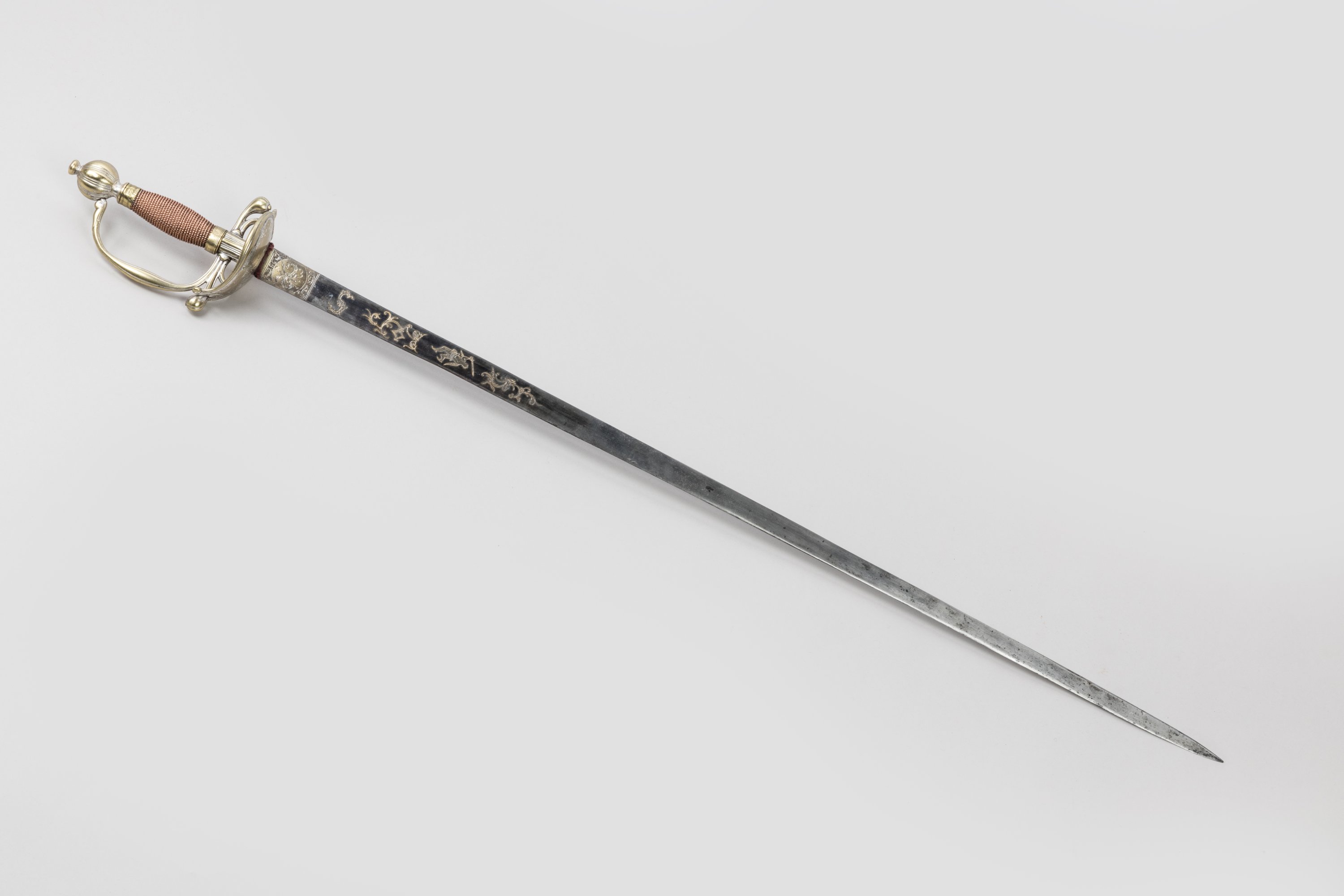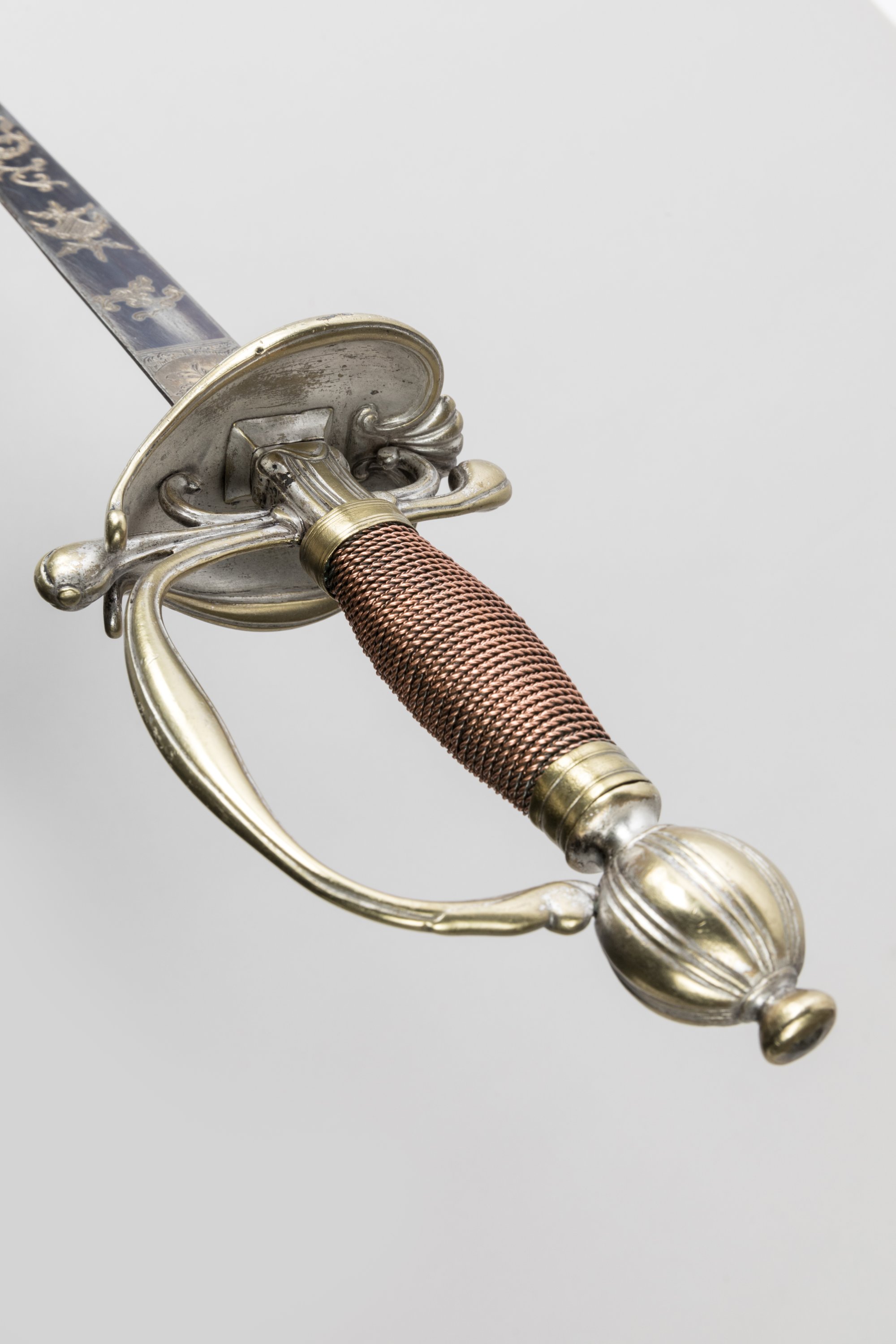Fusée filigranée de cuivre. Monture en bronze décoré au trait avec restes d’argenture. Pommeau rond, garde à une branche, pas d’âne et deux quillons boulés, et coquille. Lame à dos plat contre tranchant, gravée, dorée et bleuie au tiers.