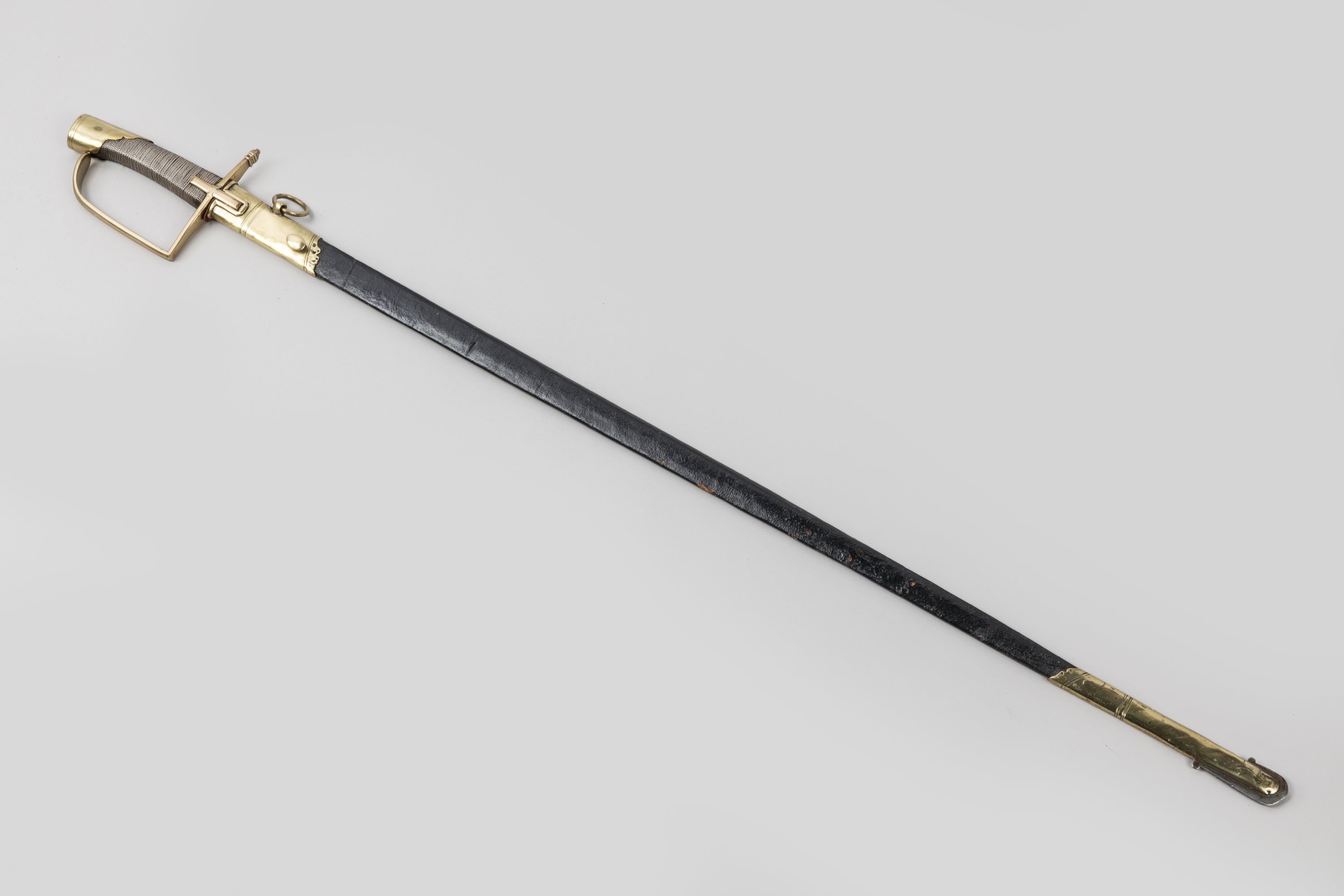 Fine lame droite à dos arrondi, gouttière et pans creux, gravée au tiers de trophées d’armes et rinceaux, sur restes de fond d’or. Fourreau en cuir à deux garnitures en laiton découpé, décoré au trait.