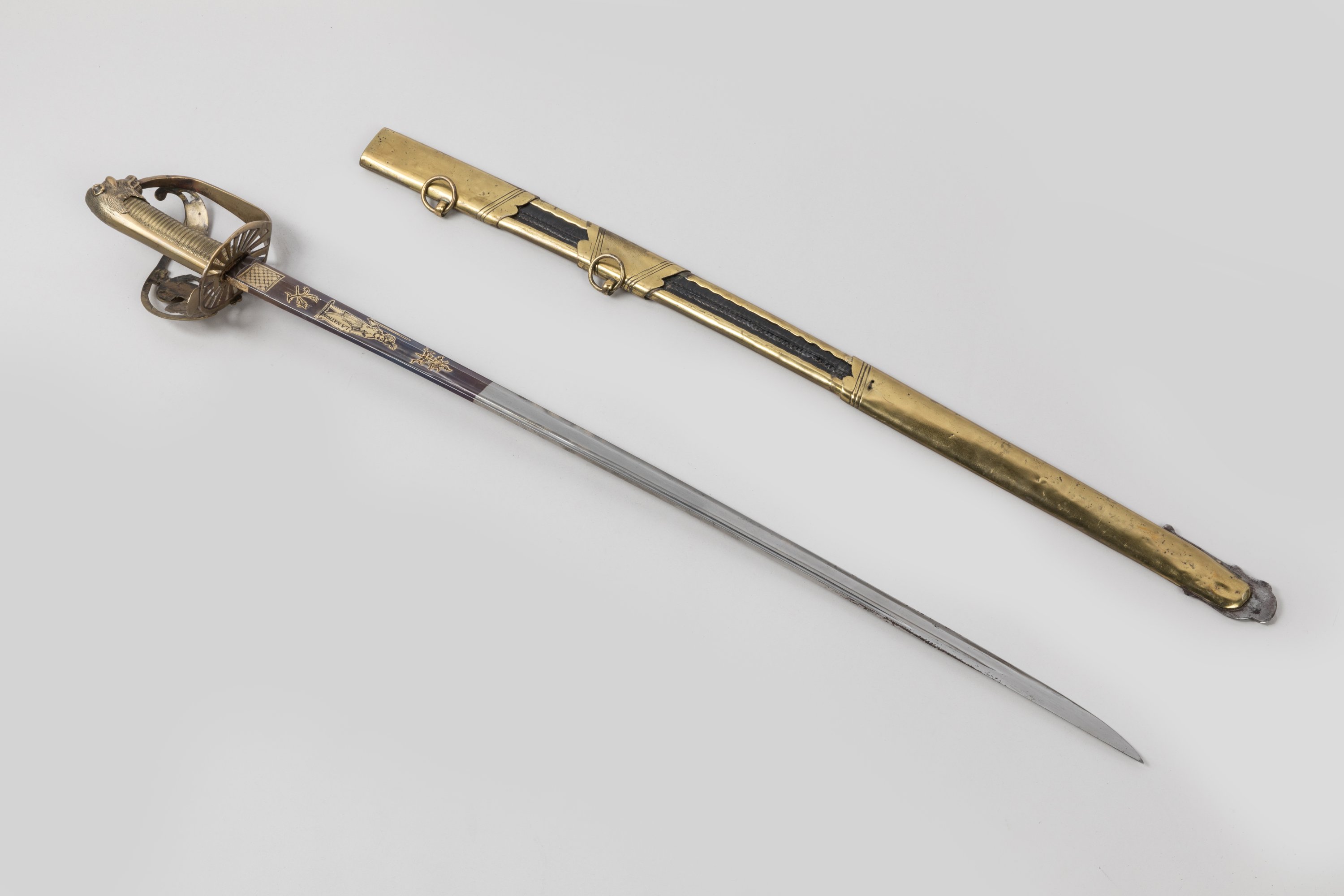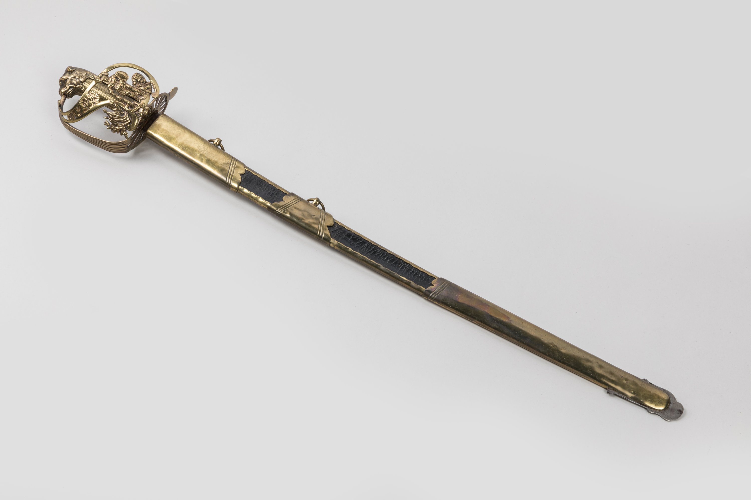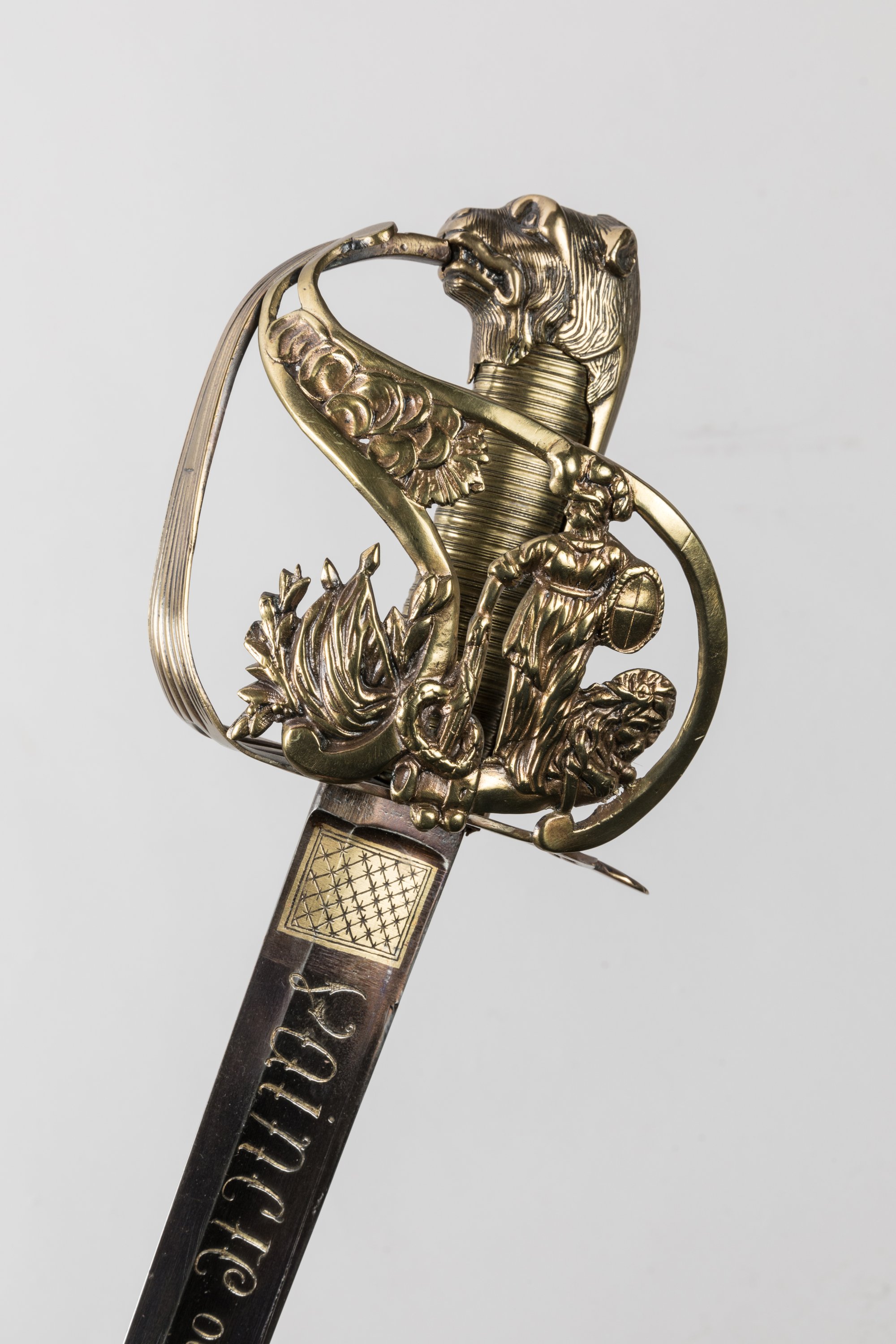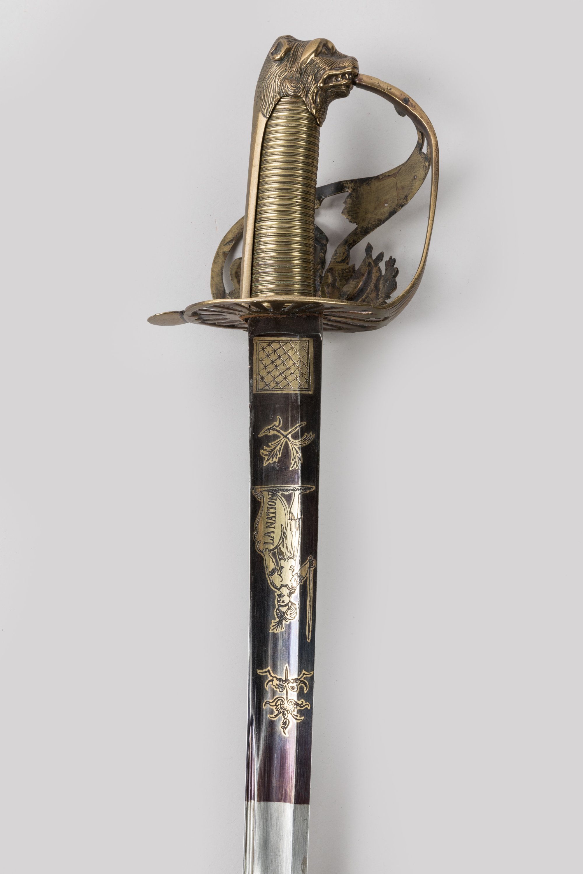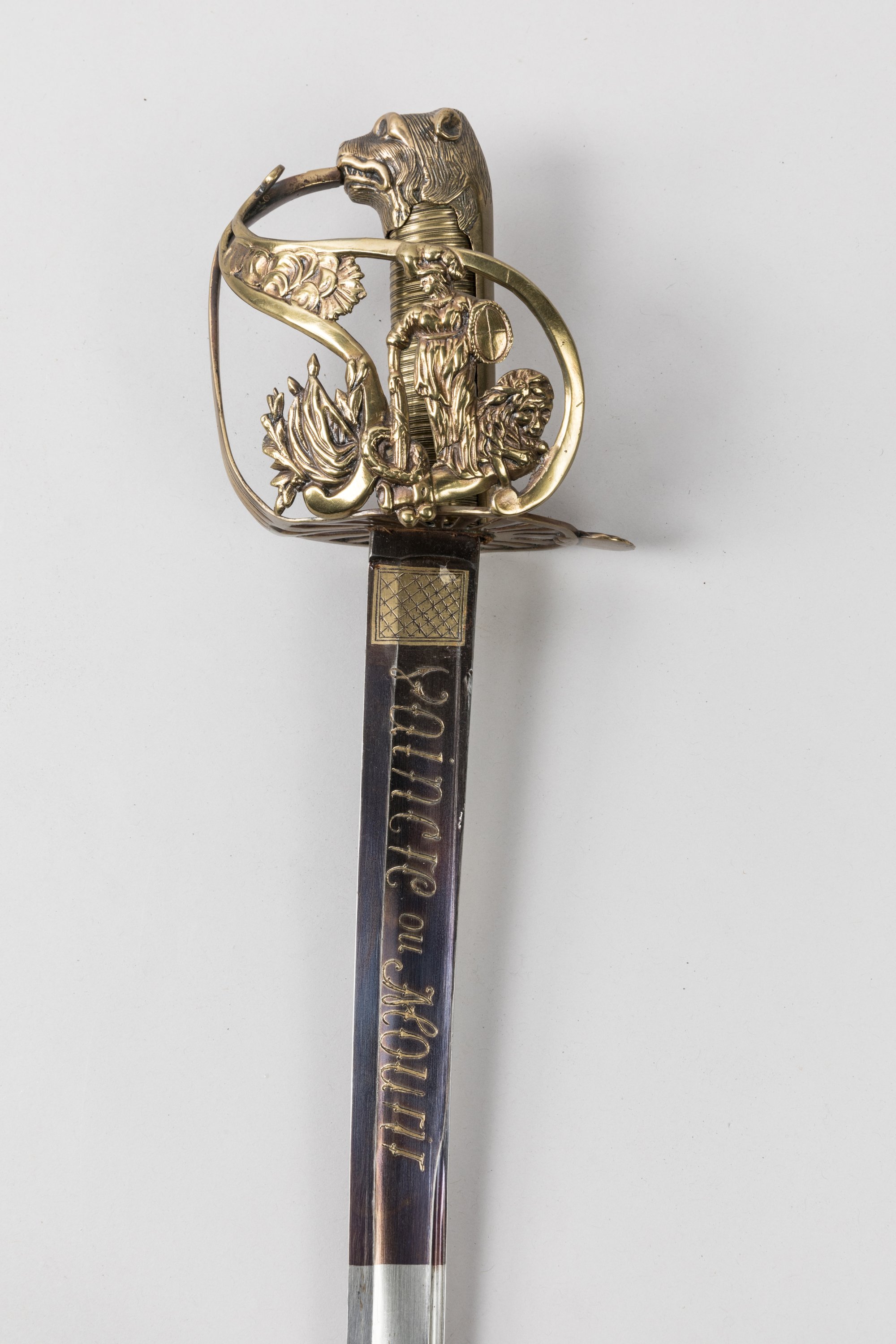 Calotte à longue queue à tête de lion. Poignée en laiton. Monture à coquille ajourée en laiton représentant une allégorie casquée debout sur un canon et tenant un faisceau de licteur. Belle lame courbe à dos plat, gouttière et contre-tranchant, dorée et bleuie au tiers, gravée sur une face « Vaincre ou mourir » et, sur l’autre face, d'un personnage tenant un écusson gravé « La Nation ». Fourreau en cuir à trois garnitures et attelles en laiton.