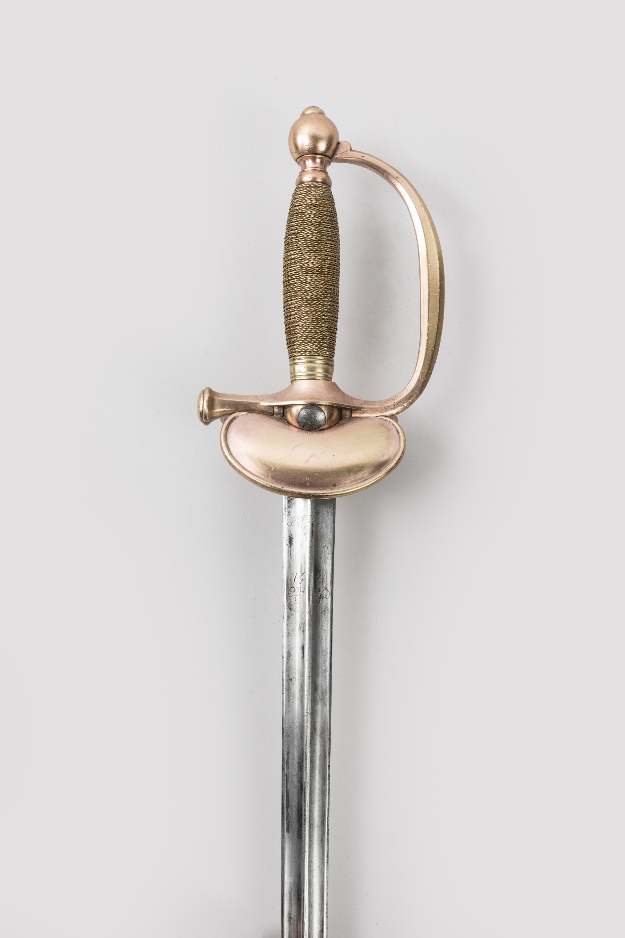 Fusée filigranée de laiton. Pommeau rond, branche de garde, clavier à la fleur de lys frappé « MANCEAUX », contre-clavier rabattable en laiton cuivré. Lame à arête médiane et doubles pans creux.