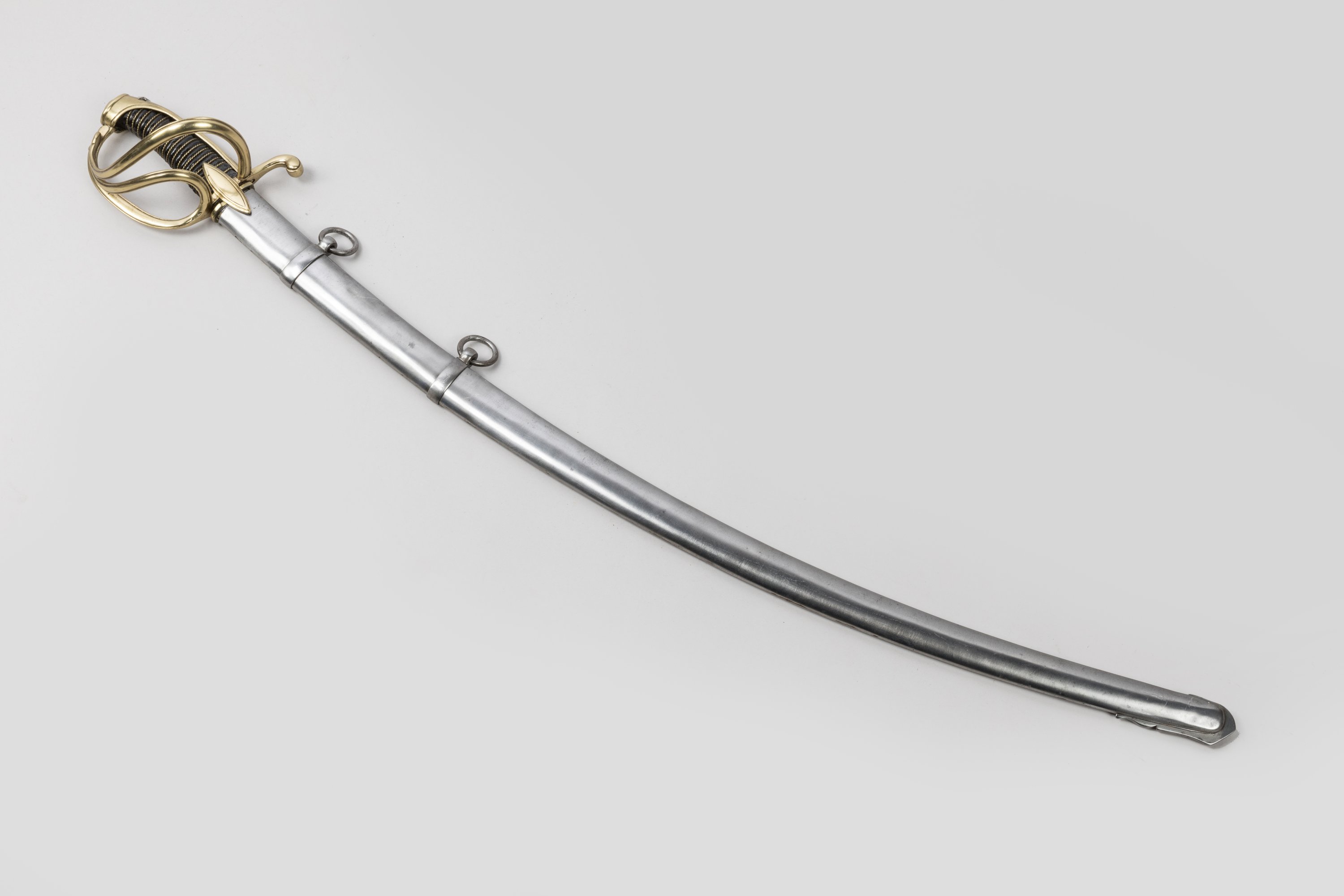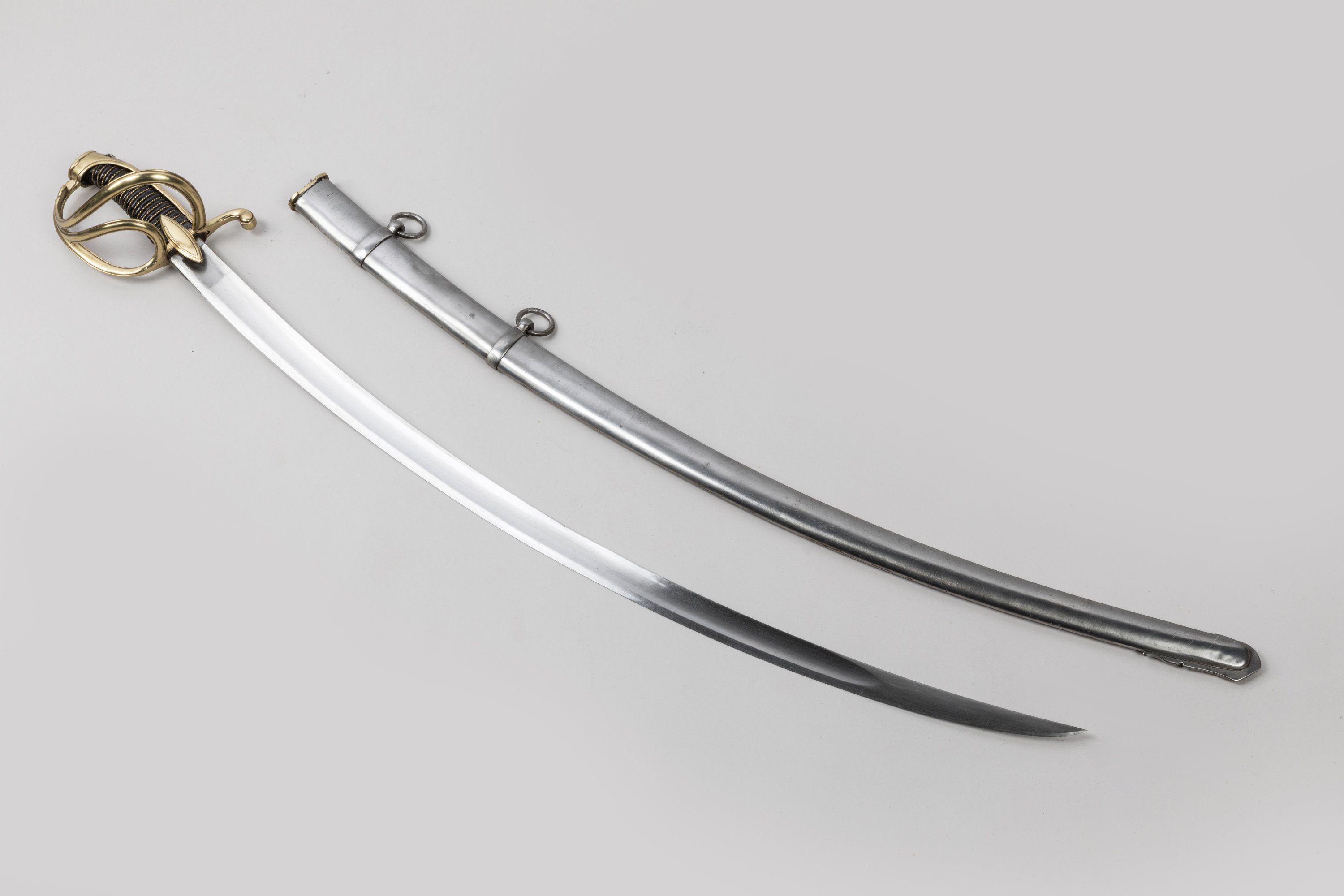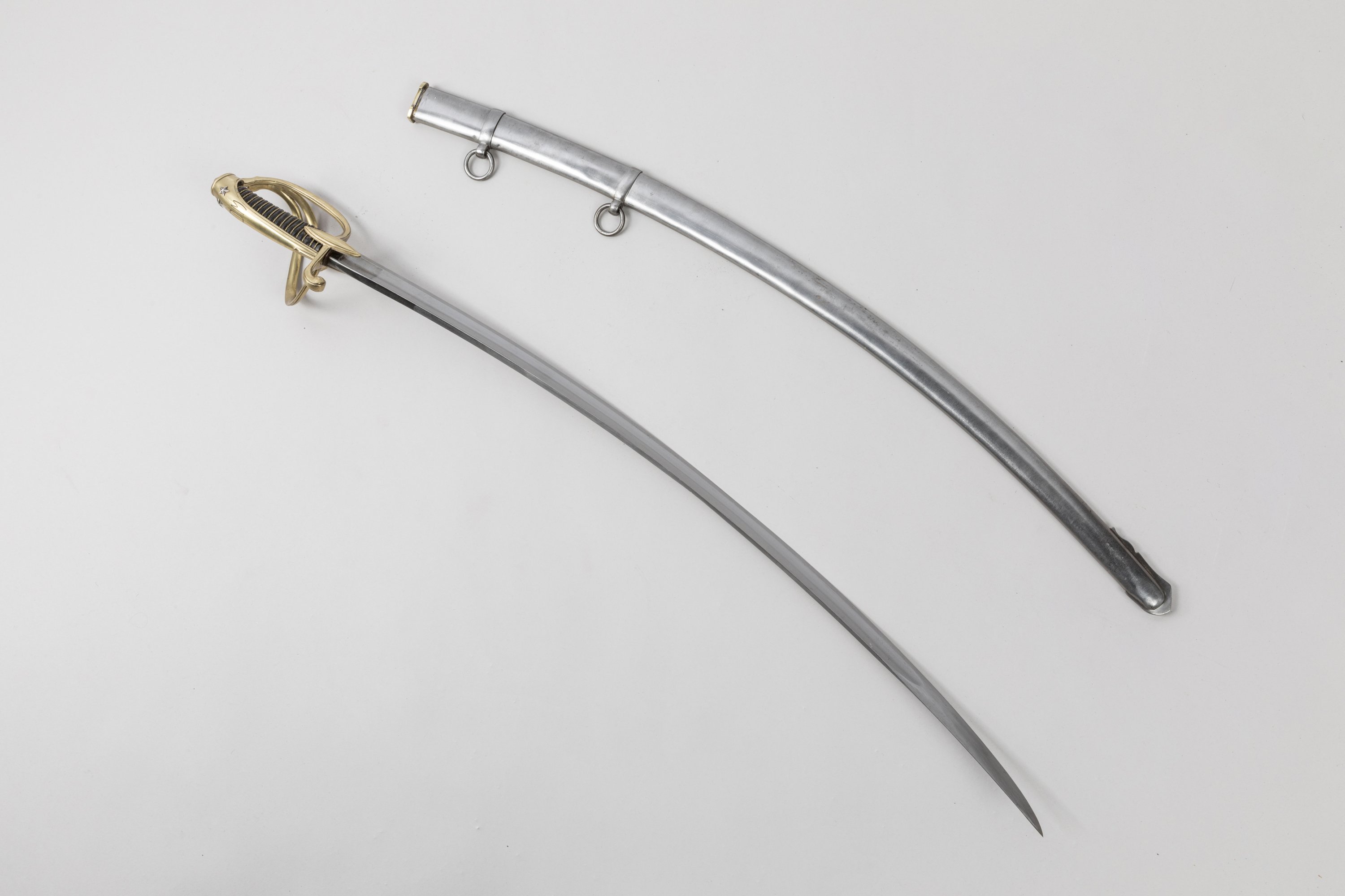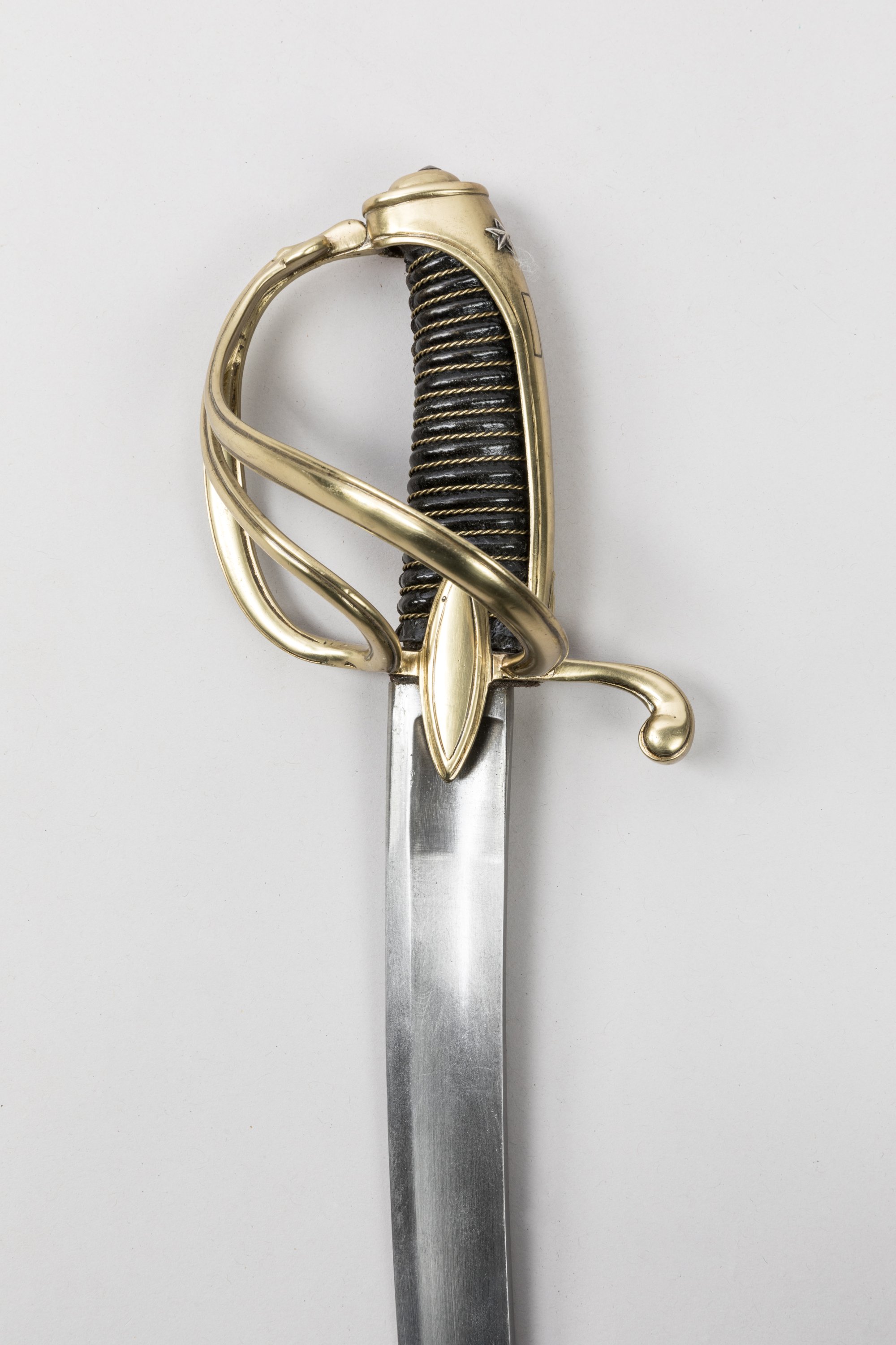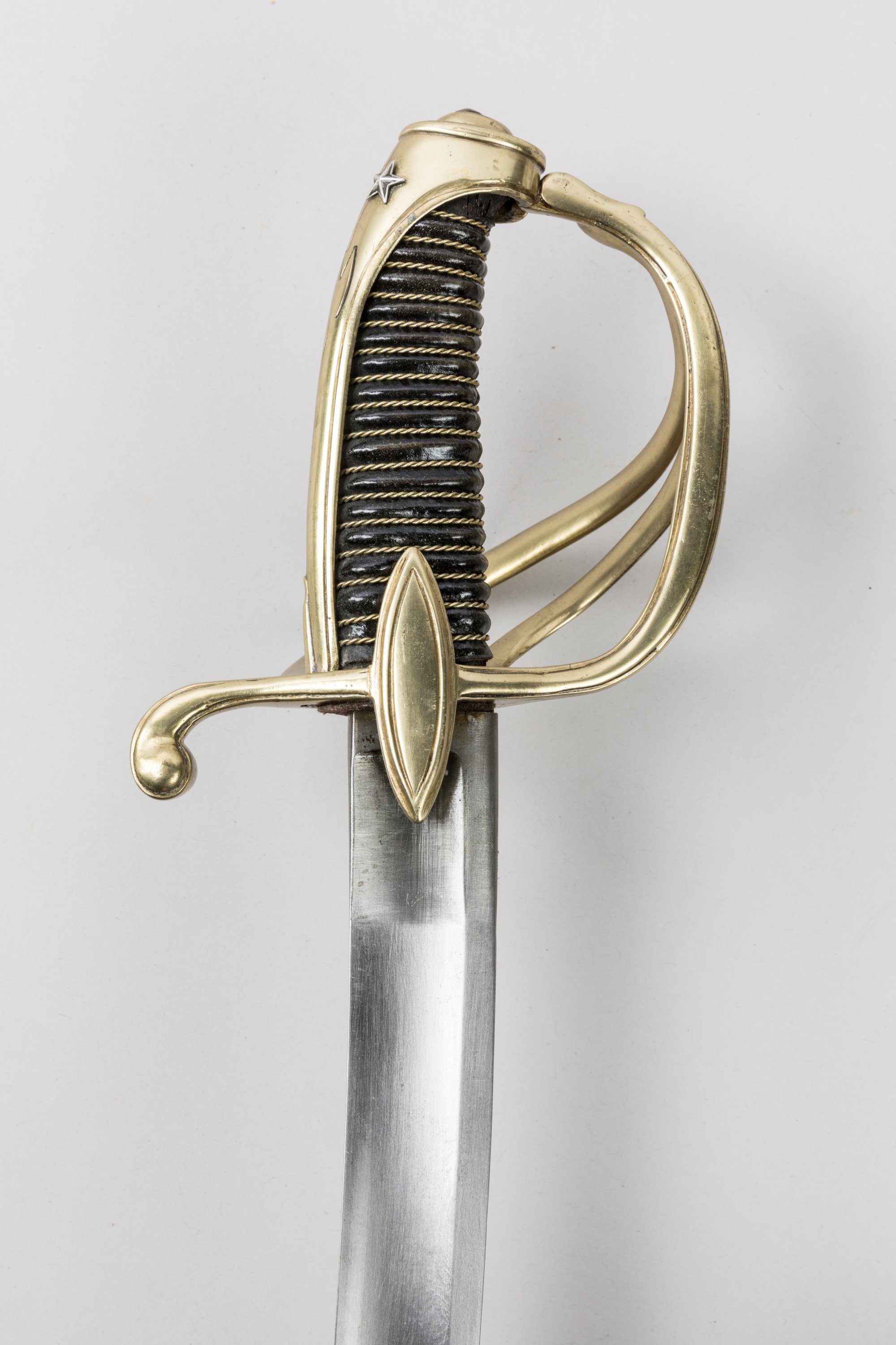 Poignée recouverte de cuir avec filigrane. Monture en laiton. Garde à trois branches et deux oreillons en navette. Calotte à longue queue gravée « D.M. » surmontée de deux étoiles en argent de général. Lame courbe à dos plat, contre-tranchant et pans creux. Fourreau acier à deux bracelets.