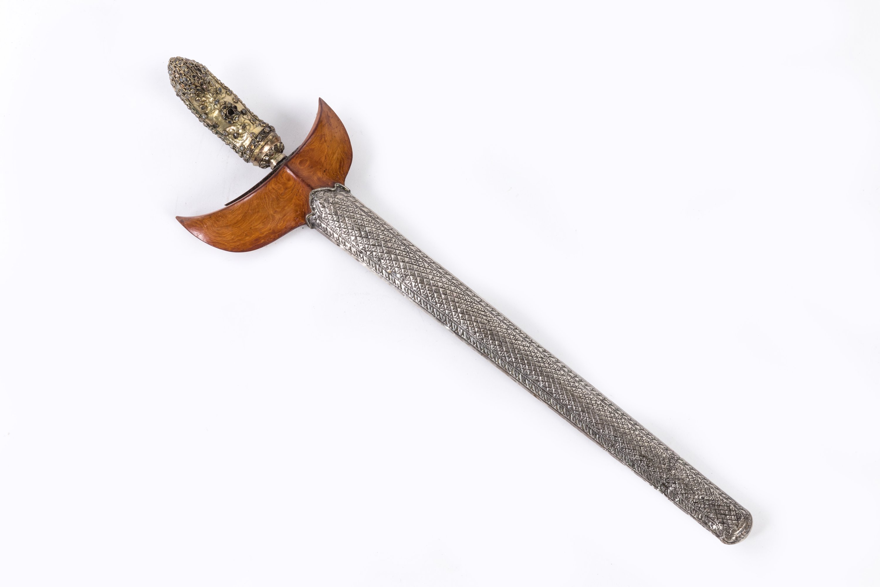 Poignée en vermeil parsemée de pierreries. Lame droite en acier pamor. Fourreau en bois recouvert de plaques d’argent à décor repoussé de rinceaux feuillagés.