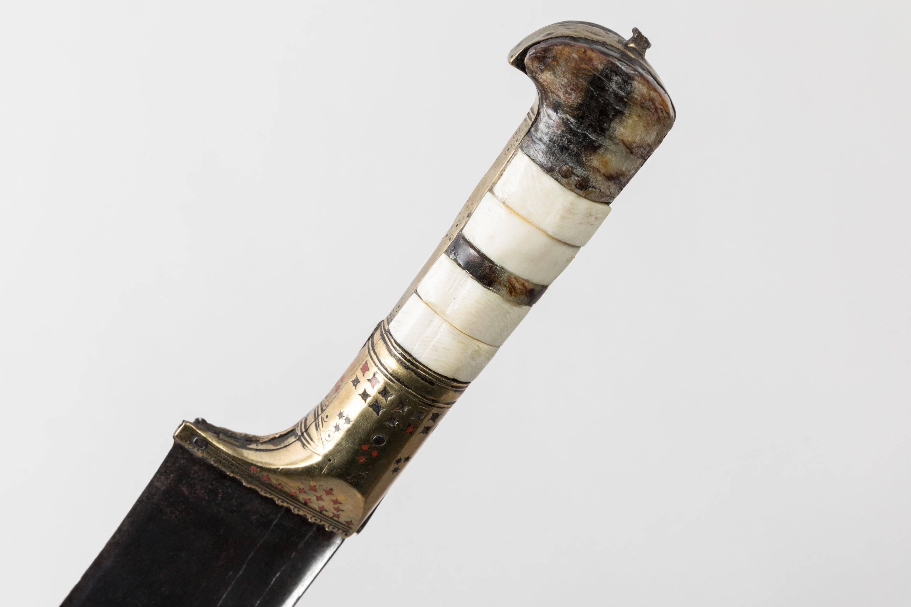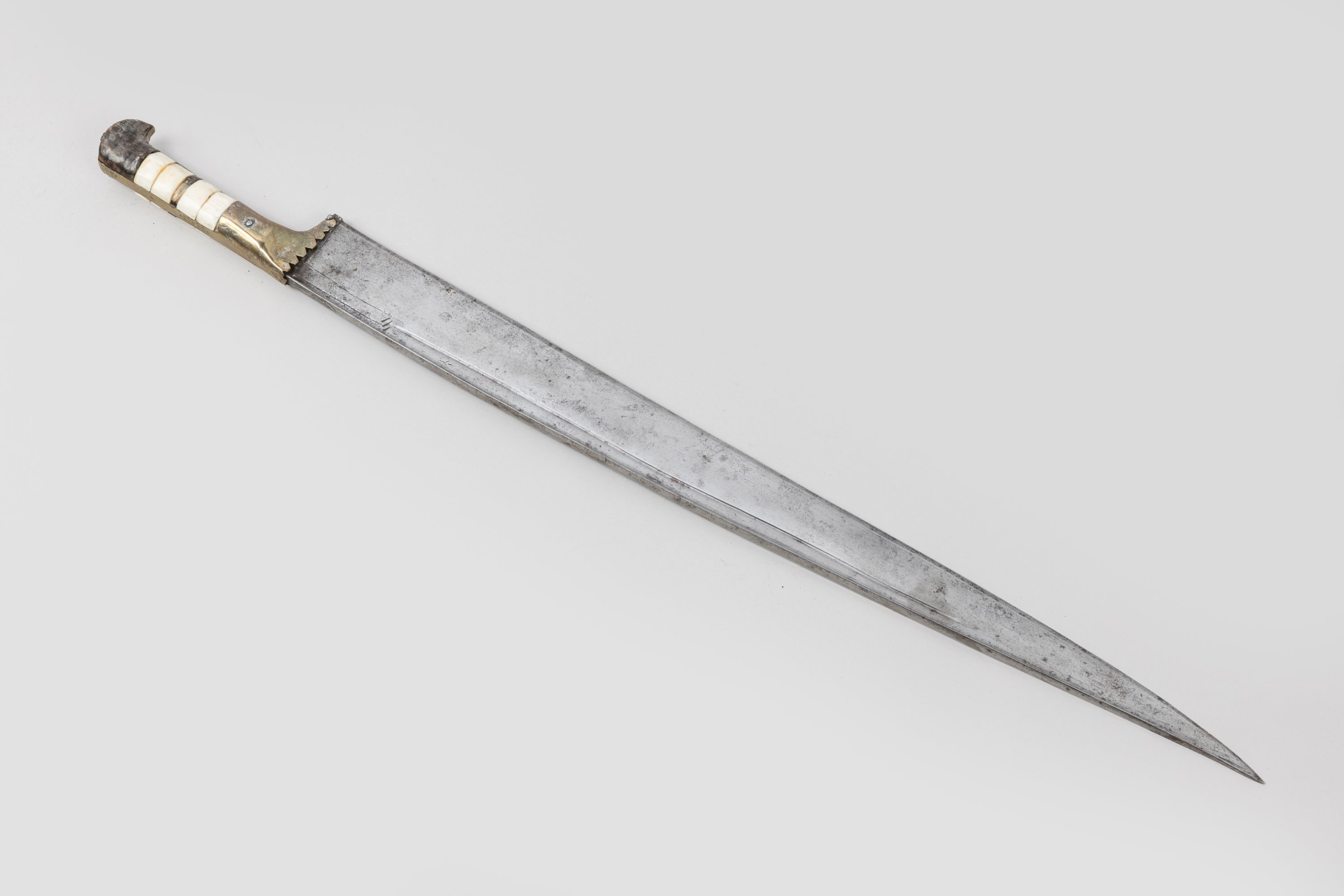 Poignée à plaquettes d’os et de corne. Monture en laiton décoré. Large lame à dos arrondi et gouttière.