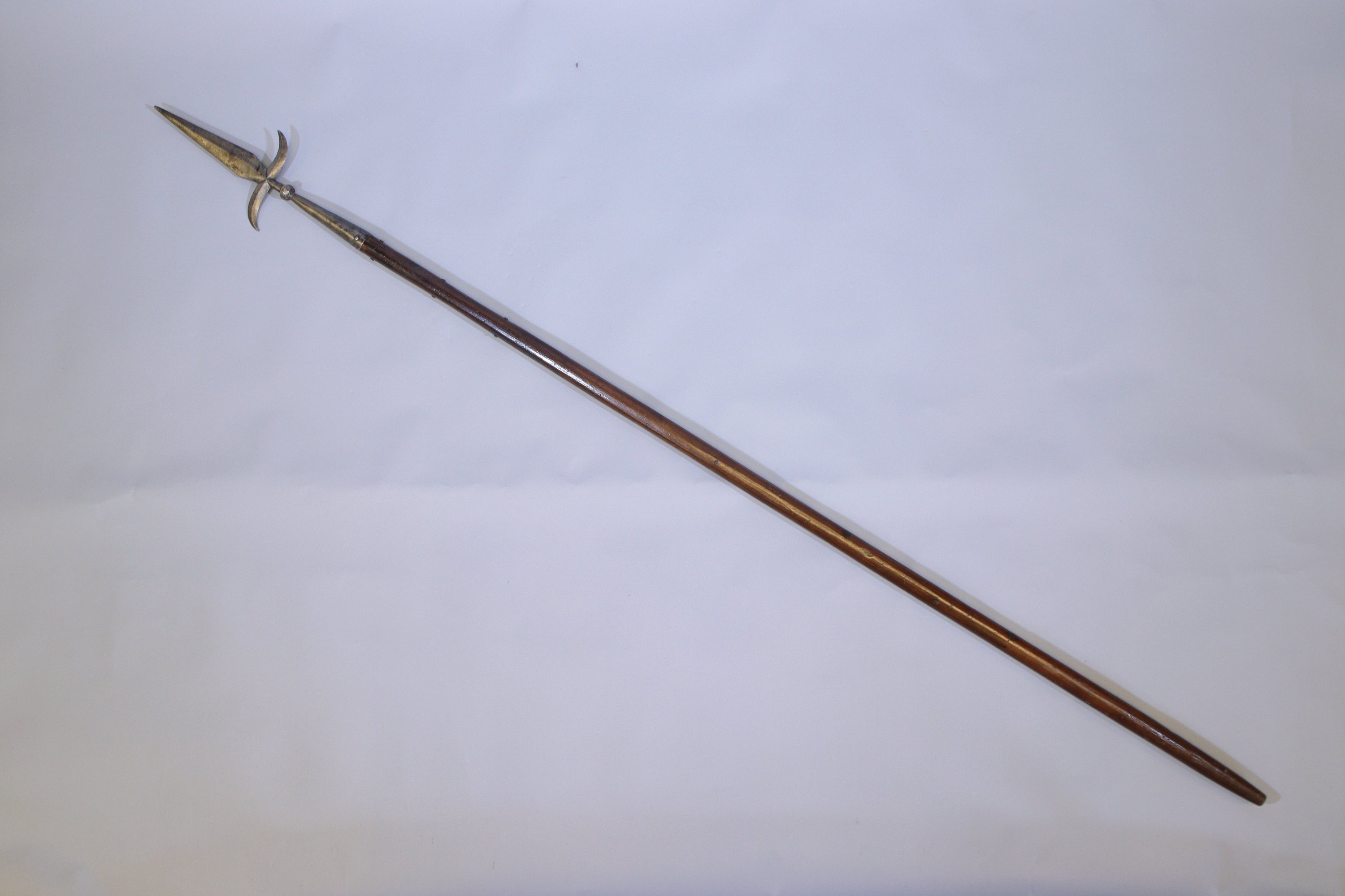 Fer en fer forgé à arête médiane et à deux quillons à arête médiane. En « S » inversé avec deux attelles. Sur douille ronde à boule prolongée de deux longues attelles. Sur hampe postérieure.