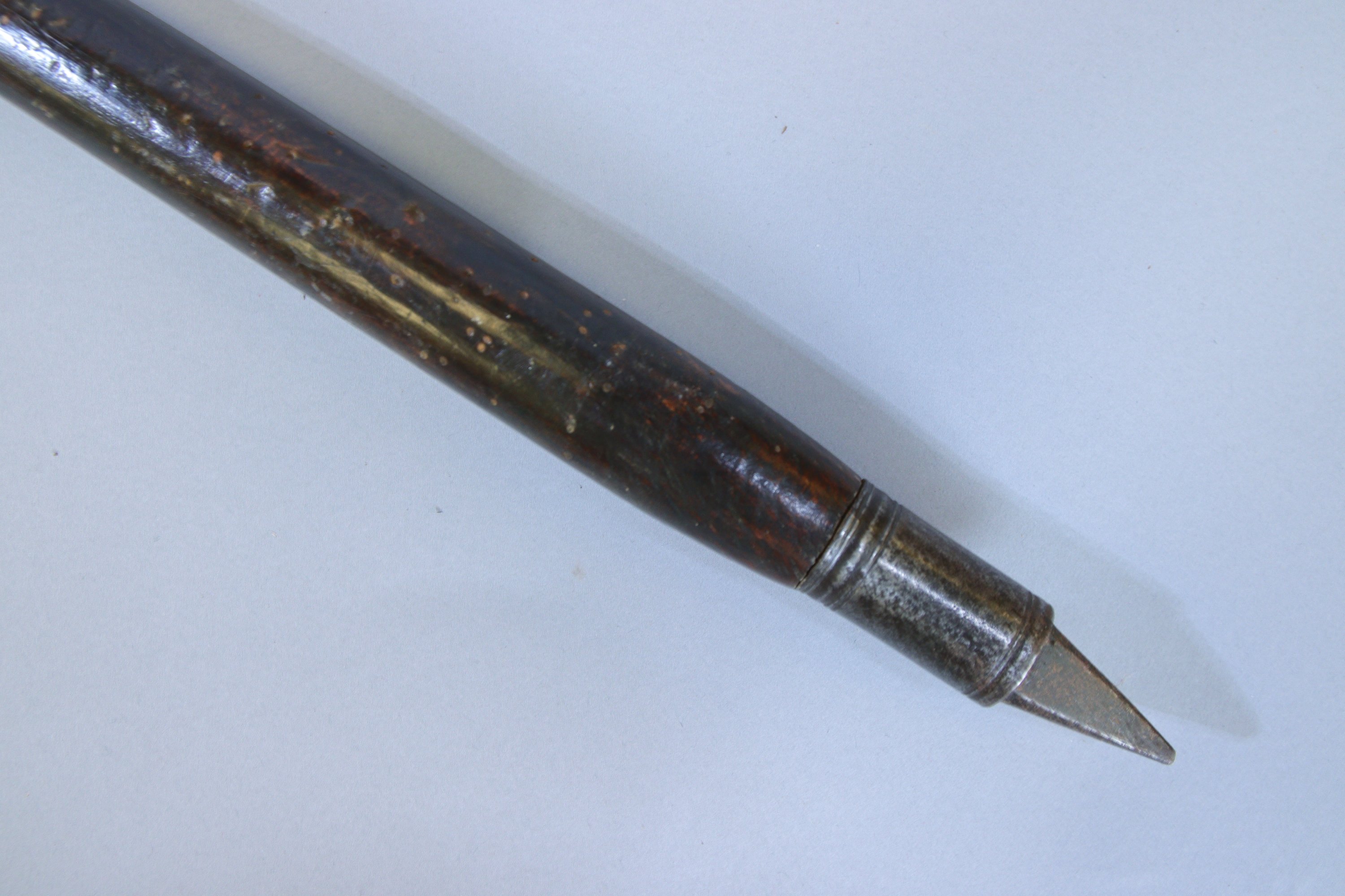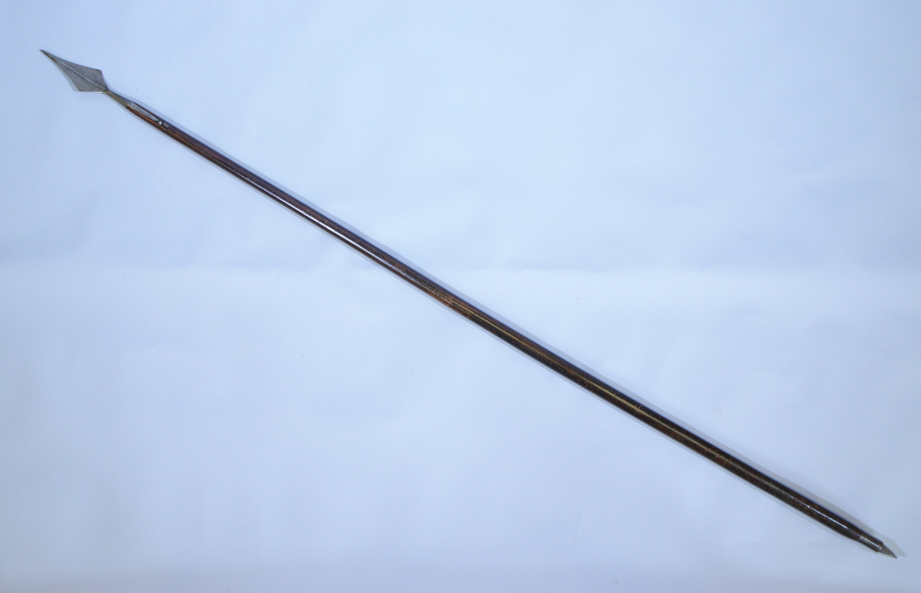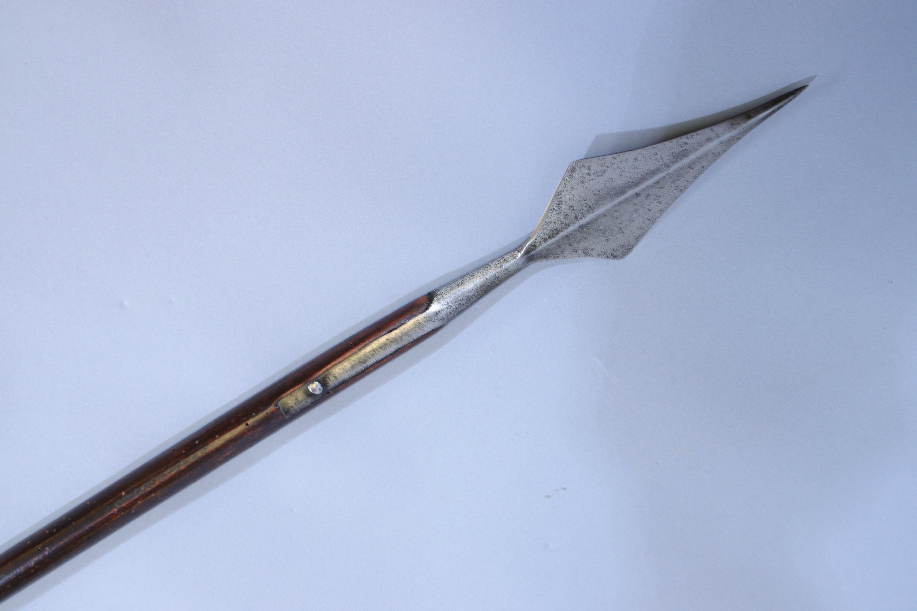 Large et court fer en forme de losange à arête centrale. Sur douille ronde à deux courtes attelles. Hampe et sabot d'époque.