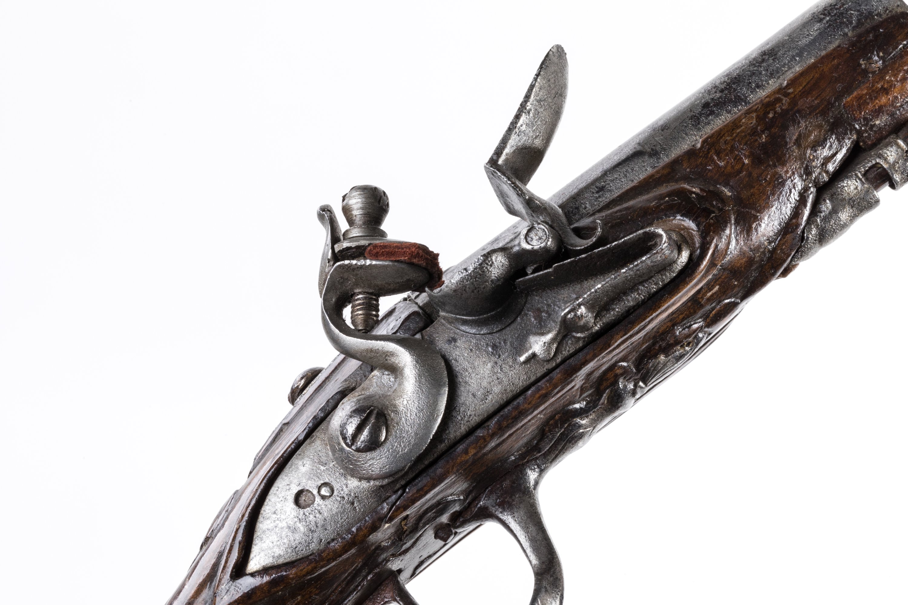 Canon rond à méplats au tonnerre. Platine et chien col de cygne à corps rond. Garnitures en fer découpé gravé. Crosse en noyer, en partie sculptée. Baguette en bois.