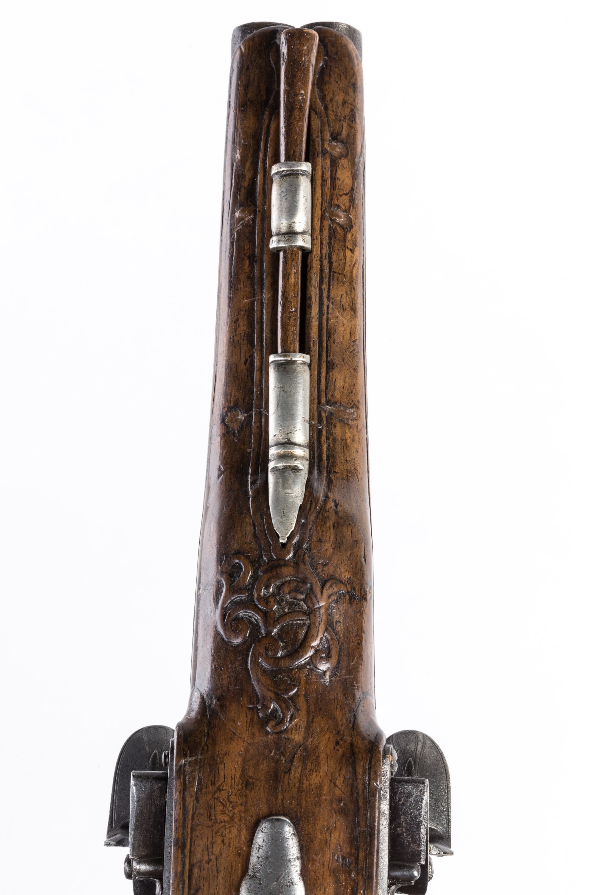 Canons en table à méplats aux tonnerres avec restes de décor à l’or. Monture à fût long, en partie sculpté. Platines signées « COUTURIER », chiens col de cygne à corps plat. Bassinets à pans. Garnitures en fer et métal blanc découpé. Crosse en noyer.
