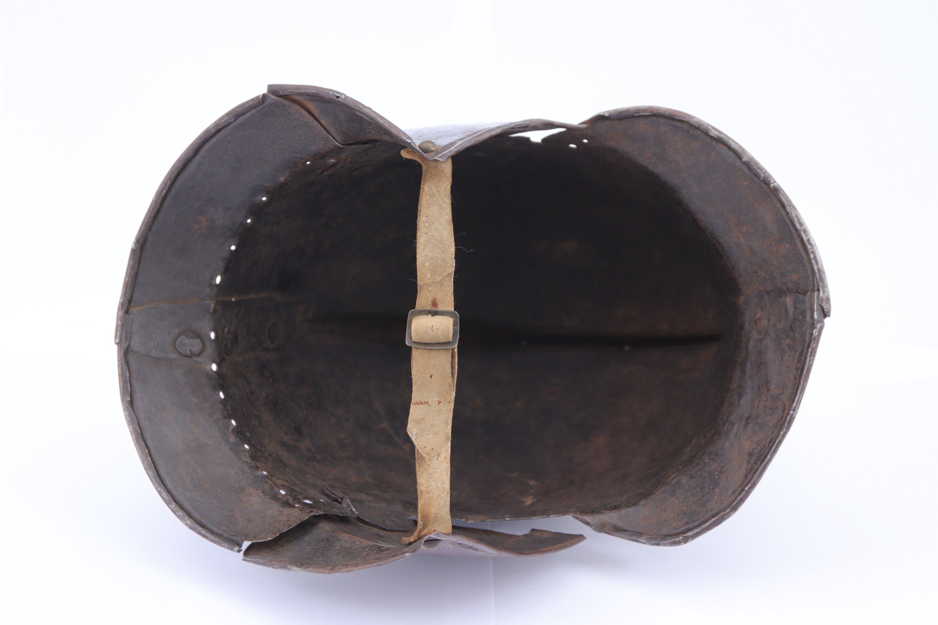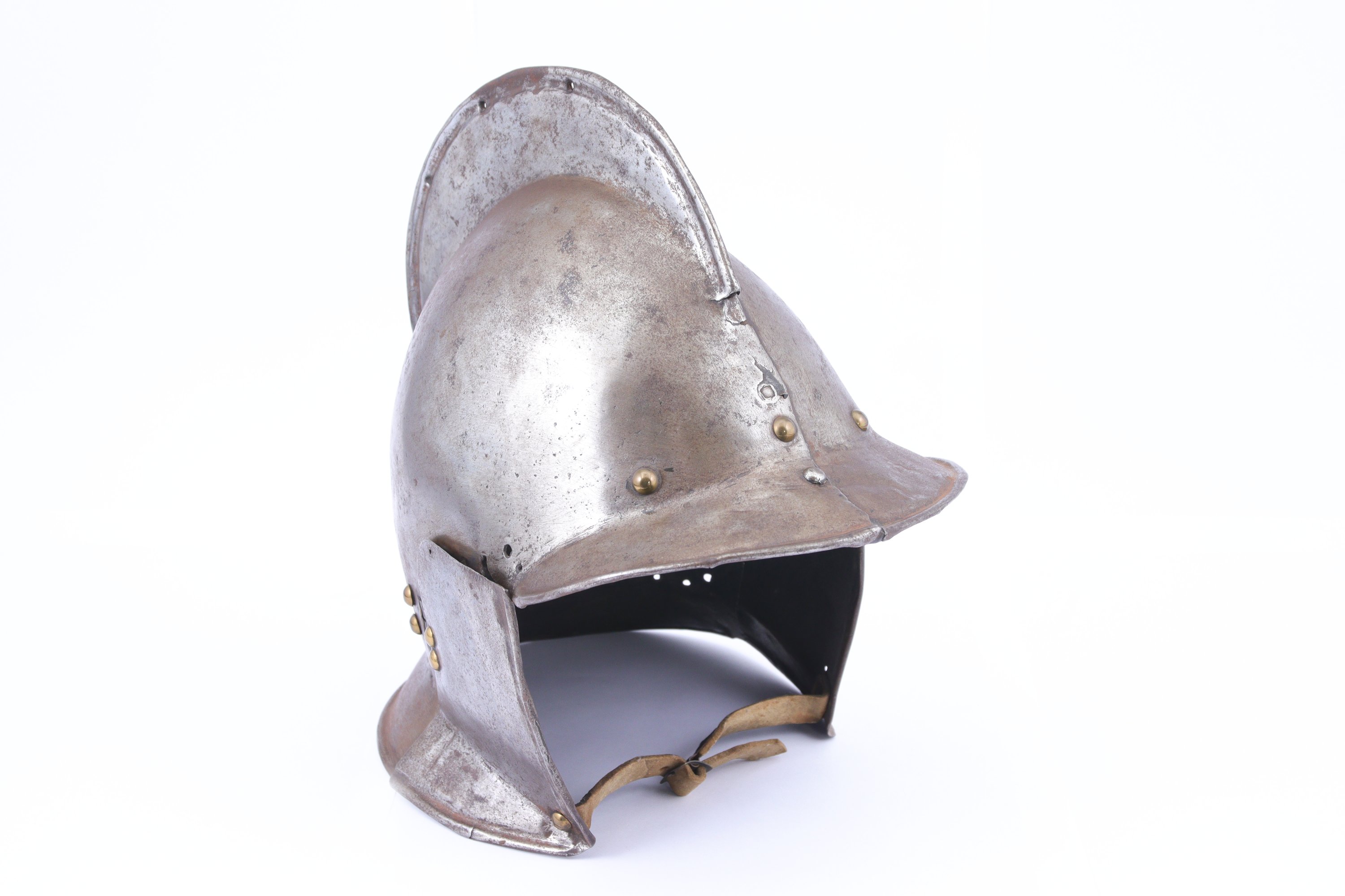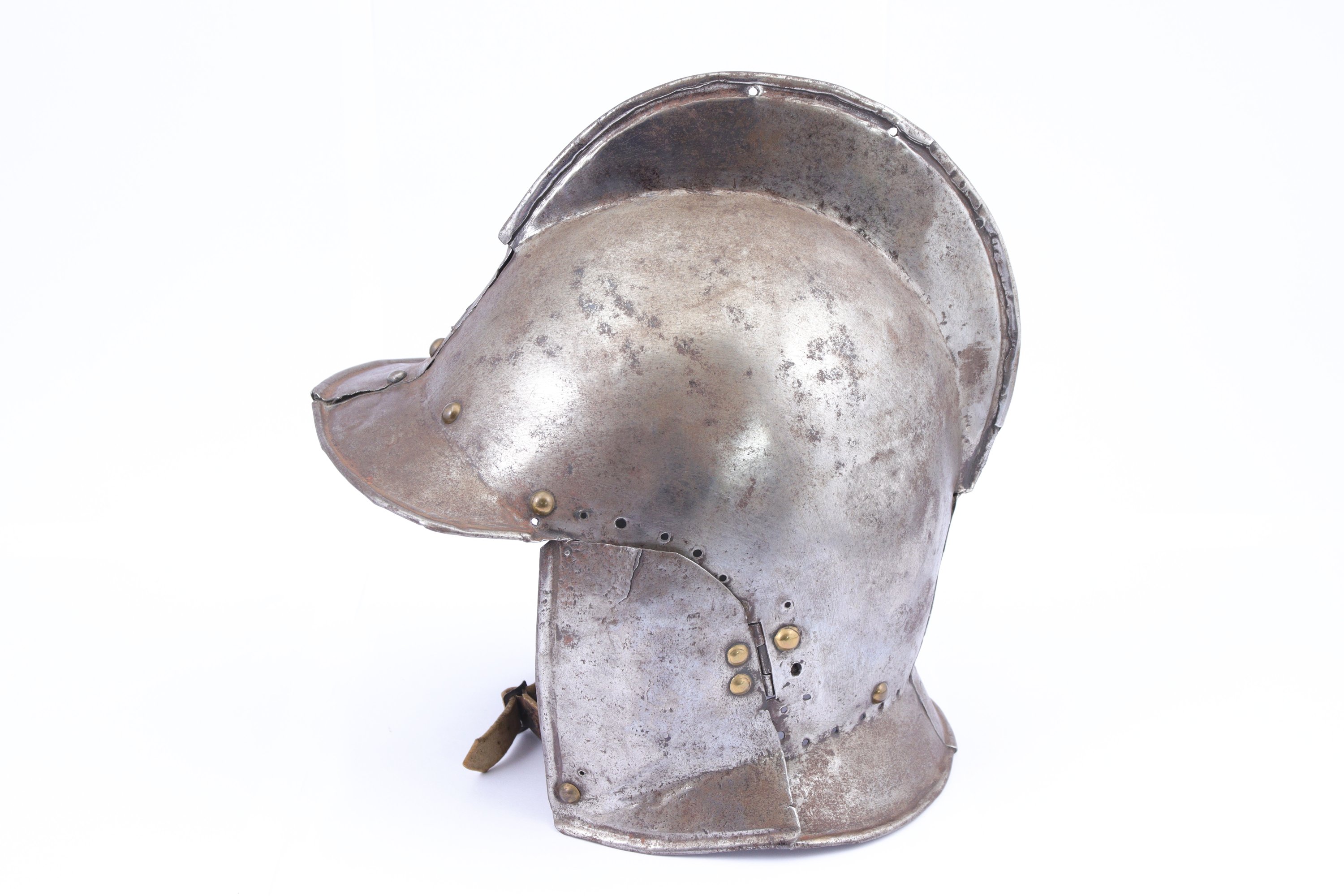 Petite visière et nuquière à bords ourlés, joues mobiles garnies de petits clous de laiton.