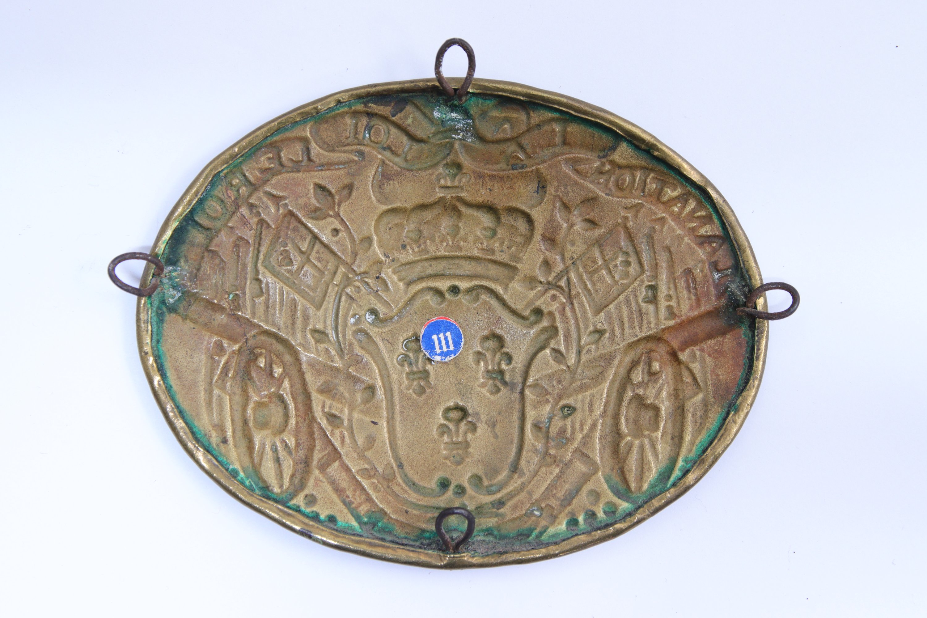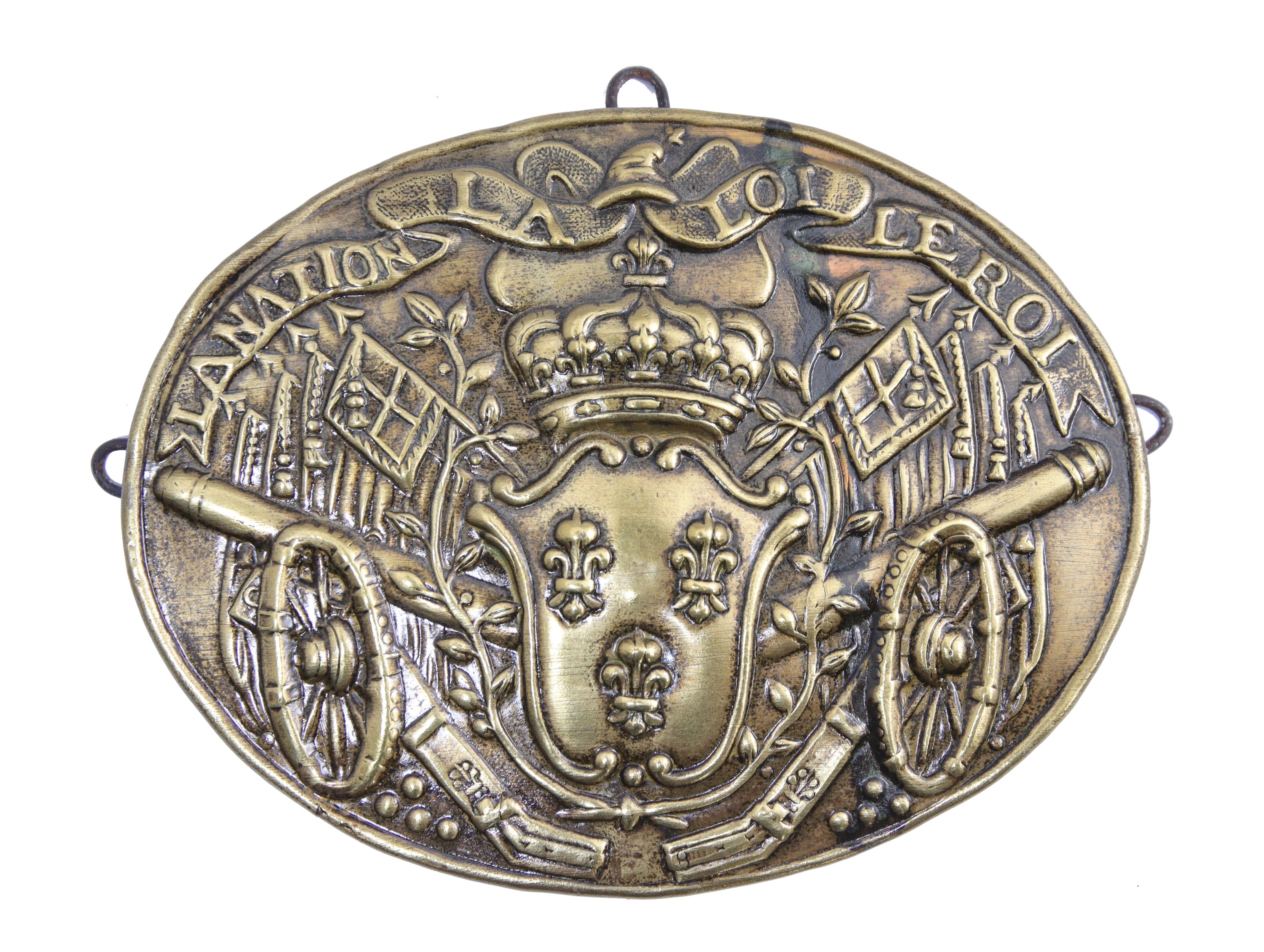 Ovale, en laiton estampé et verni, à décor des armes de France, drapeaux, canons et la devise « LA NATION, LA LOI, LE ROI ». Revers à quatre pattes d’attache.