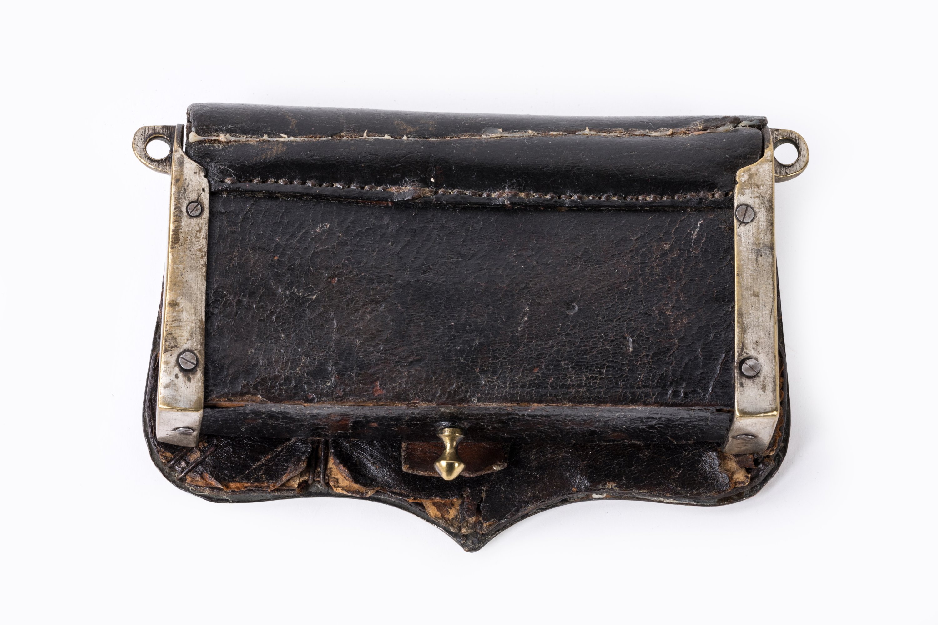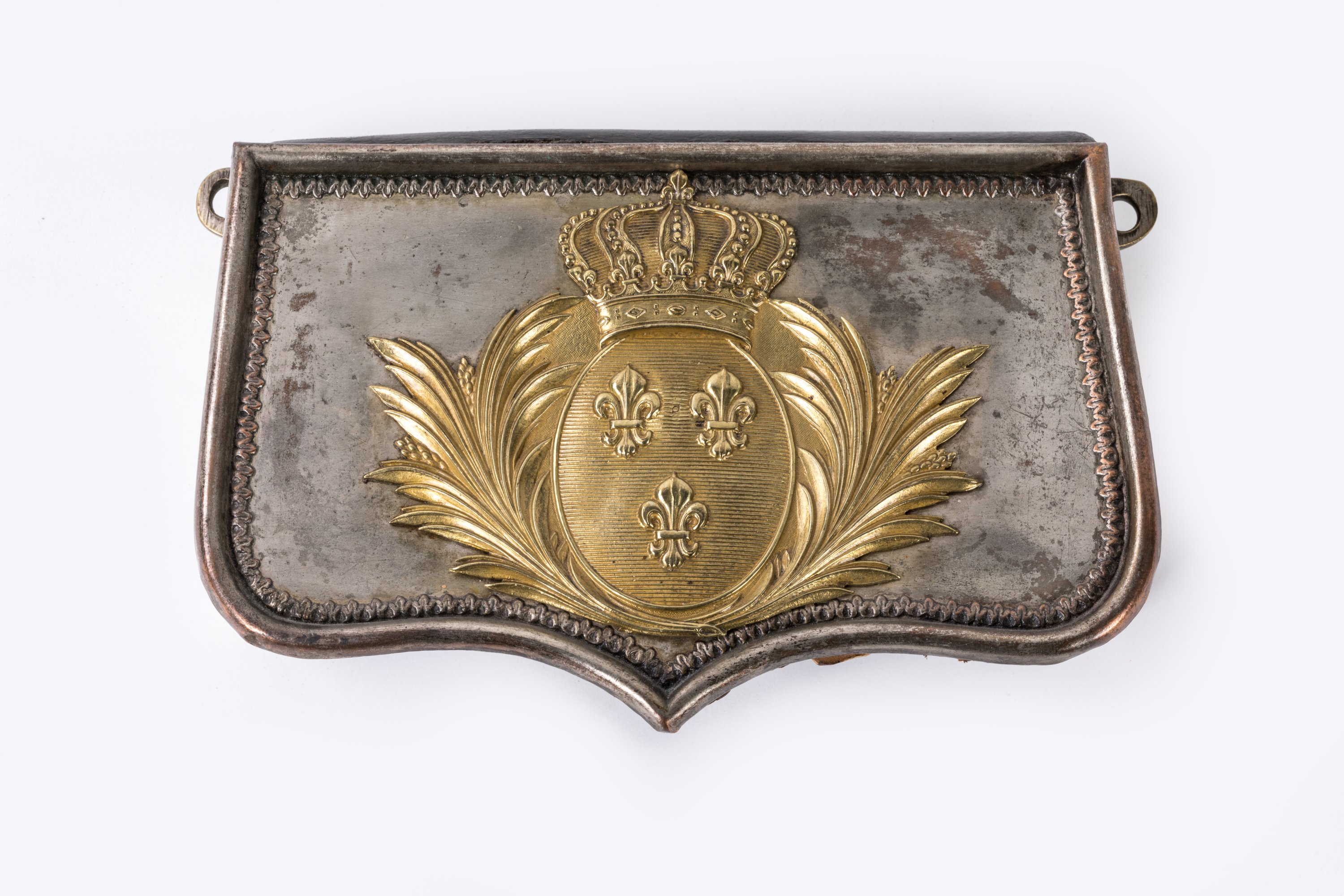 en cuir noir. Patelette en cuivre argenté, bordée d'un demi-jonc ciselé et ornée, au centre, d'un motif doré représentant les grandes Armes de France entourées de laurier.