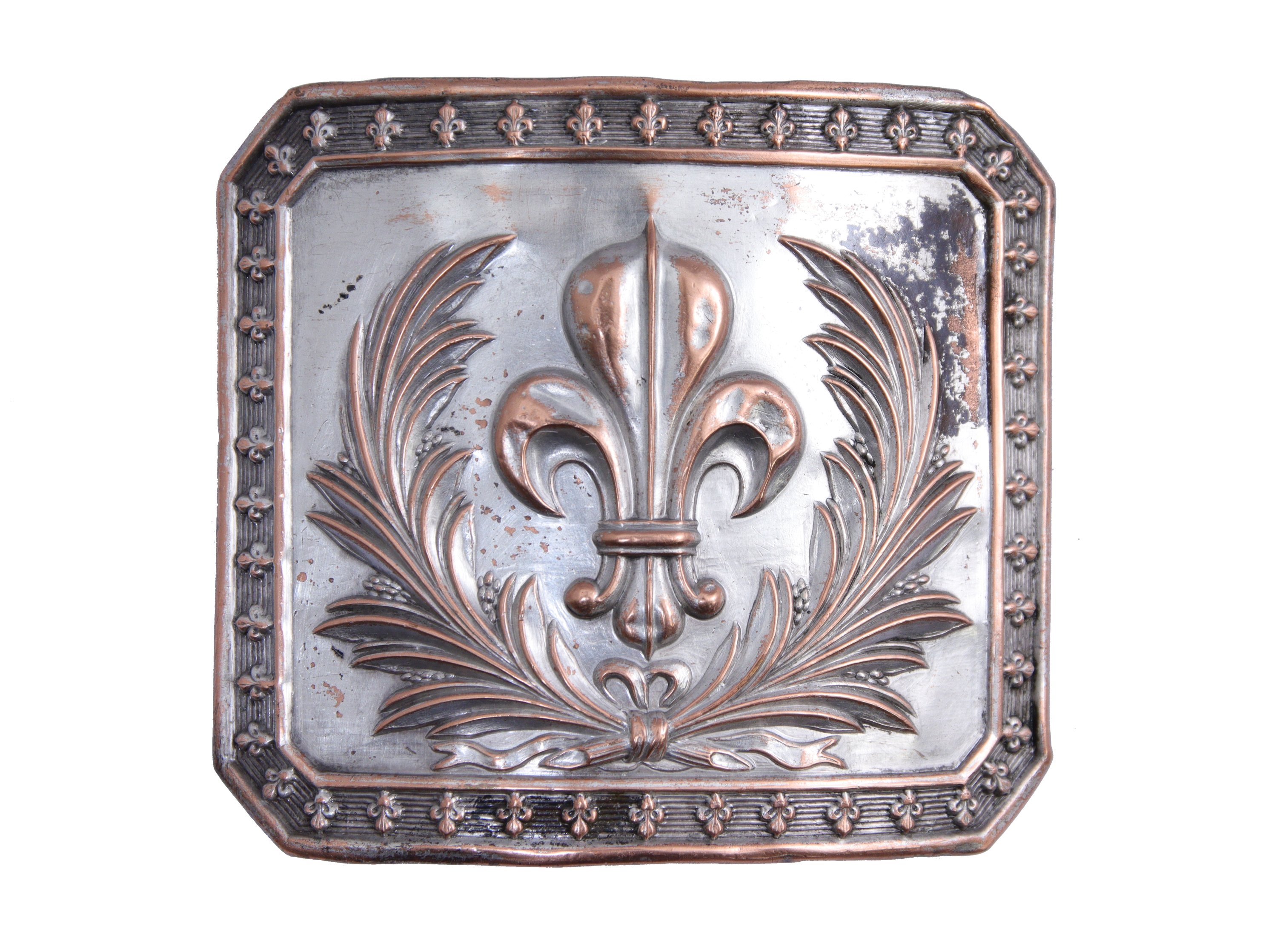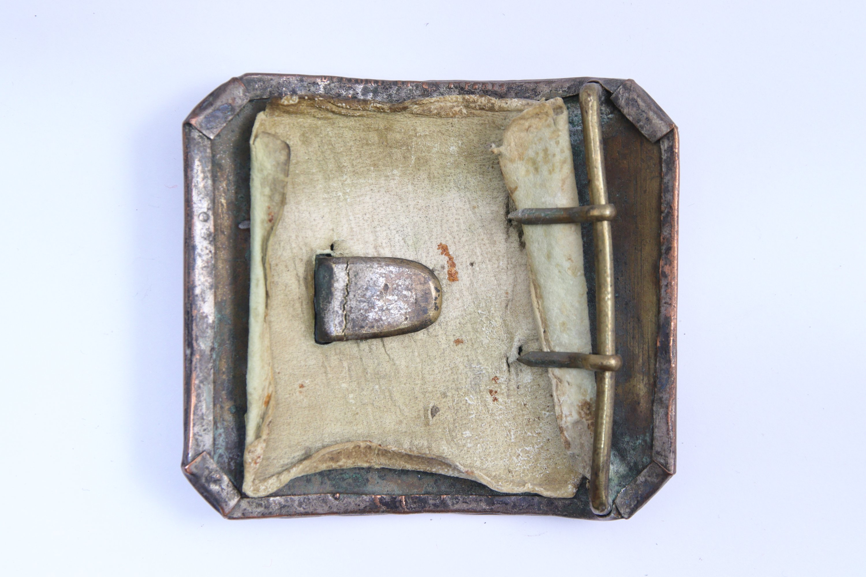 en cuivre estampé à décor de fleurs de lys dans des palmes. Revers doublé de peau à crochet, pontet et deux ardillons mobiles.