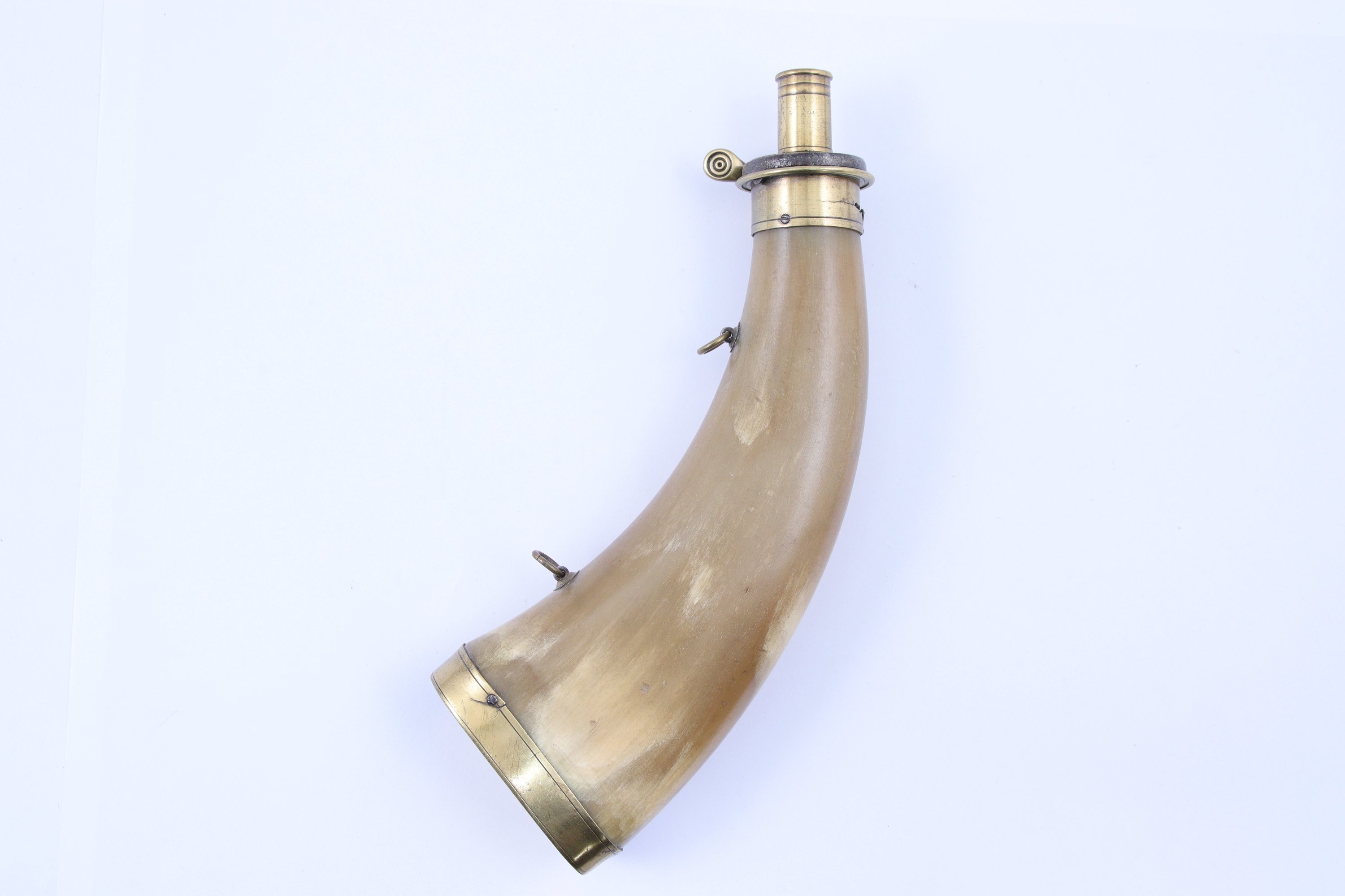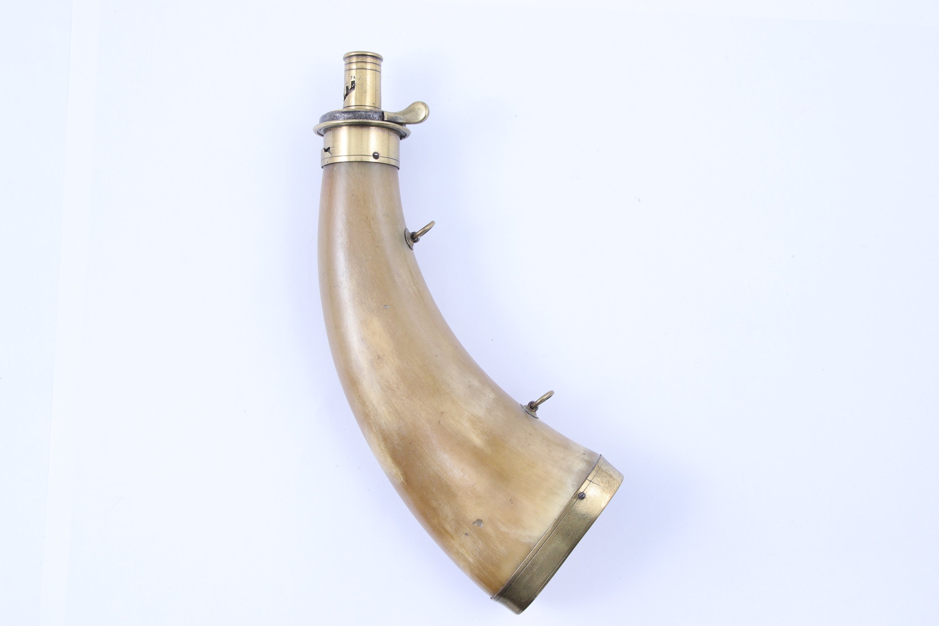 en corne claire, à deux anneaux de suspente. Bec doseur en laiton.