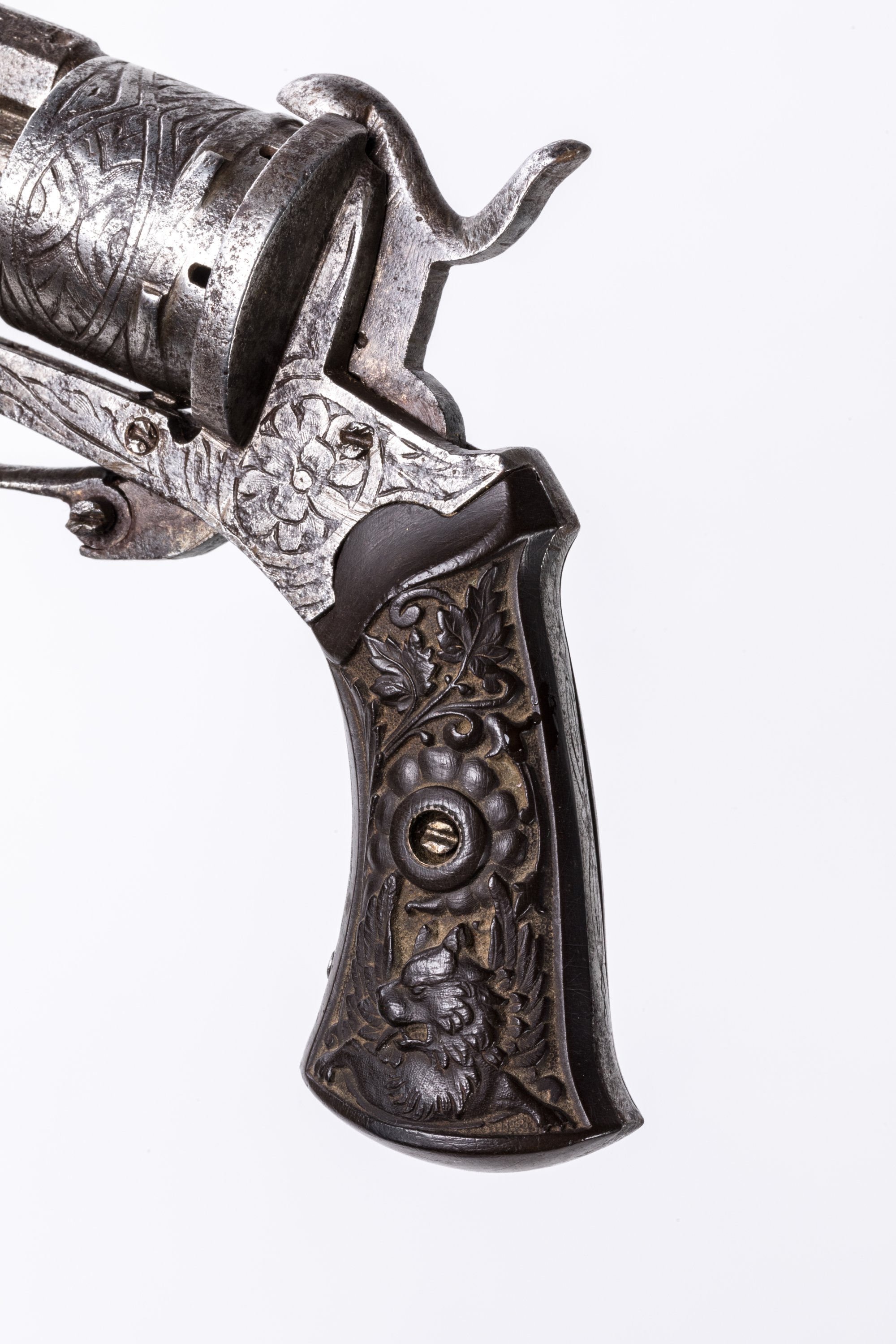 six coups, calibre 7 mm, à décor gravé sur le barillet de fleurs. La crosse à décor en bas-relief de griffon.