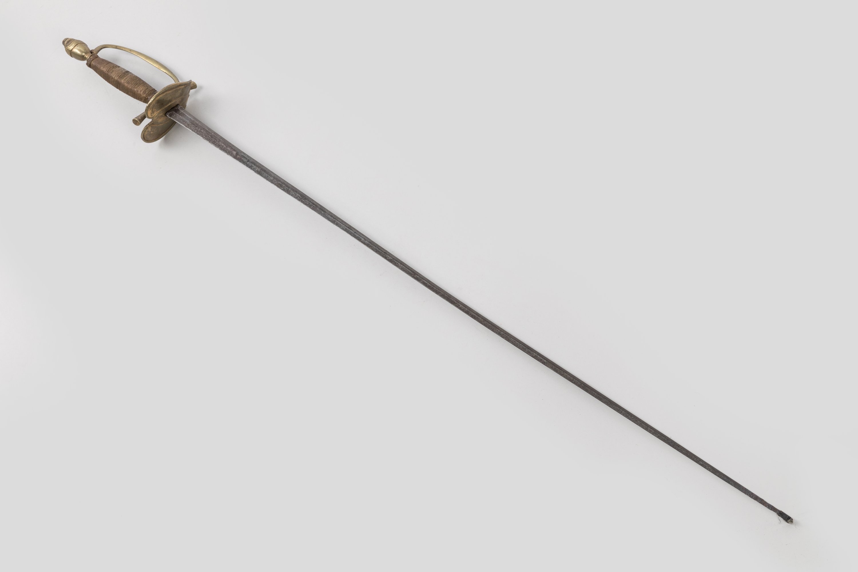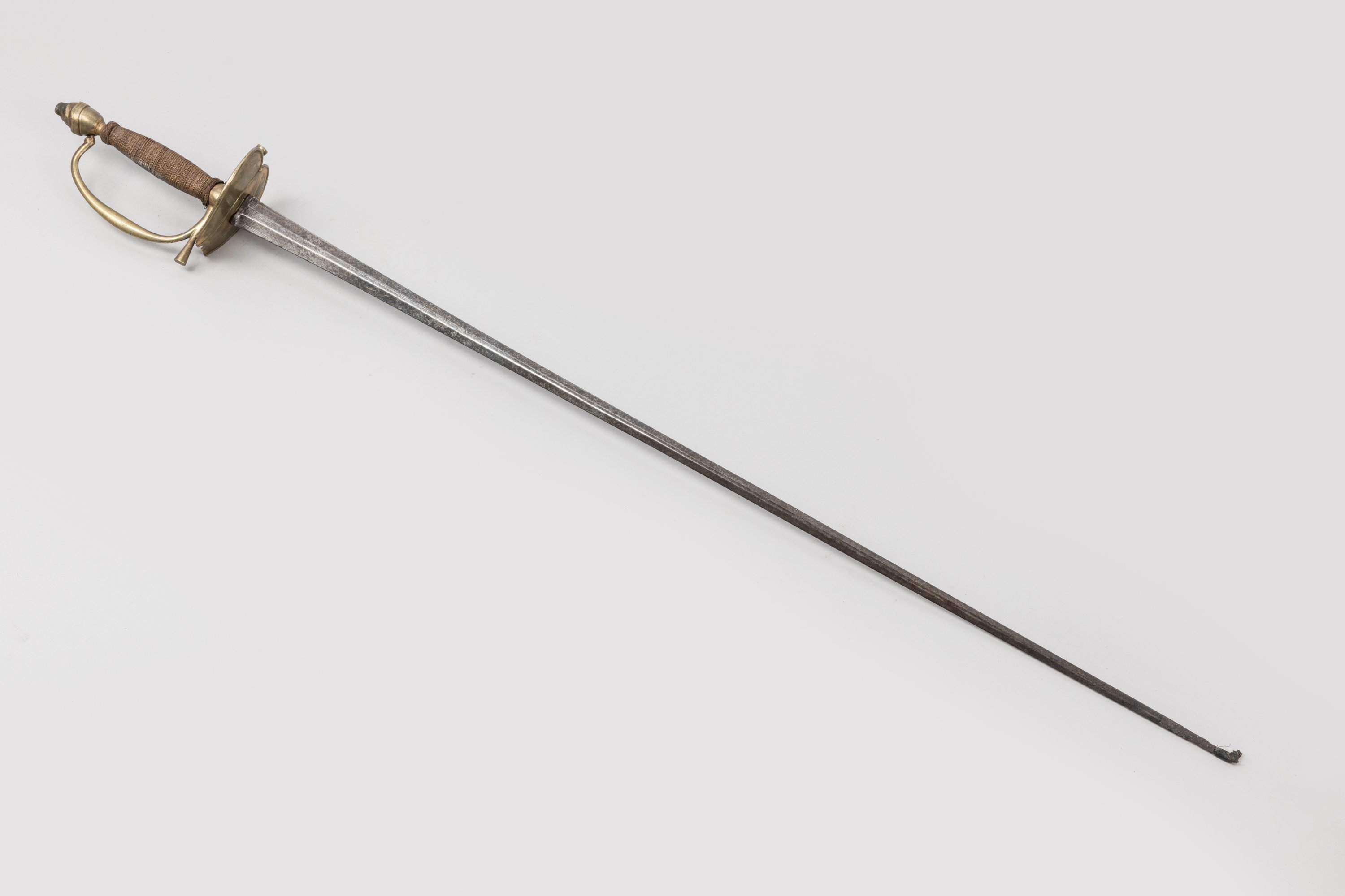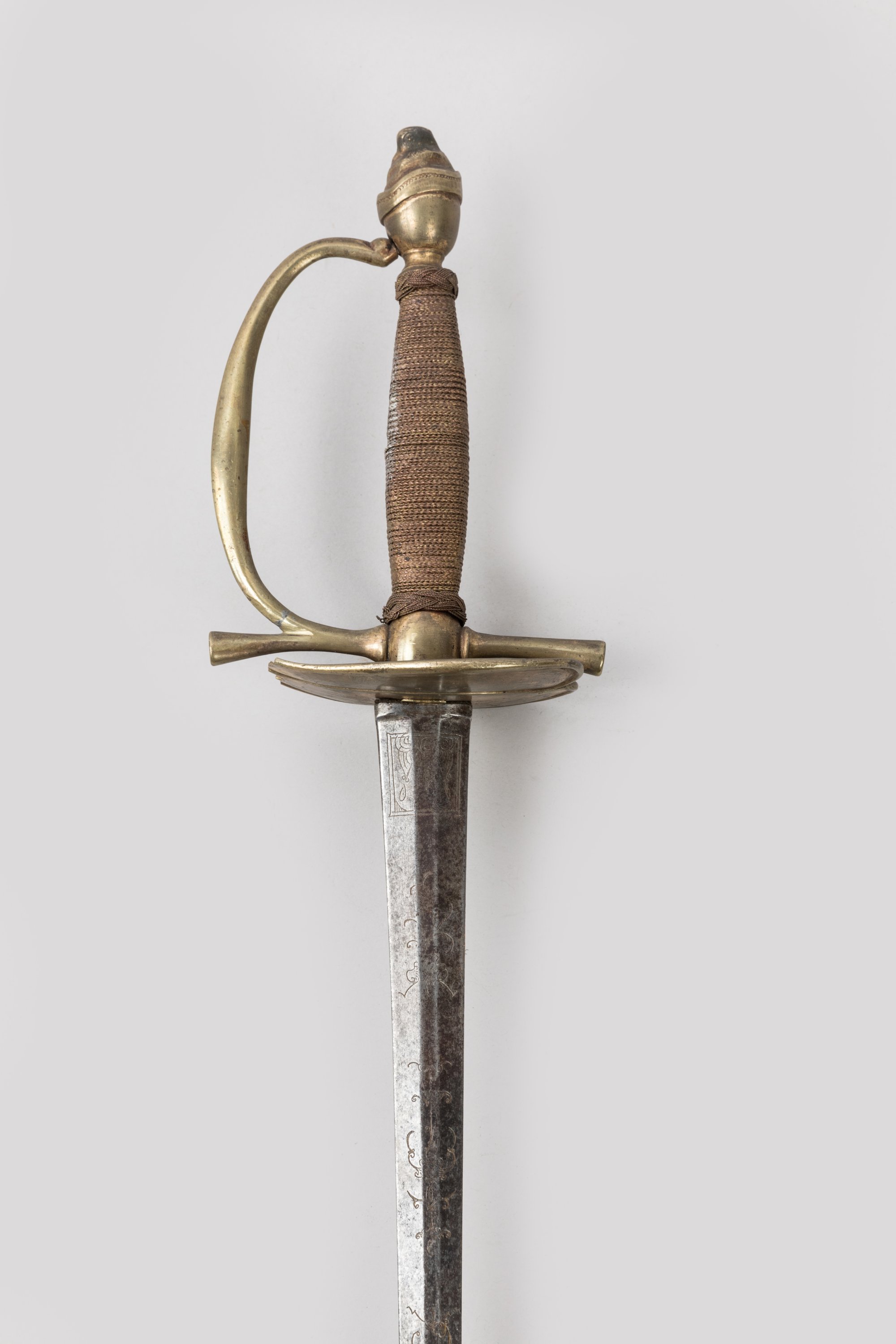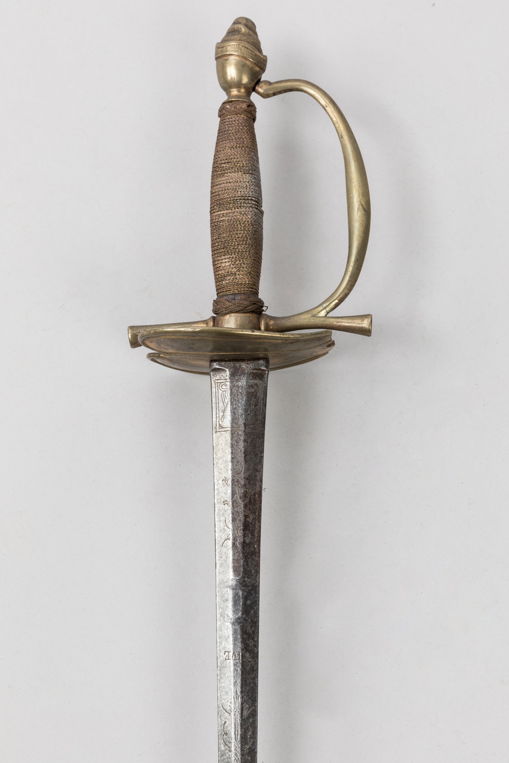 Fusée filigranée. Monture en laiton, pommeau au bonnet phrygien, garde à une branche, coquille bivalve accidentée. Lame à méplat médian, gravée « VIVE LE ROI ».