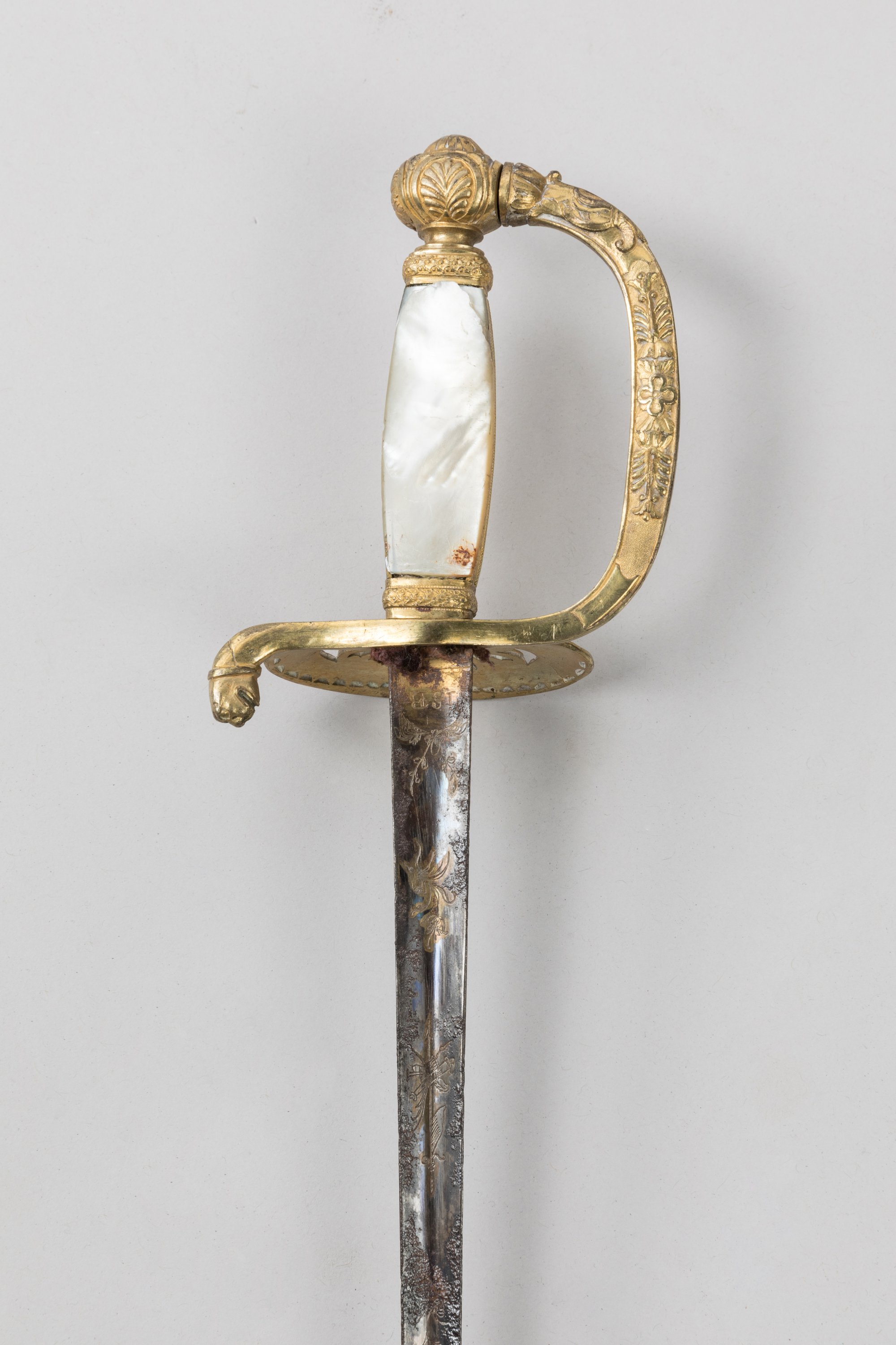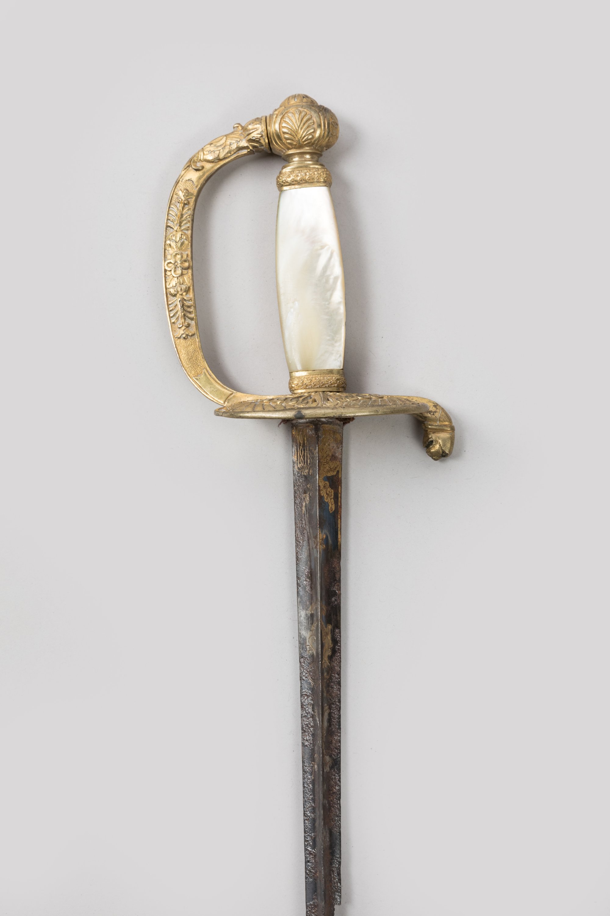 Fusée à plaquettes de nacre (accident et réparation à l'une). Monture en laiton doré, pommeau à palmettes, garde à une branche, clavier ajourée à la palmette. Lame triangulaire de Solingen avec restes de gravure de bleu et d’or.